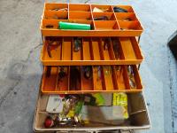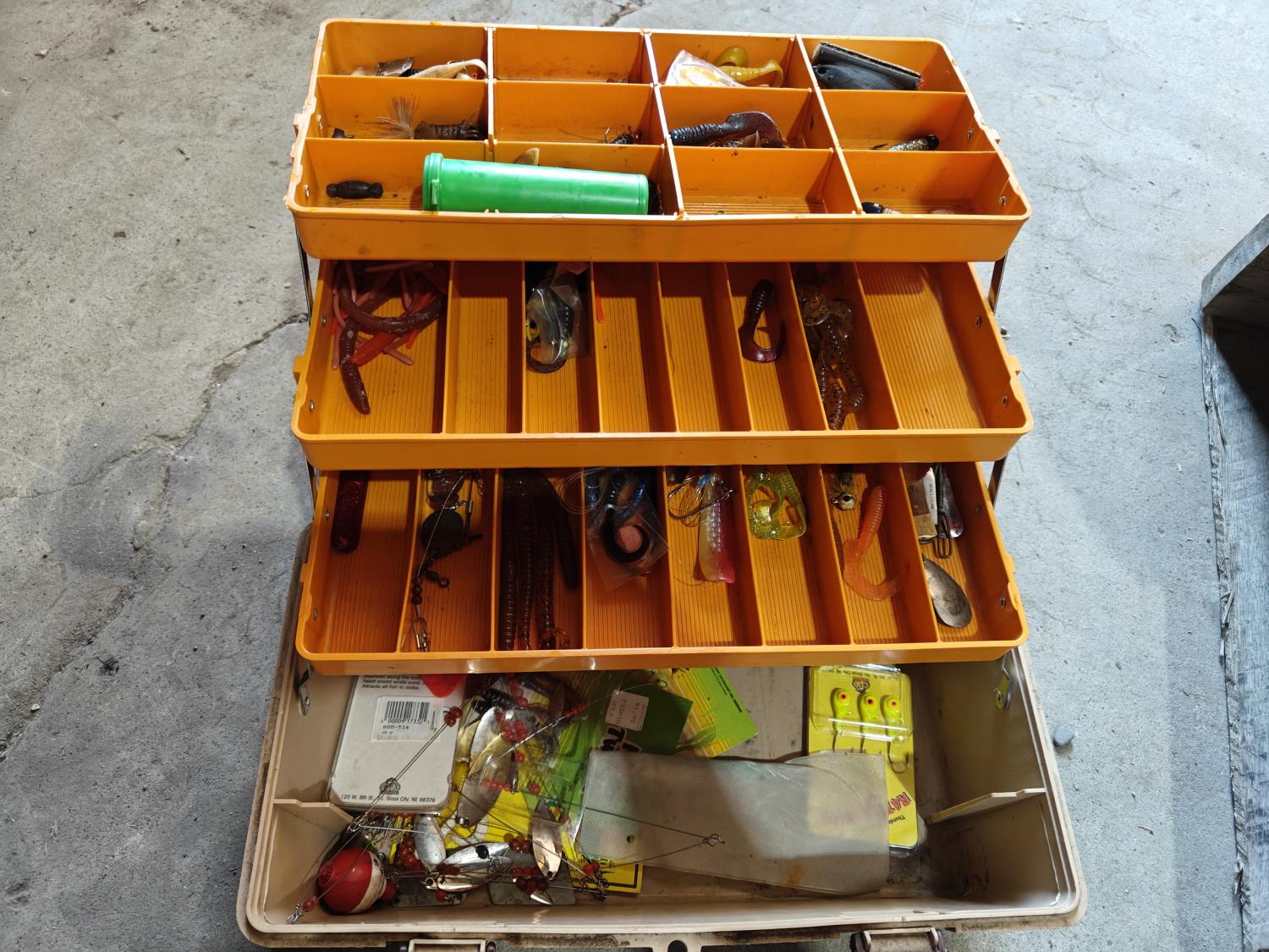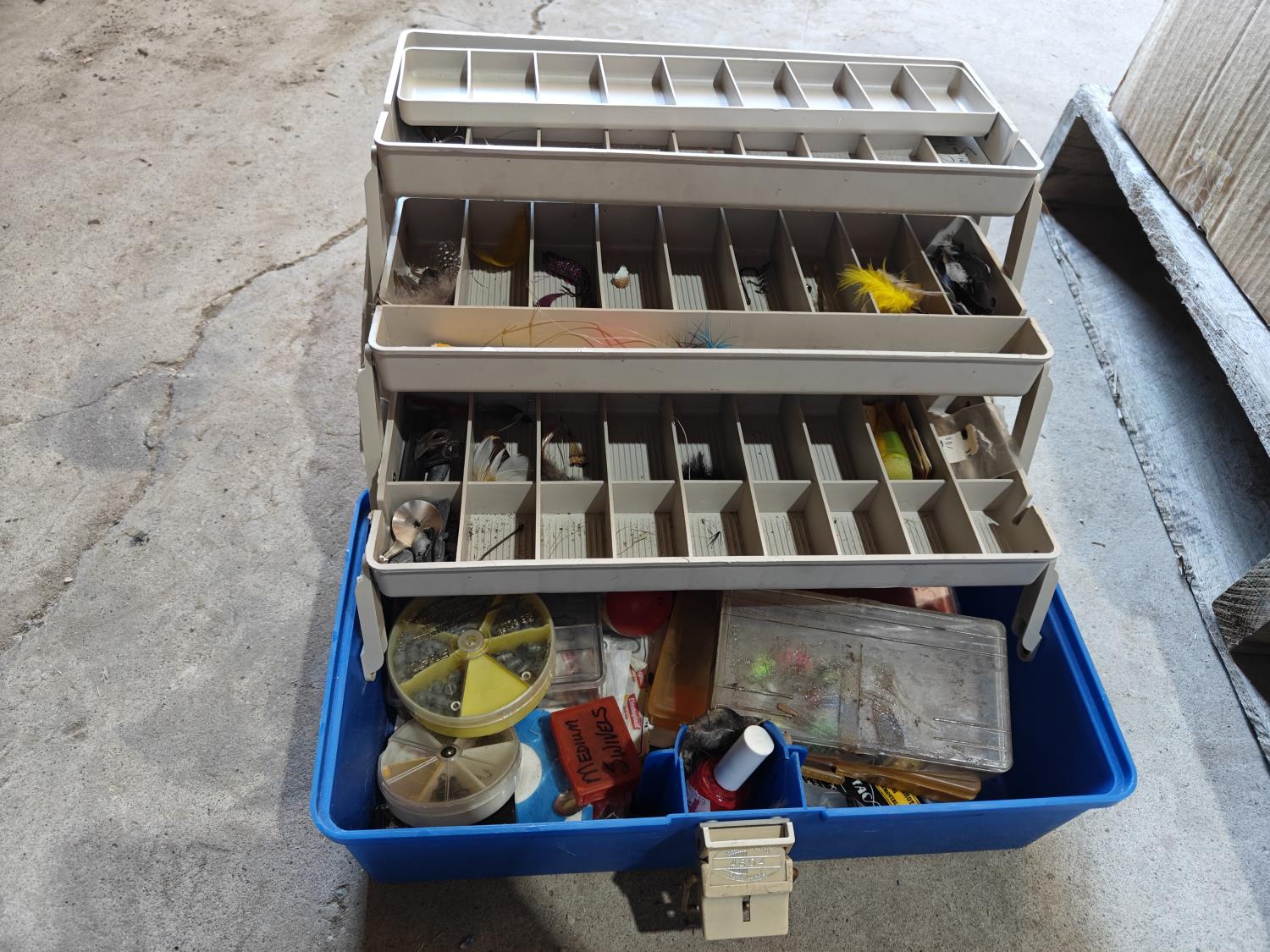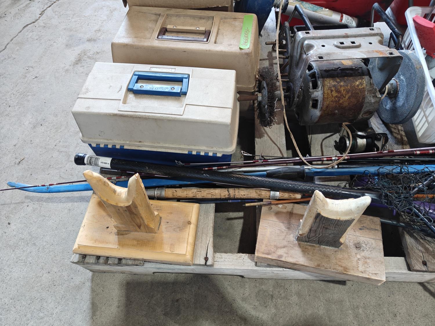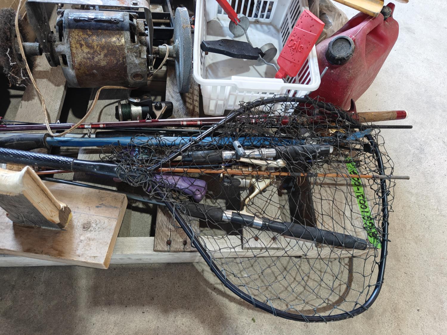 (2) Tackle boxes with gear, Qty of lubricants, boat anchor, (2) boat fuel tanks, Qty of fishing rods, (3) paddles, net