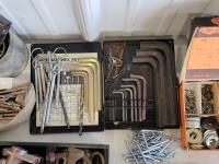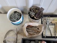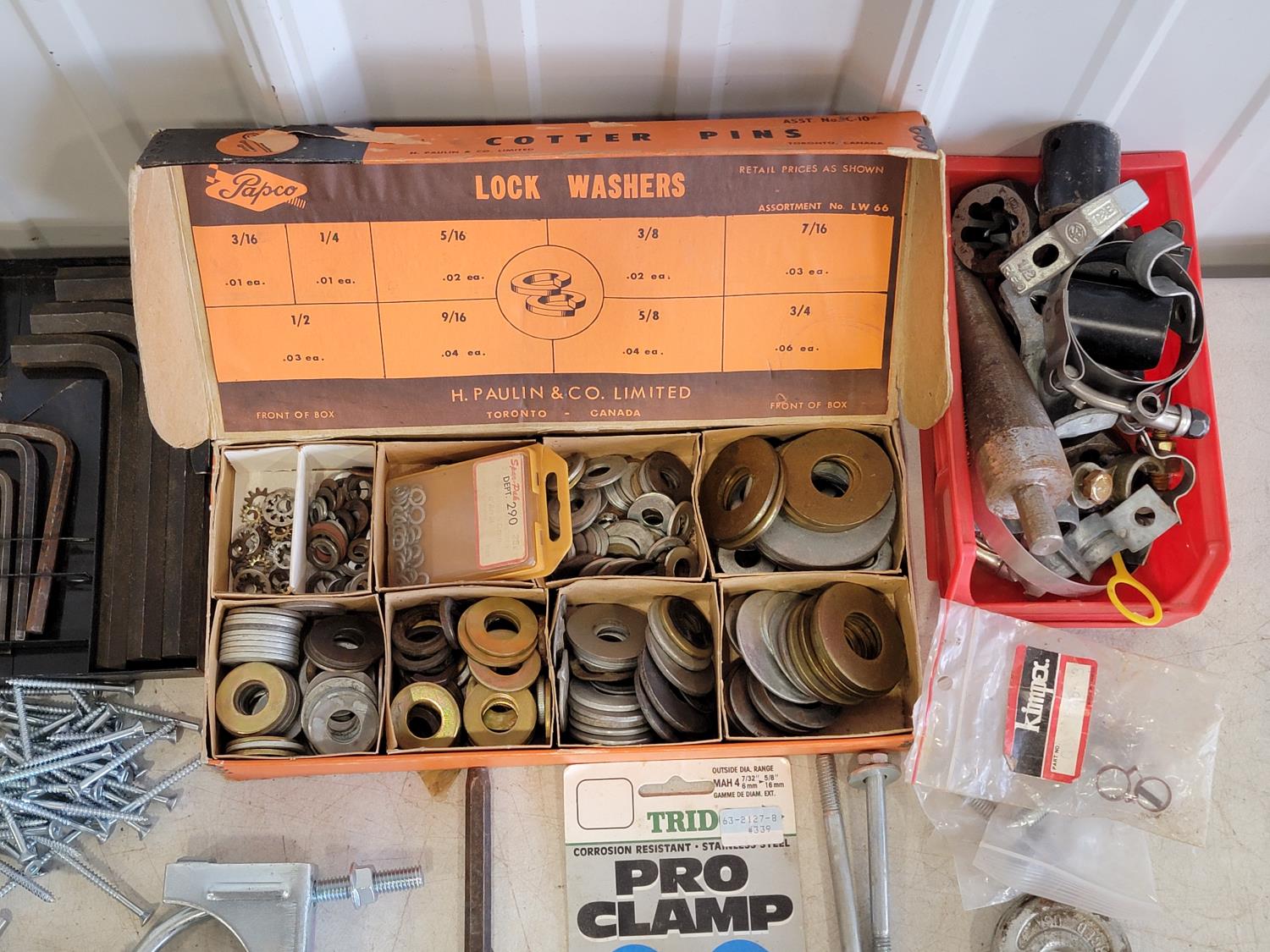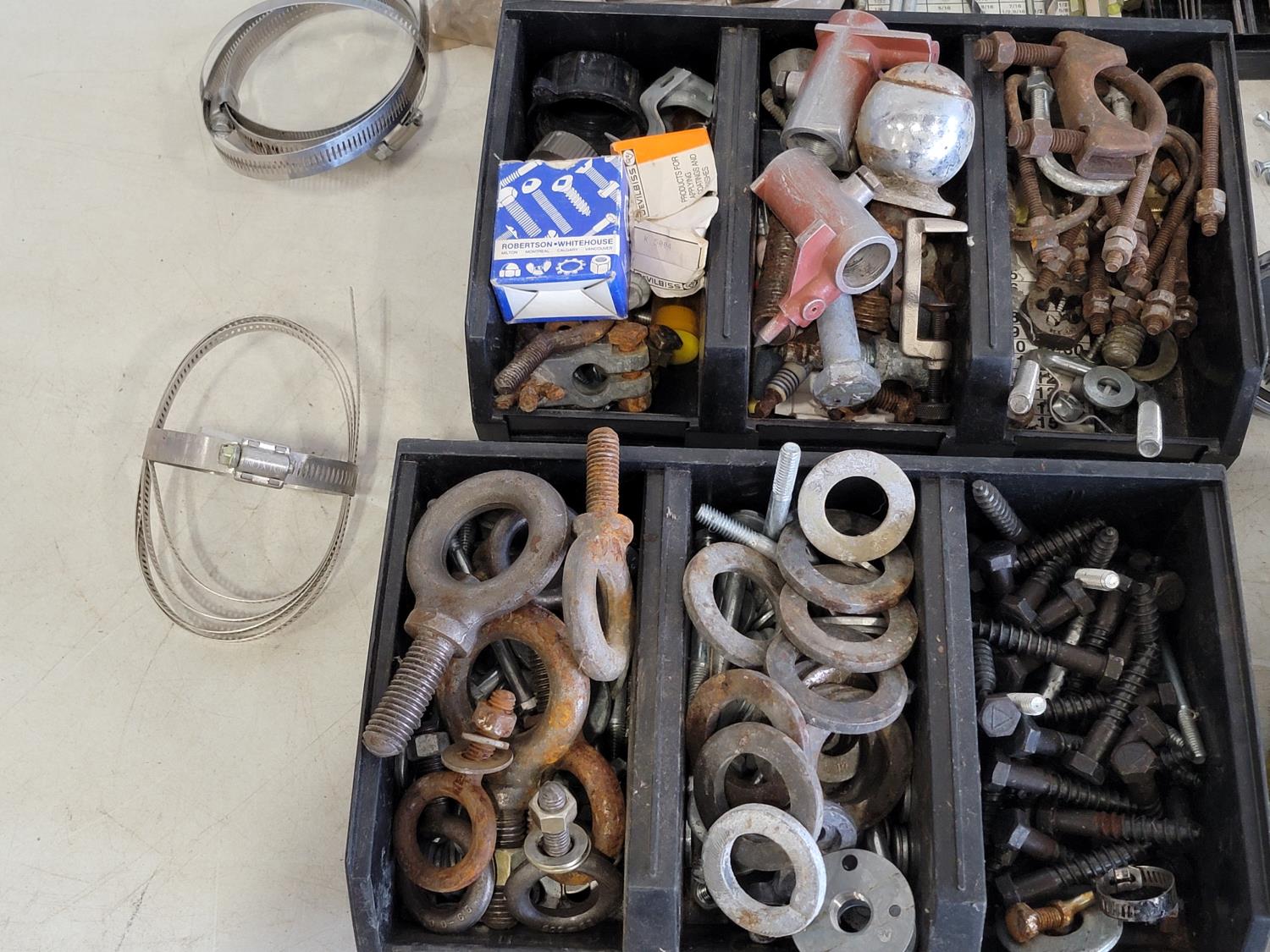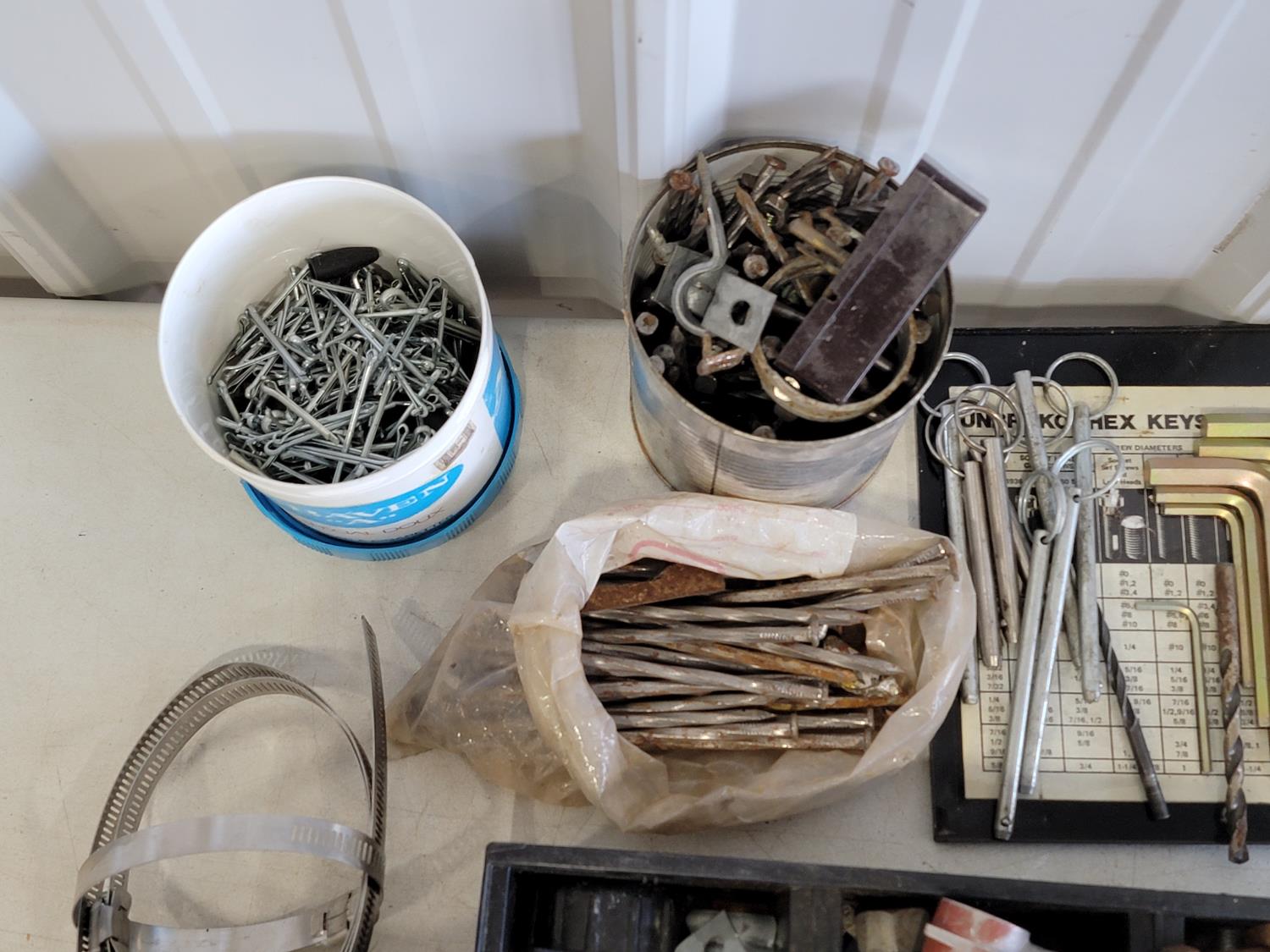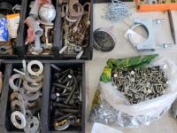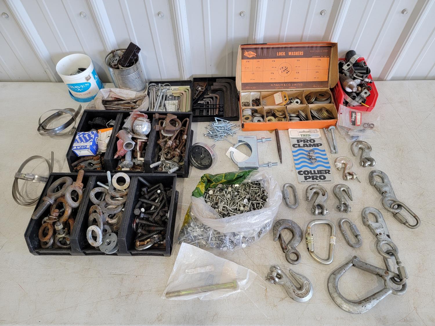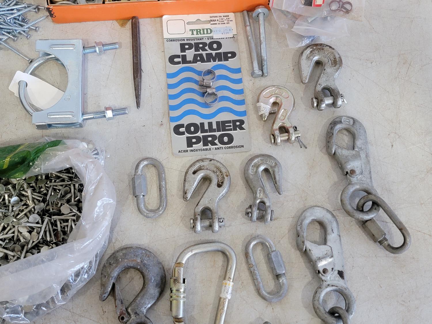 washers, hex keys, carabiners, pins, eye bolts, U-bolts, hose clamps, nails, screws, clevis grab hooks