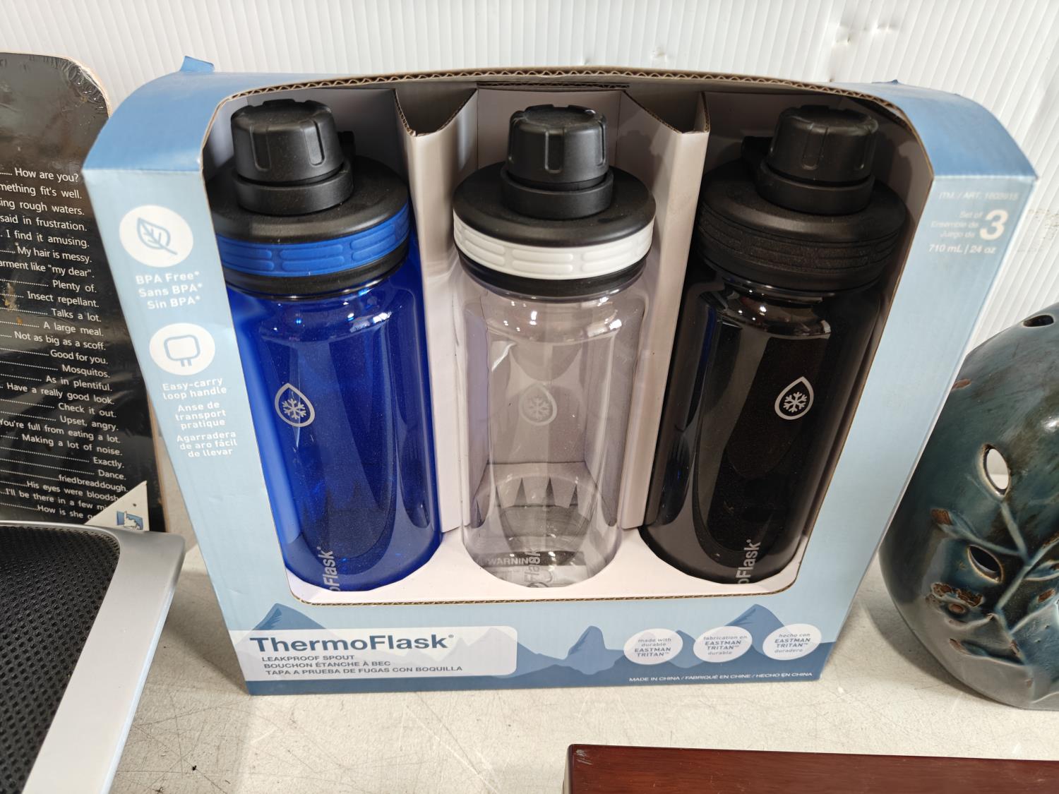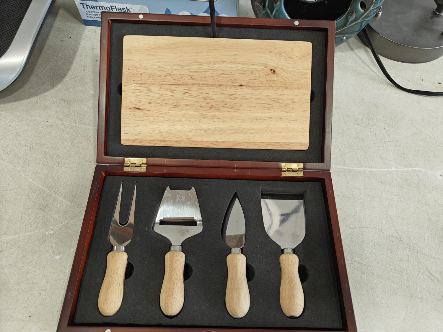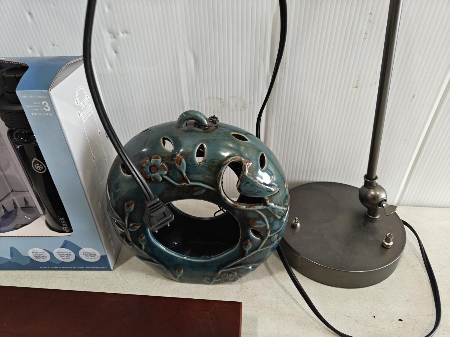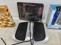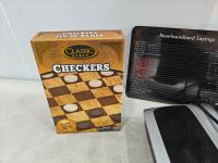 checkers game, foot massager, 3-pack water bottles (unused), lamp, sign, cheese board and knife