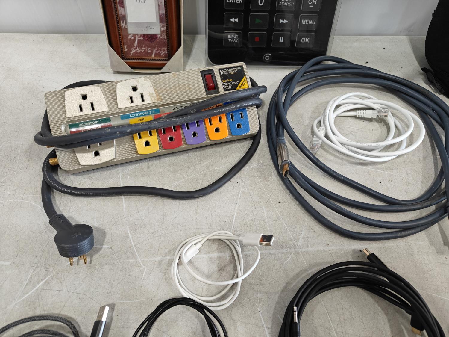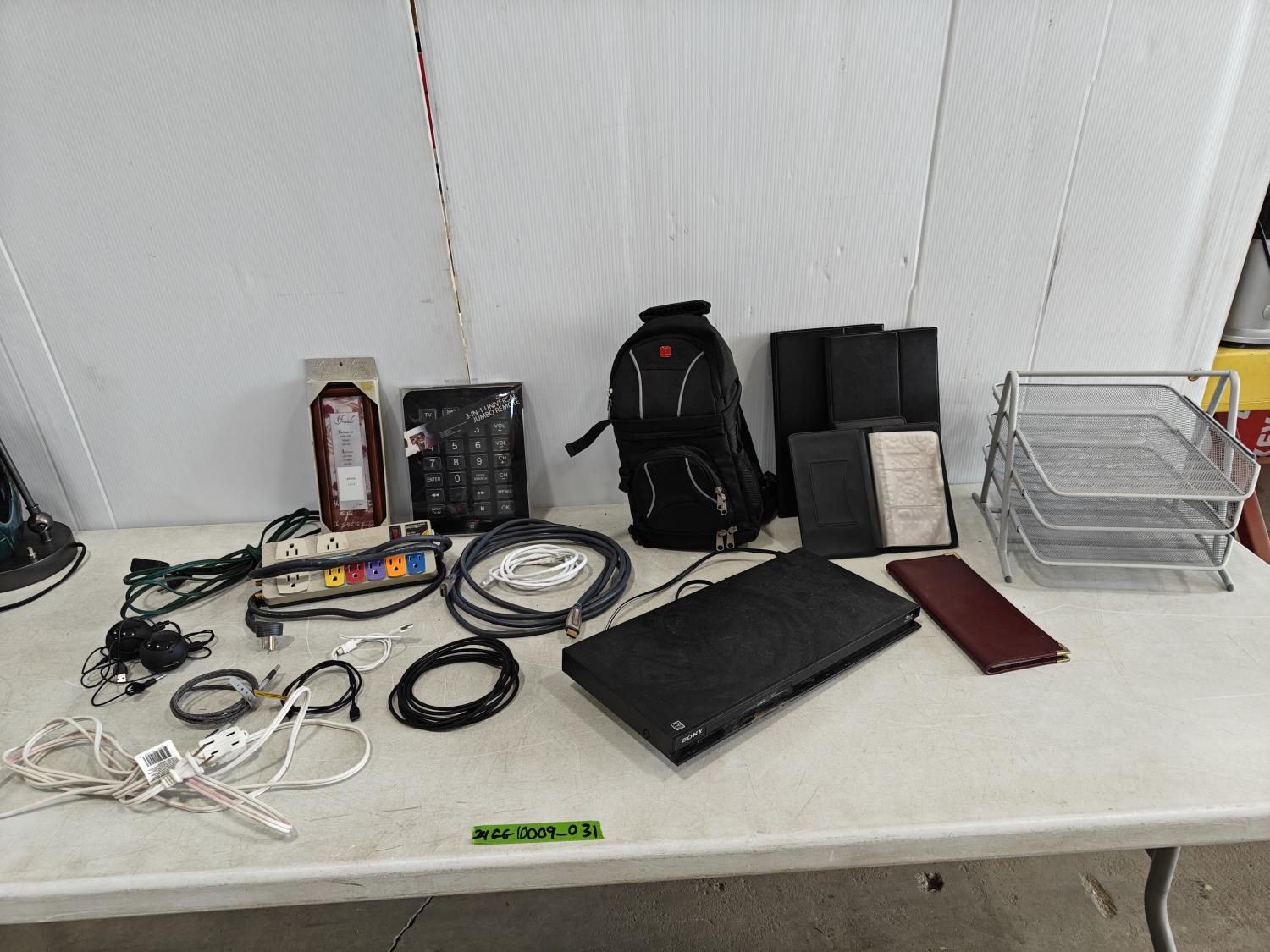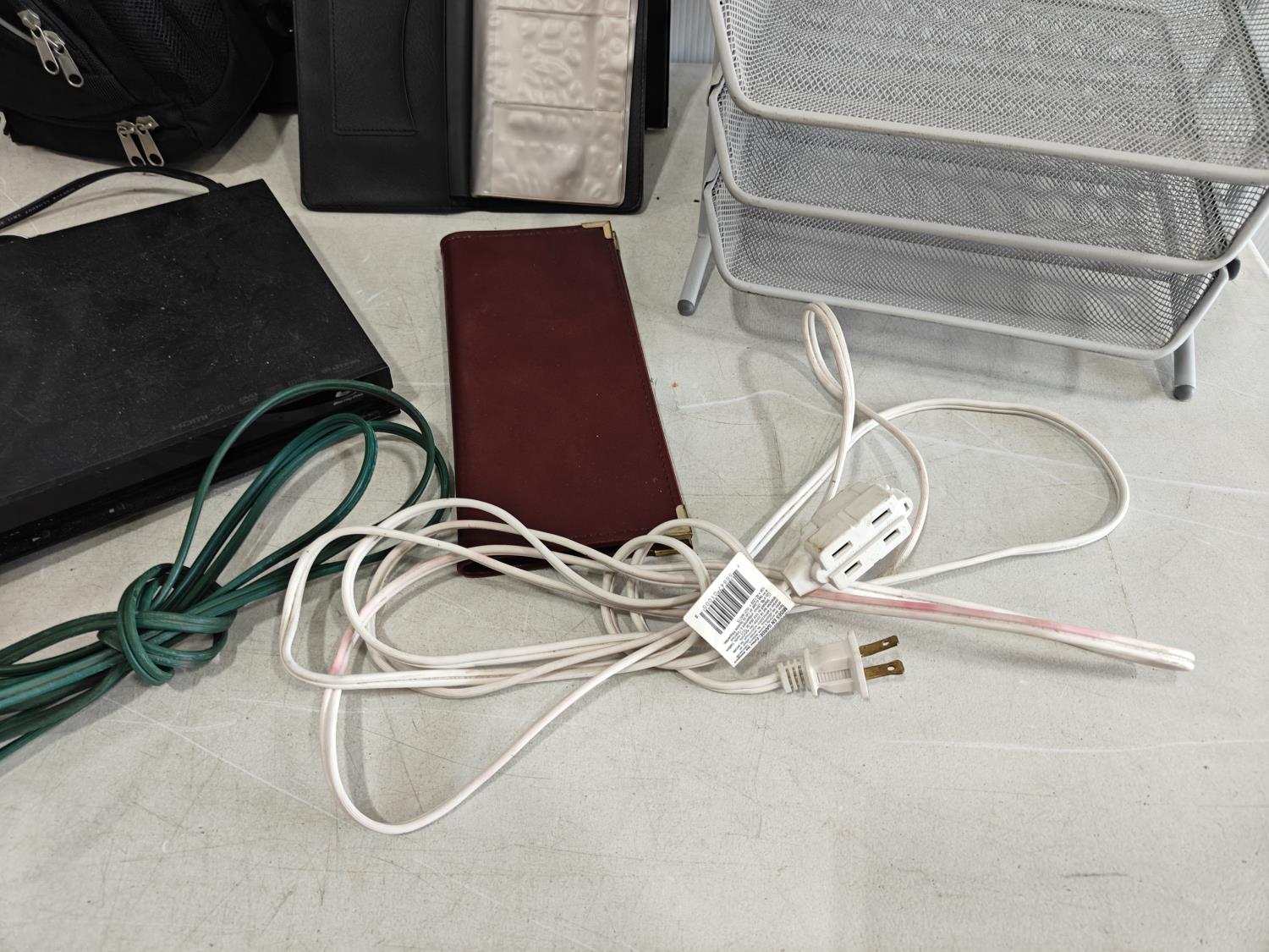 3-tier paper rack, power bar, assorted cables, camera bag, (5) bard holder books, jumbo remote, DVD player, (2) indoor power cables