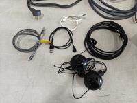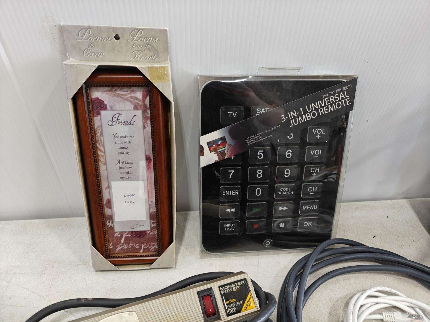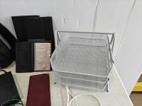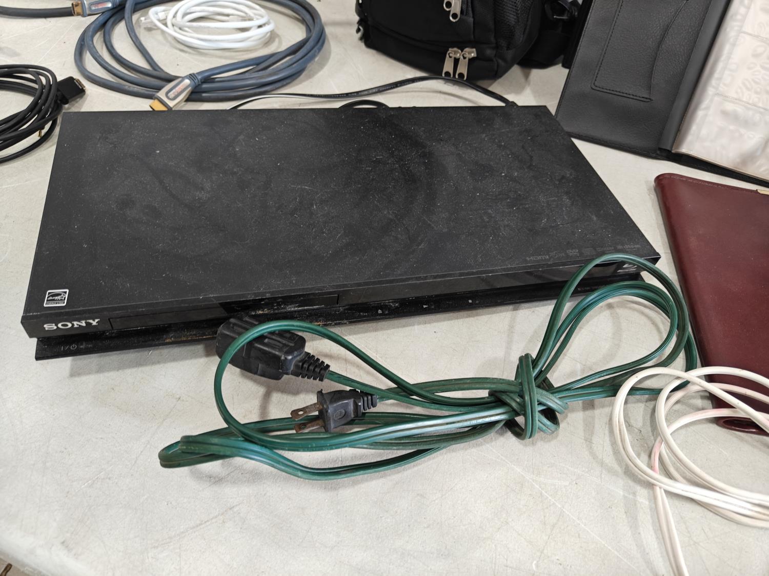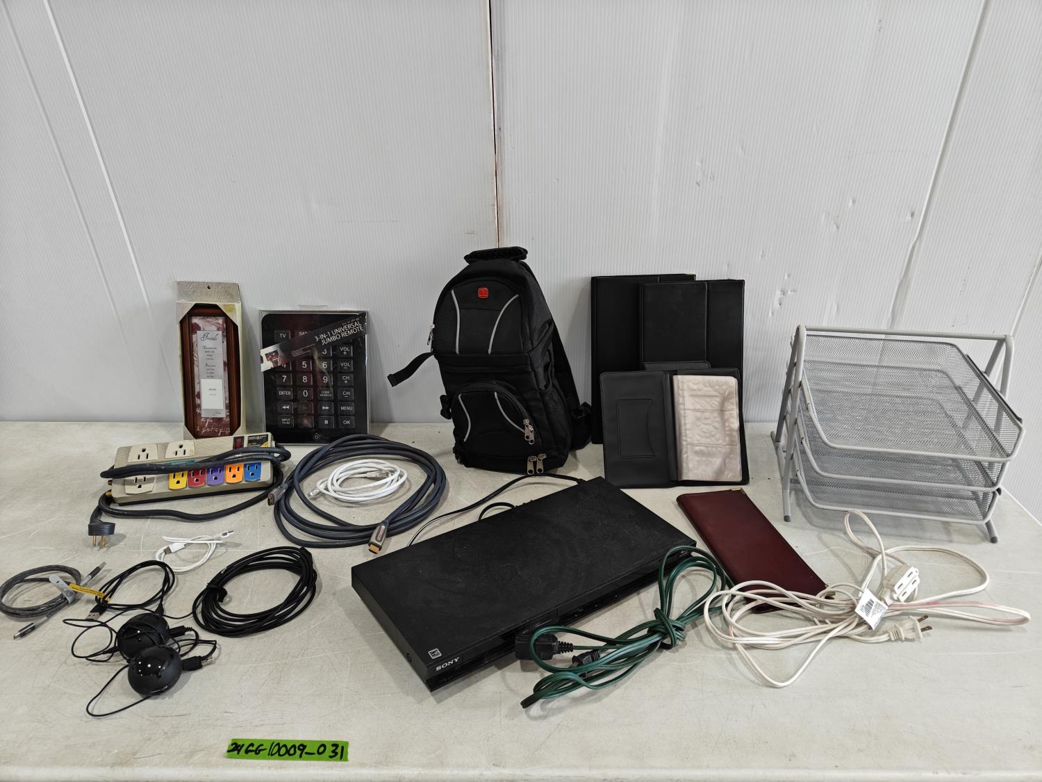 3-tier paper rack, power bar, assorted cables, camera bag, (5) bard holder books, jumbo remote, DVD player, (2) indoor power cables