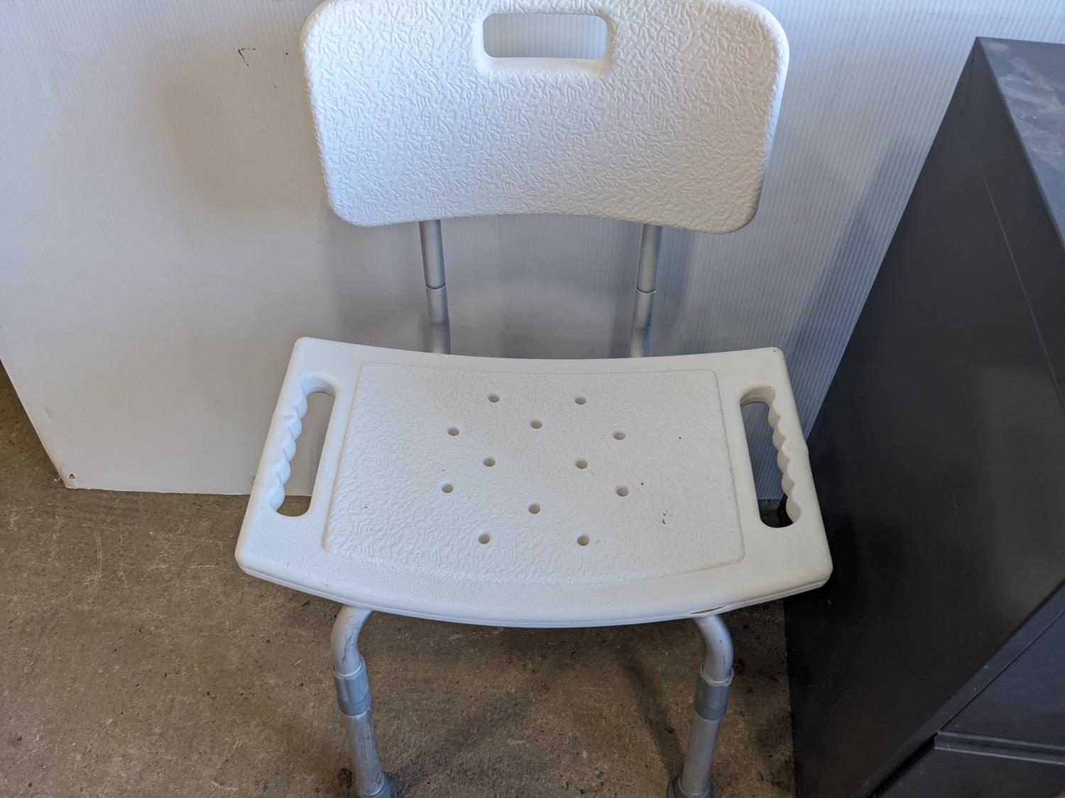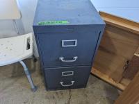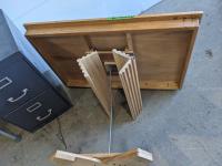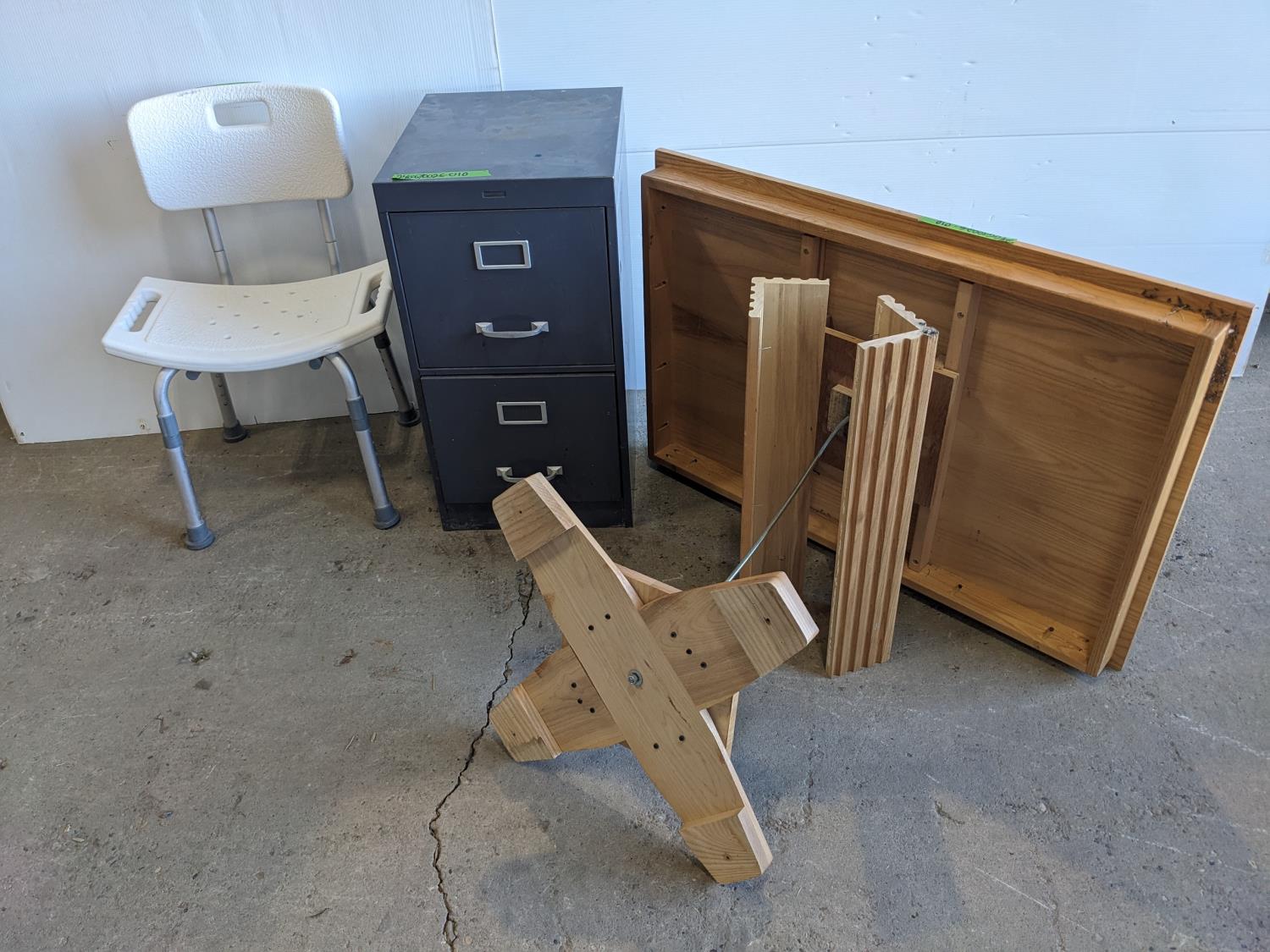 2 drawer metal filing cabinet 15 inch w x 18 inch d x 28 inch h, oak RV table 39 inch w x 26 inch d x 30 inch h, shower chair