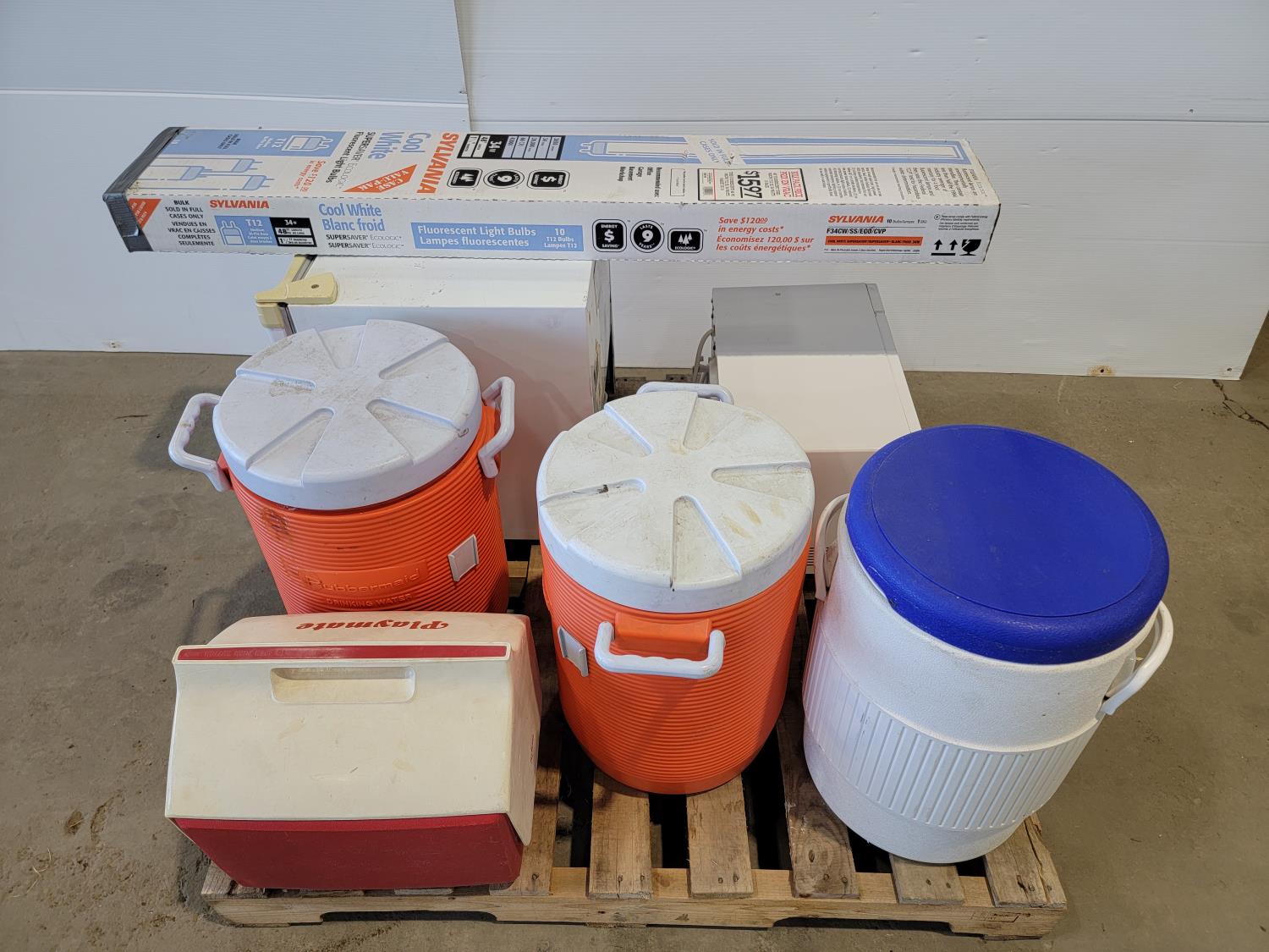 Fluorescent lights, beverage coolers, cooler lunch kit, mini fridge, microwave