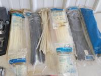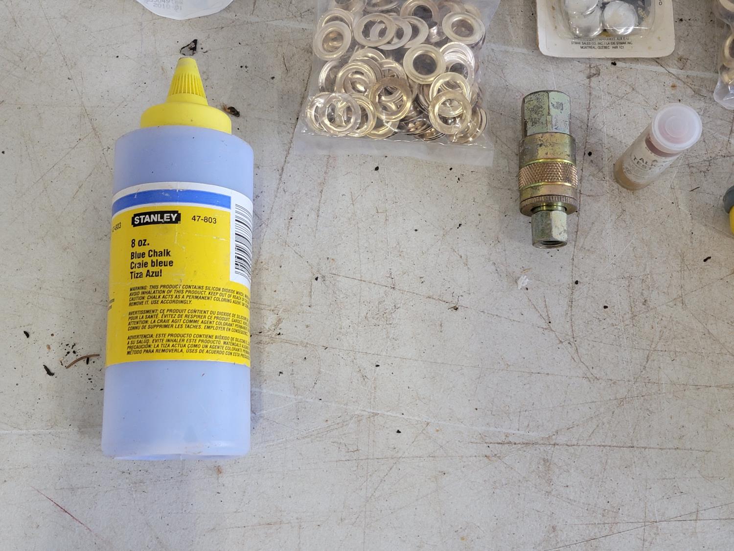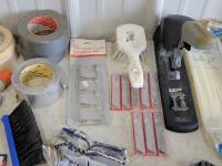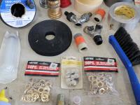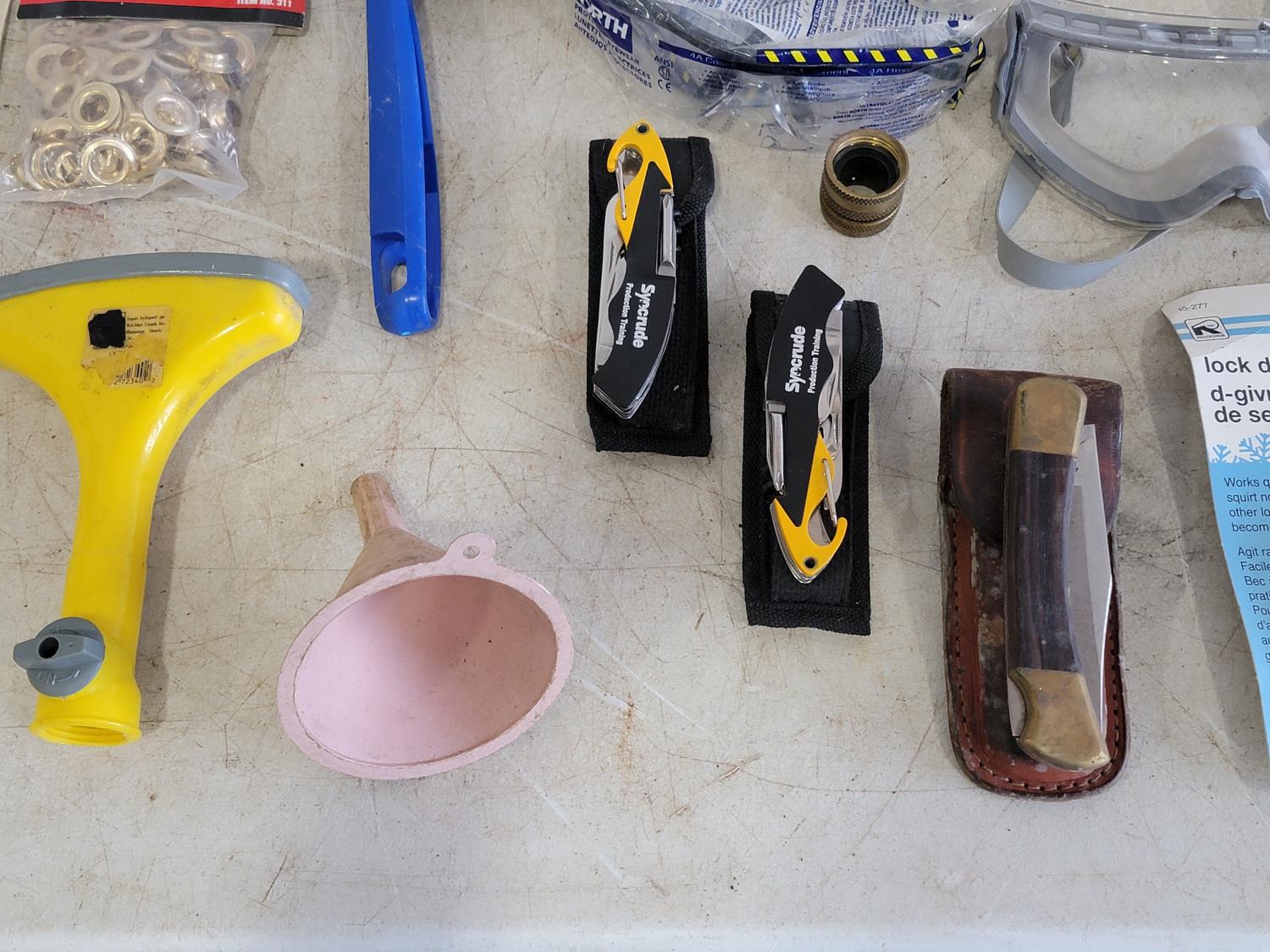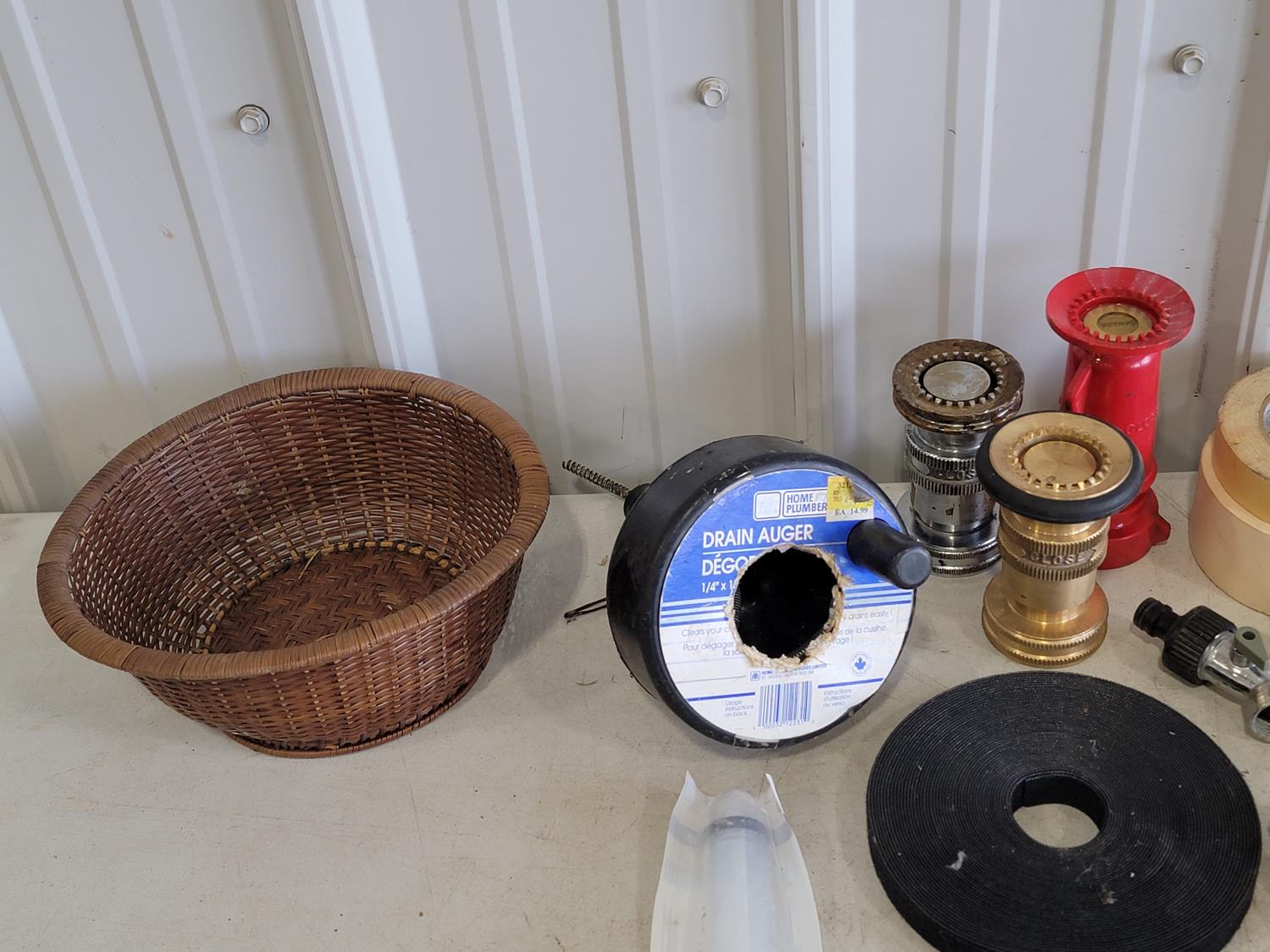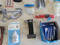 zip ties, basket, utility replacement blades, stapler, hand torch, pocket knives, tape, hose ends, pH test strips, drain snake, fire hose ends