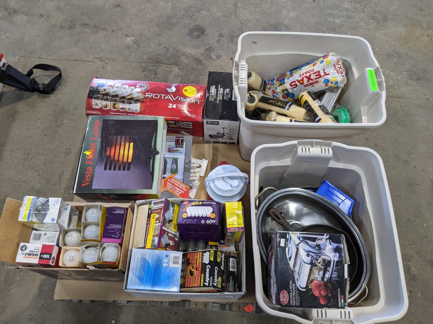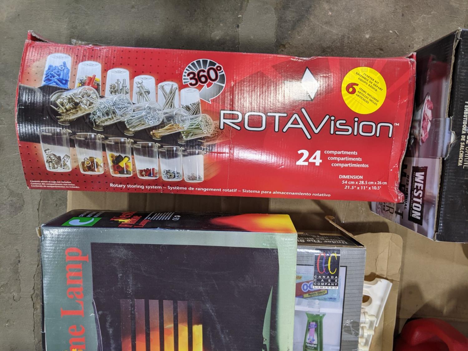 Painting supplies, pots and pans, light bulbs, meat grinder, Rotavision 24 compartment storage system