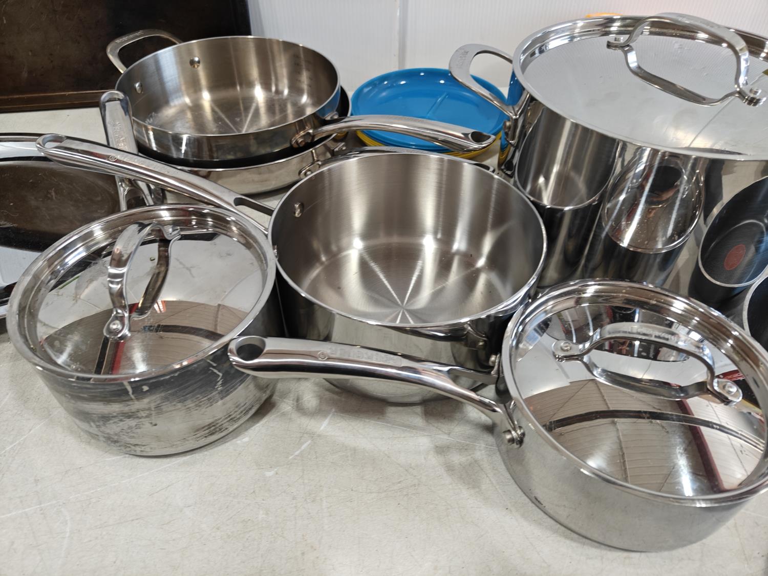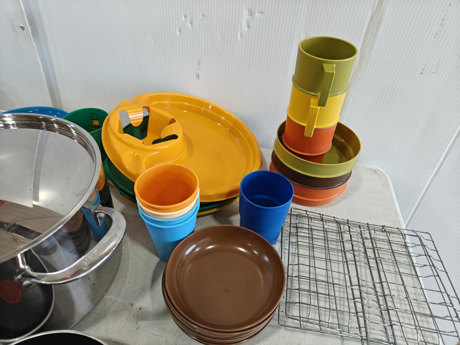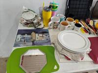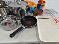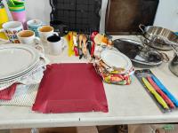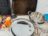dish set, stainless steel pots and pans, utensils, drinkware, serving platters