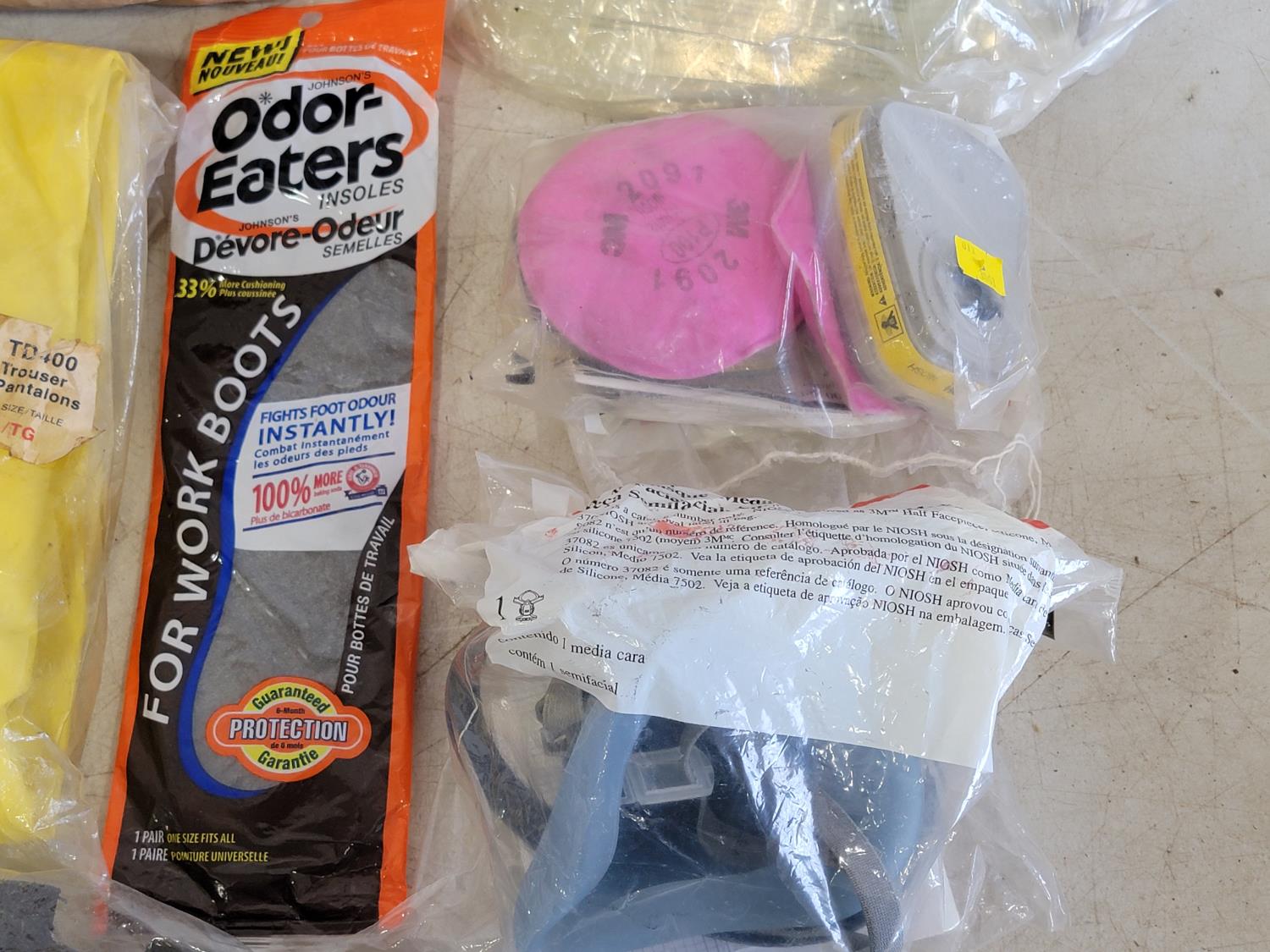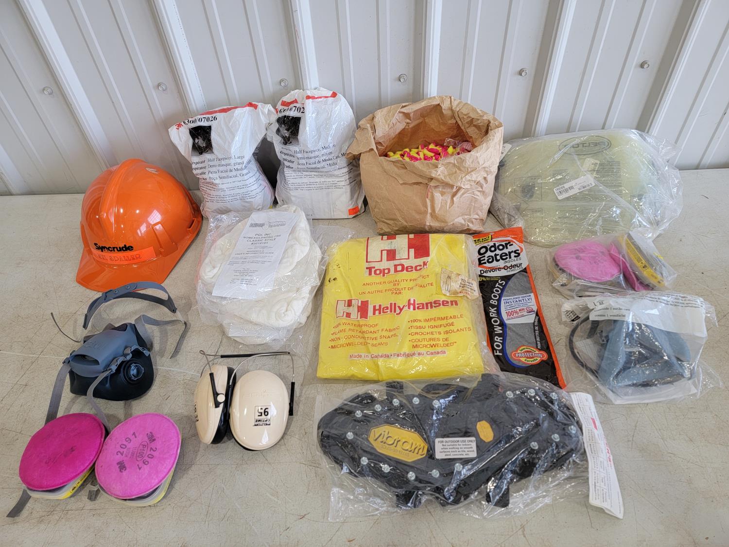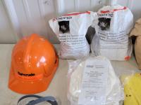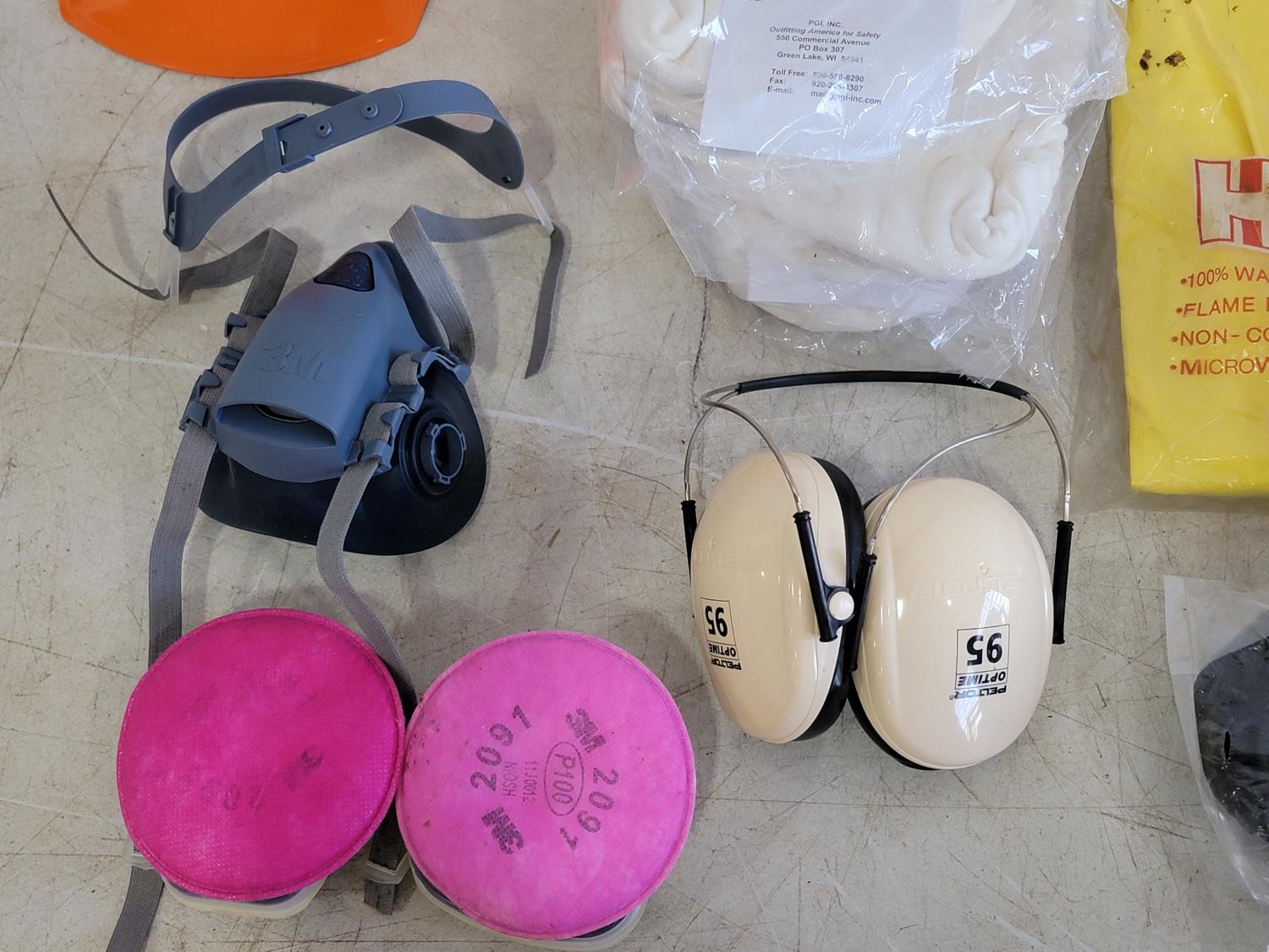 half face respirators, xl rain trousers, clear acetate visors, ear plugs, boot grips, hard hat