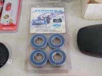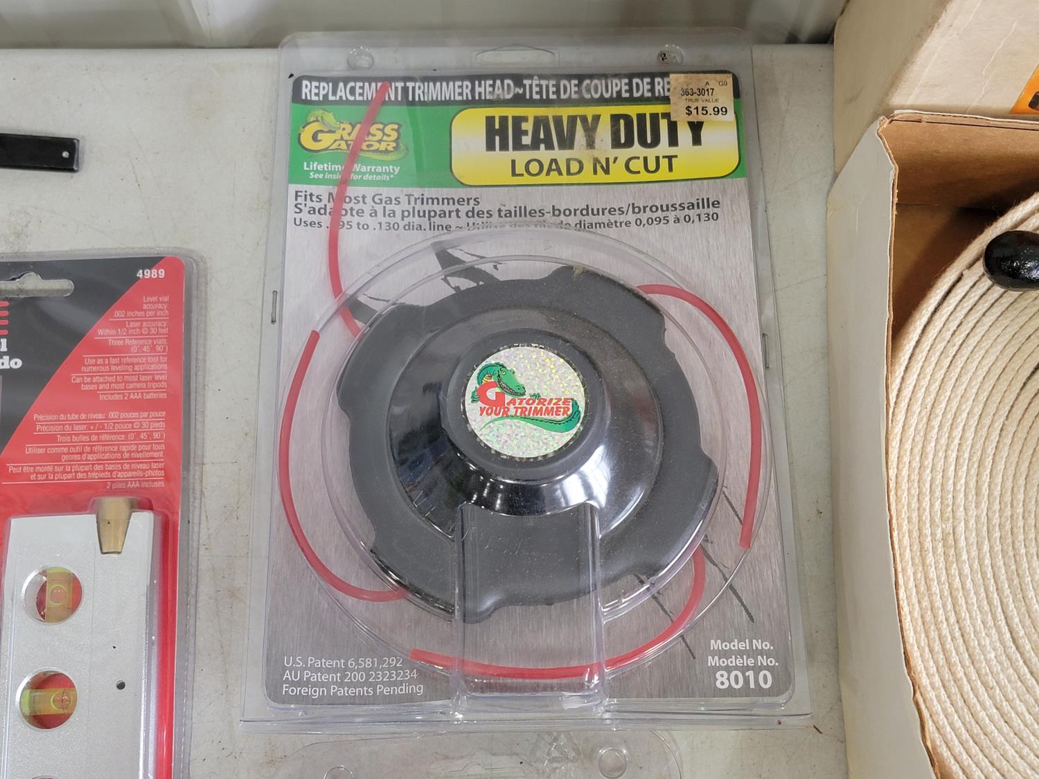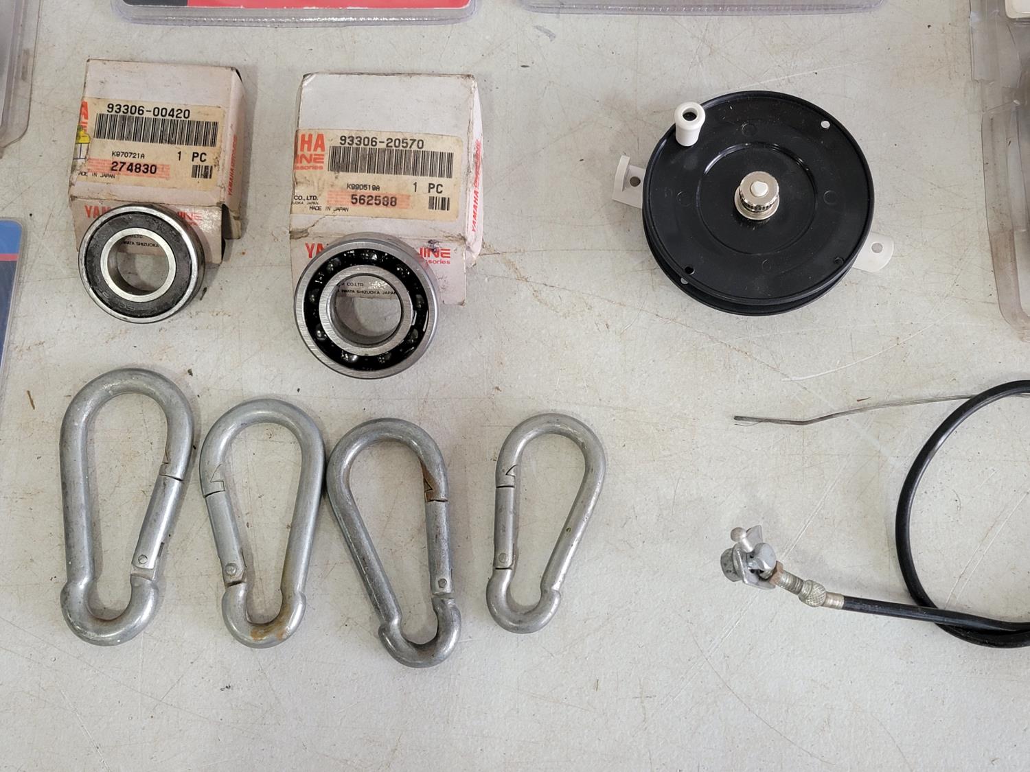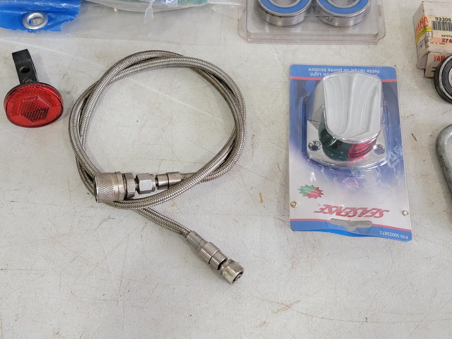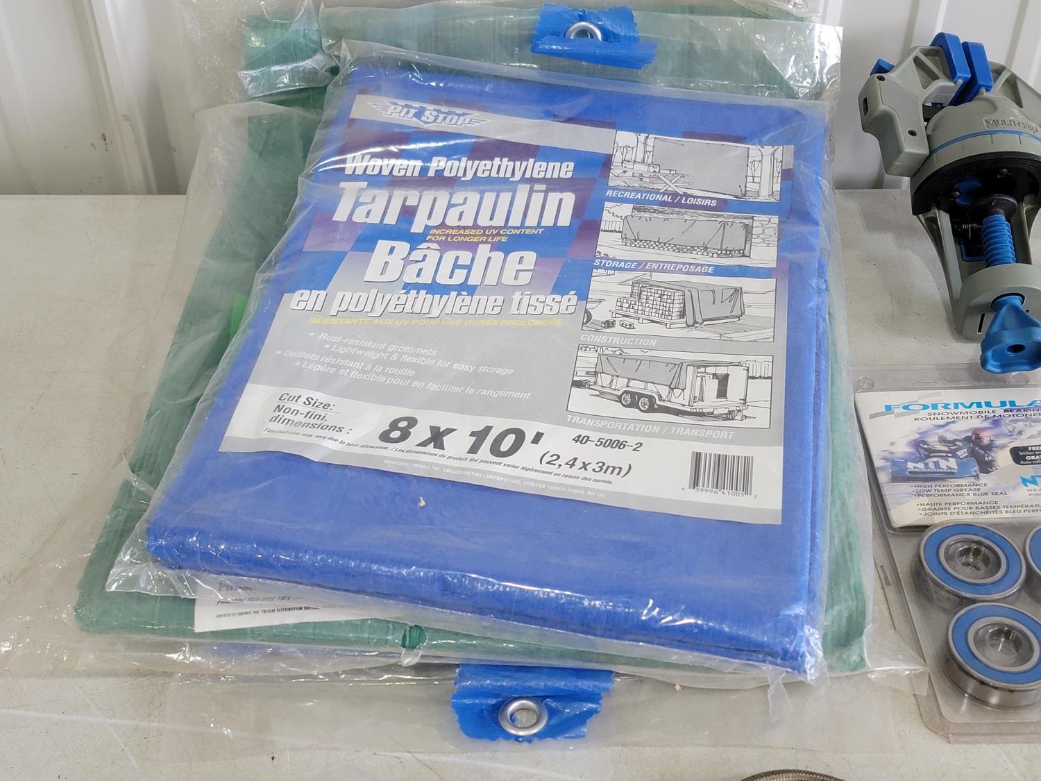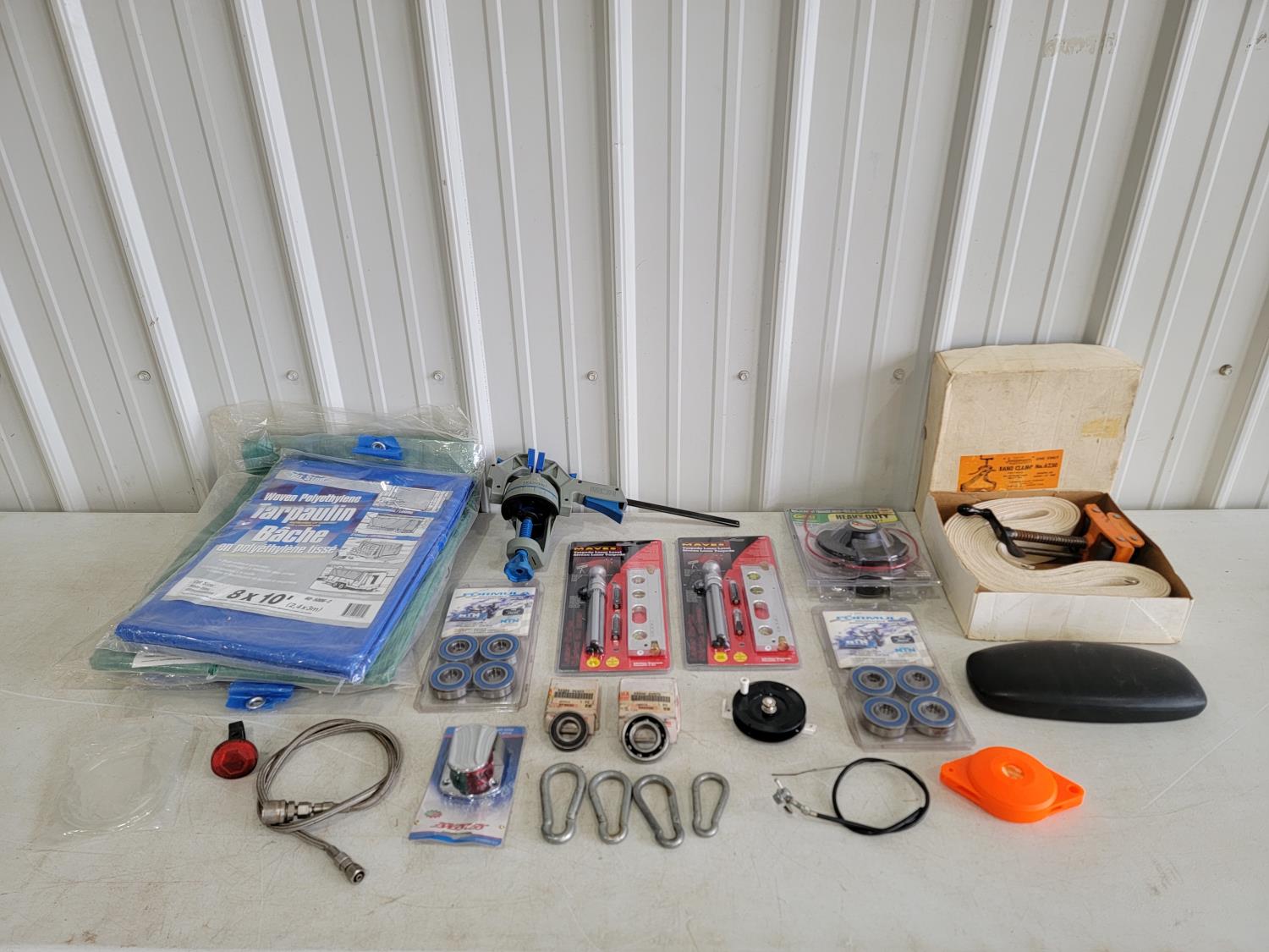 Tarps, multi-grip clamp, Torpedo laser level, carabiners, bearings, band clamp, boat light, fishing line