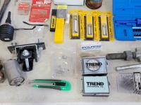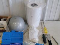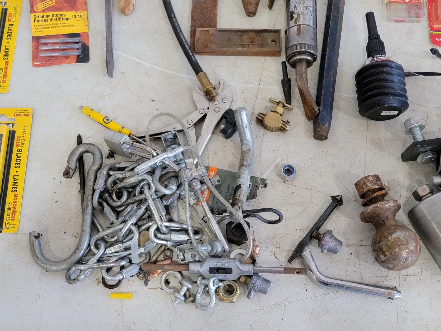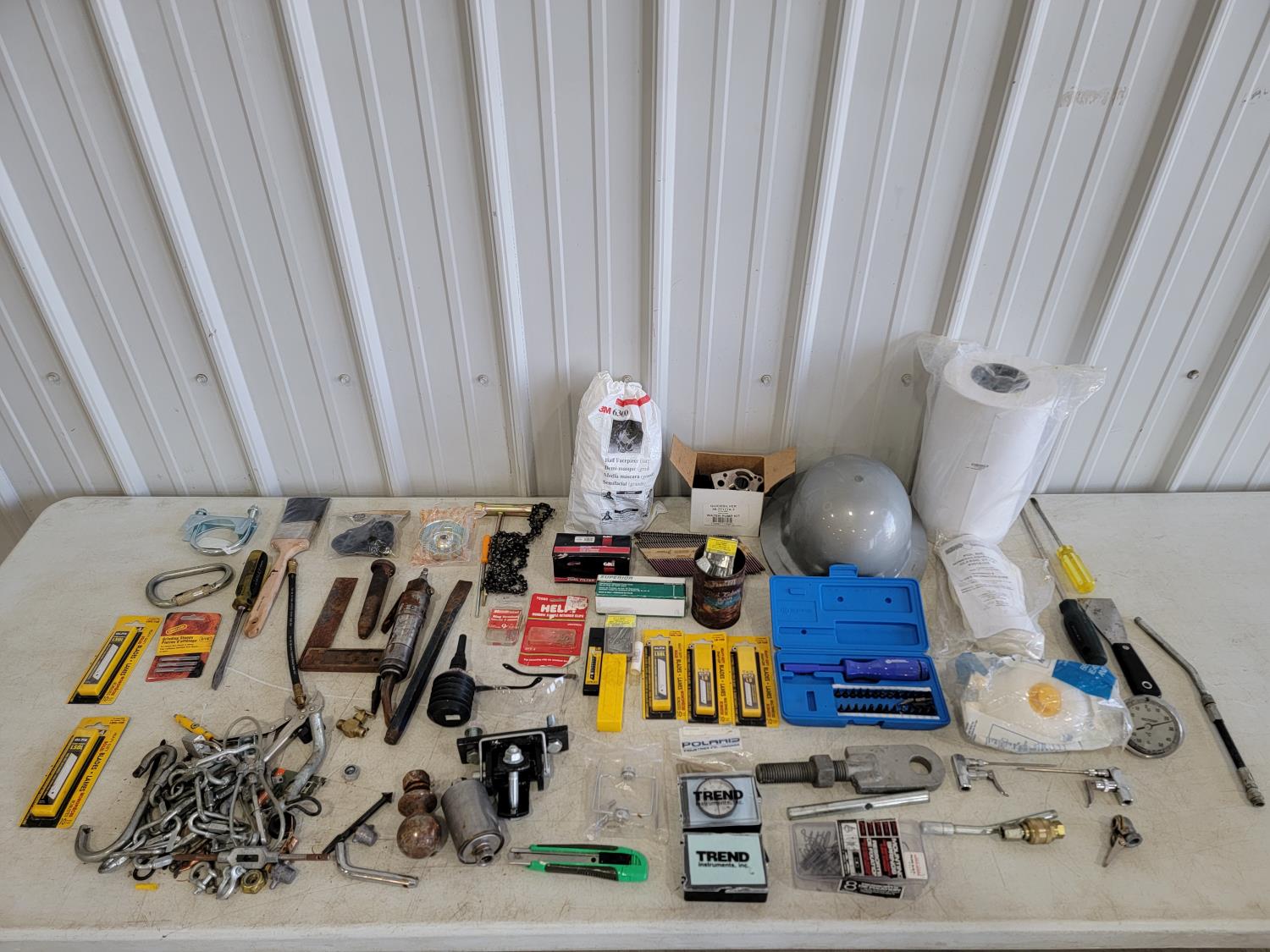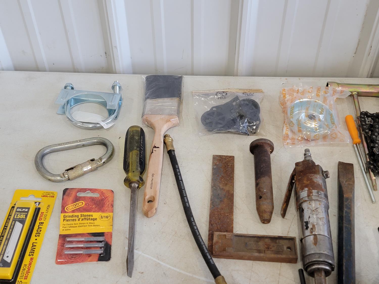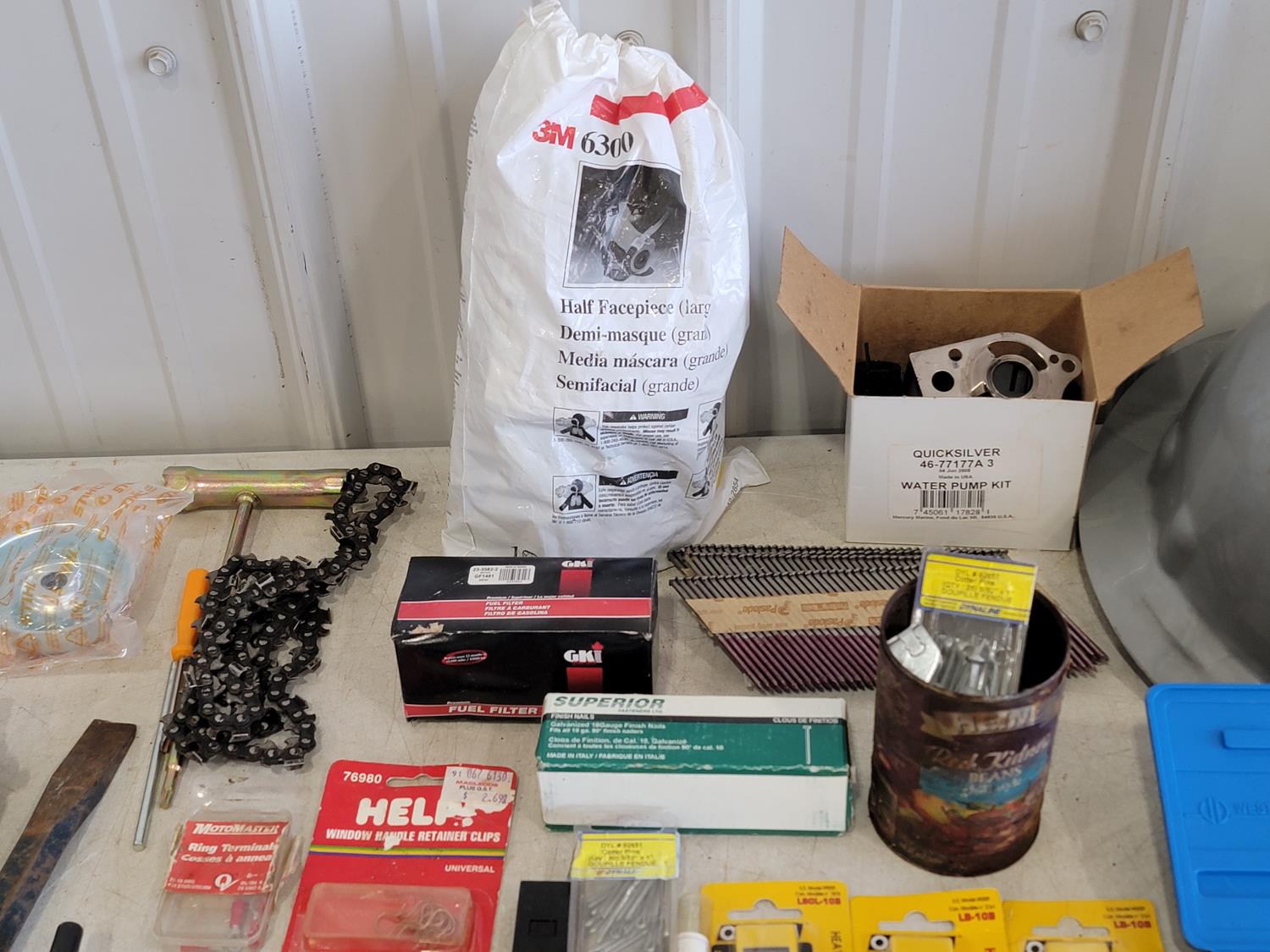 hard hat, water pump kit, respirator, chain saw parts, screwdrivers, chisel, fasteners, utility knife with replacement blades, air hose ends