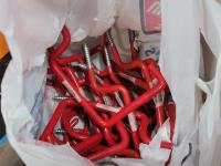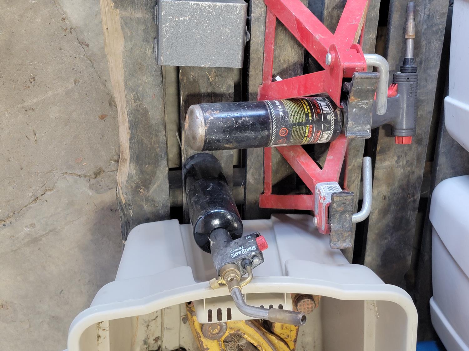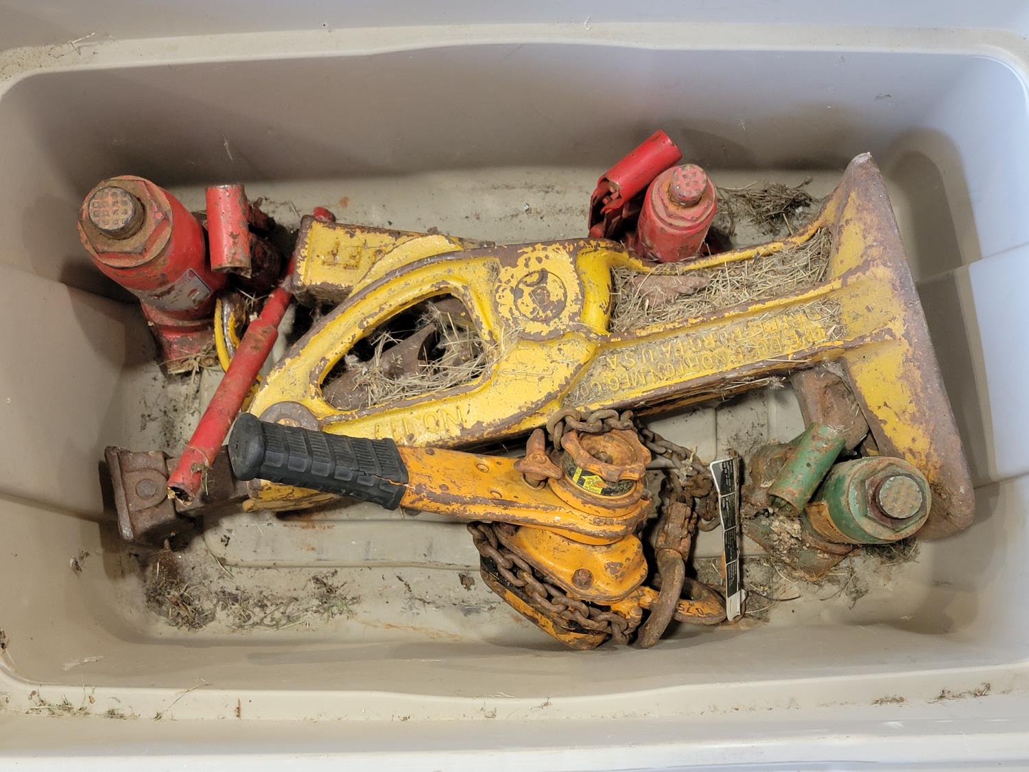 house jack, bottle jacks, jack stands, wire cable, metal material, wooden post insulators, vinyl covered steel clothesline, propane torches, come-along, pocket probe