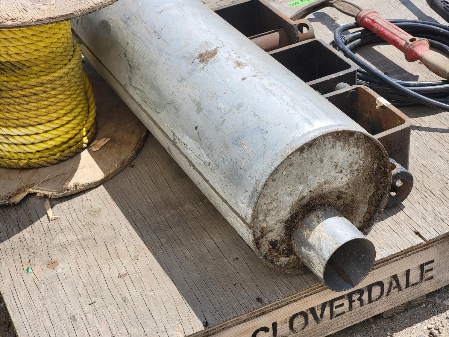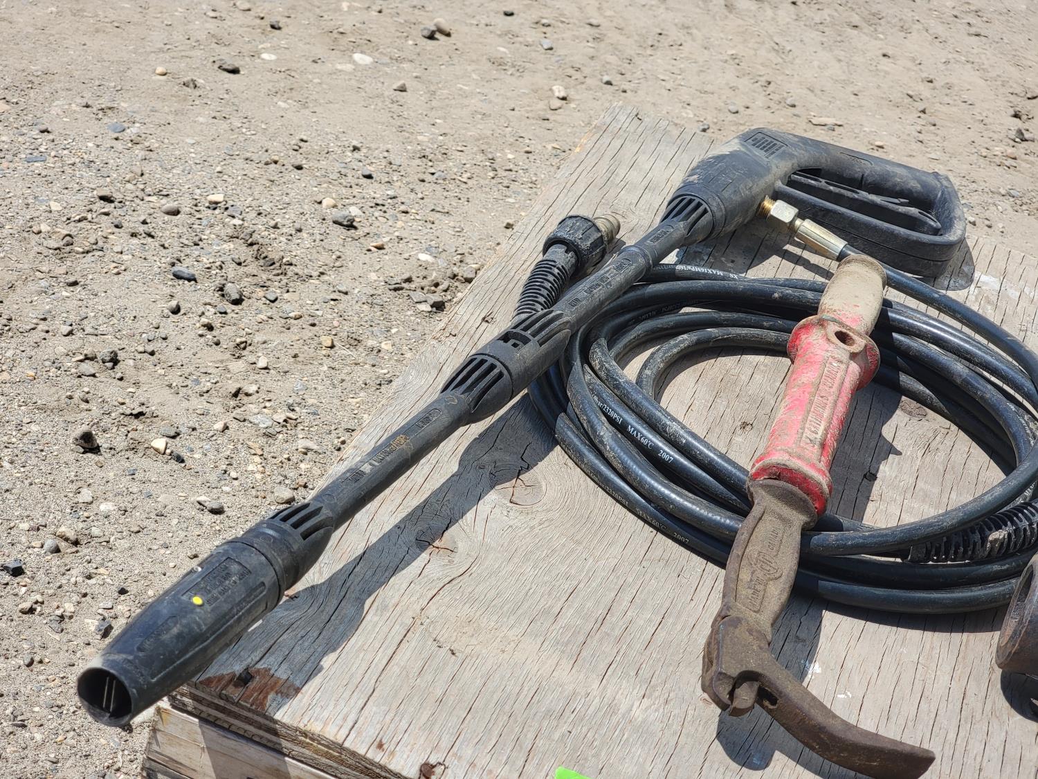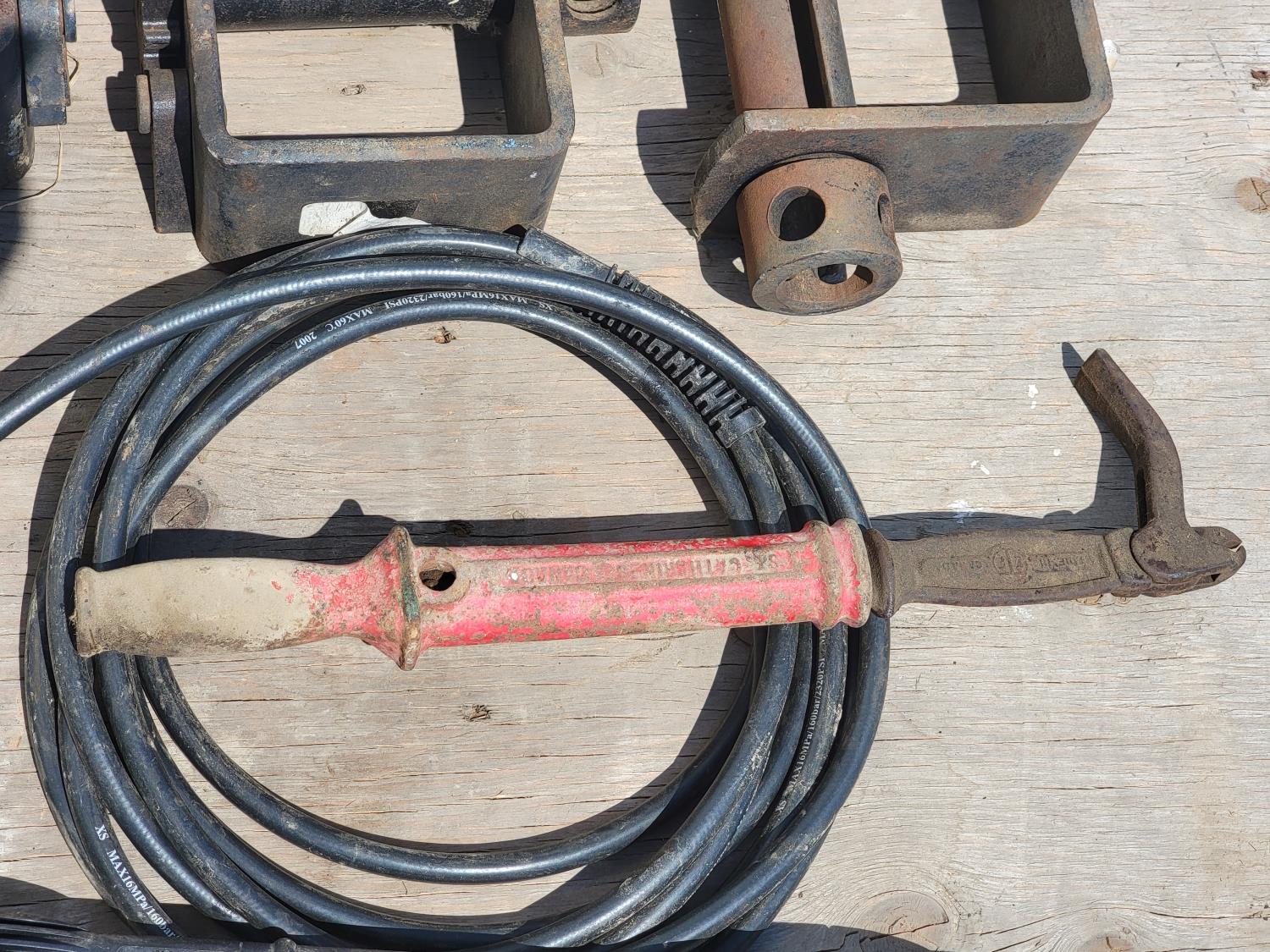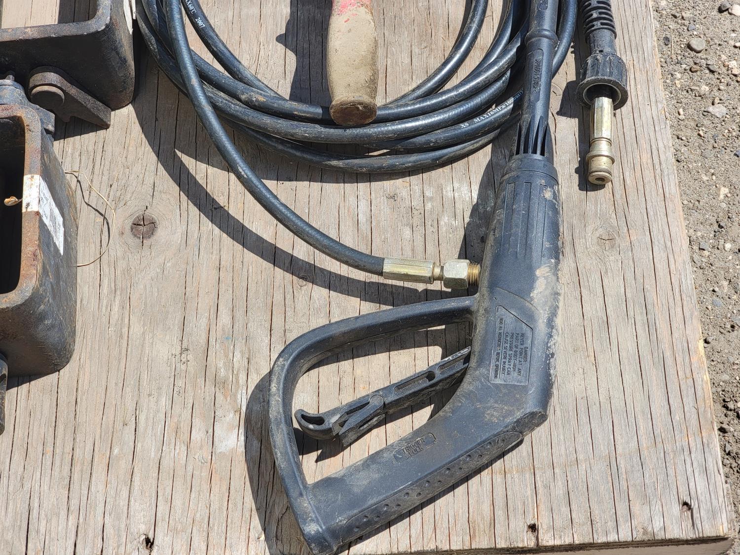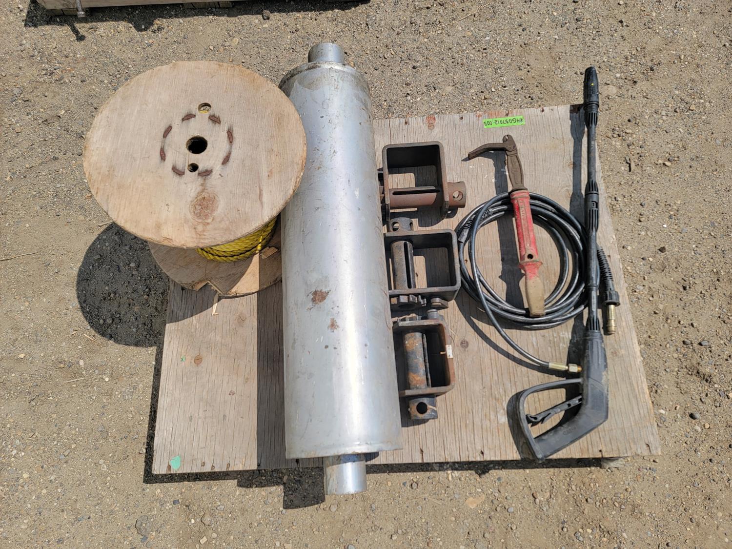 weld-on trailer winch, muffler, rope, nail puller, pressure washer nozzle and hose