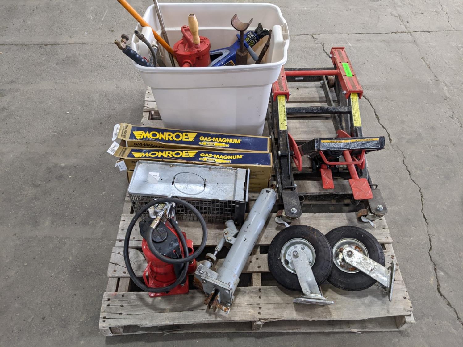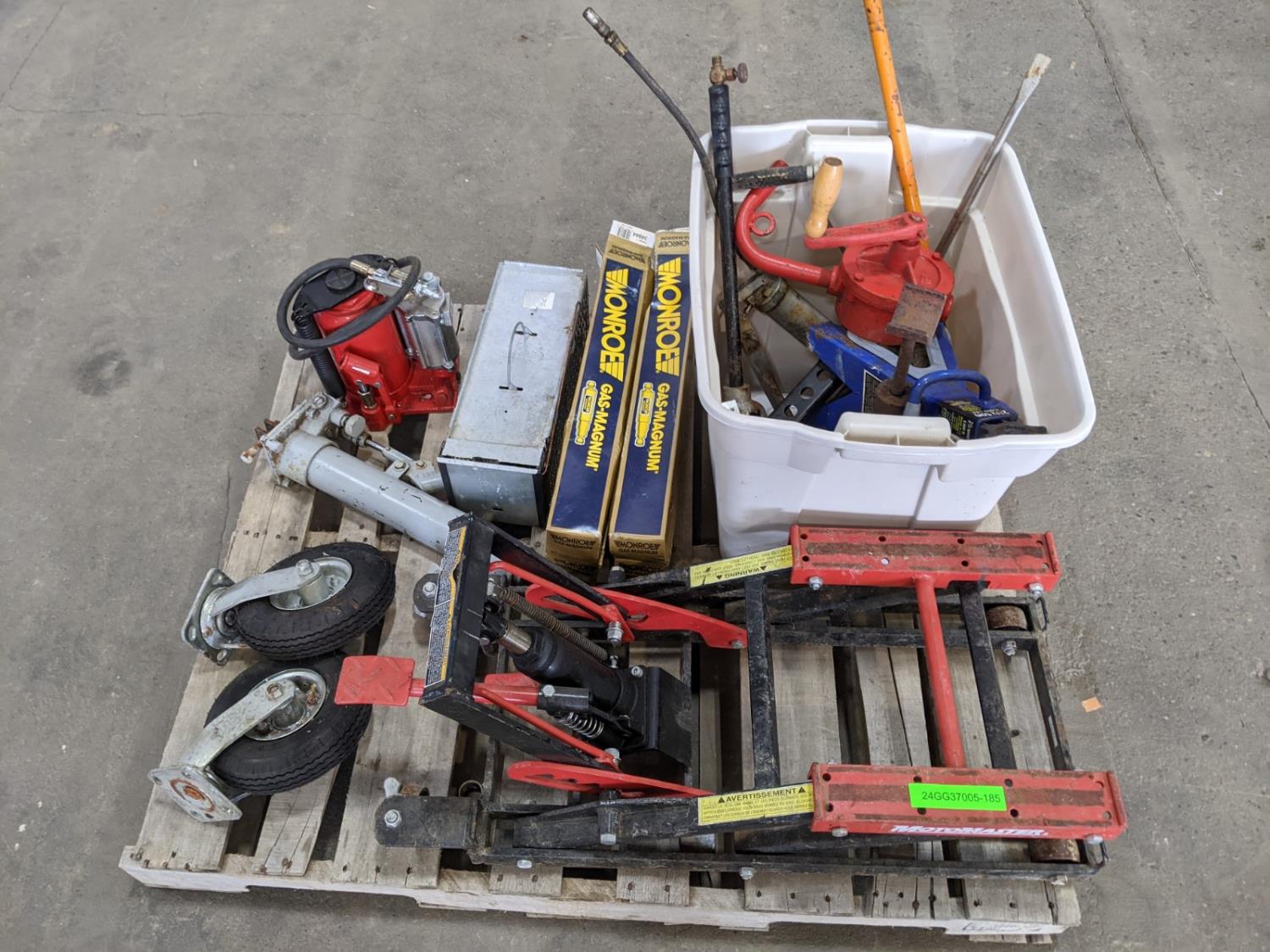 MotoMaster motorcycle lift, air/hydraulic bottle jack, (4) Munroe gas shocks, 16 inch bottle jack, jack stand, grease gun, small animal trap