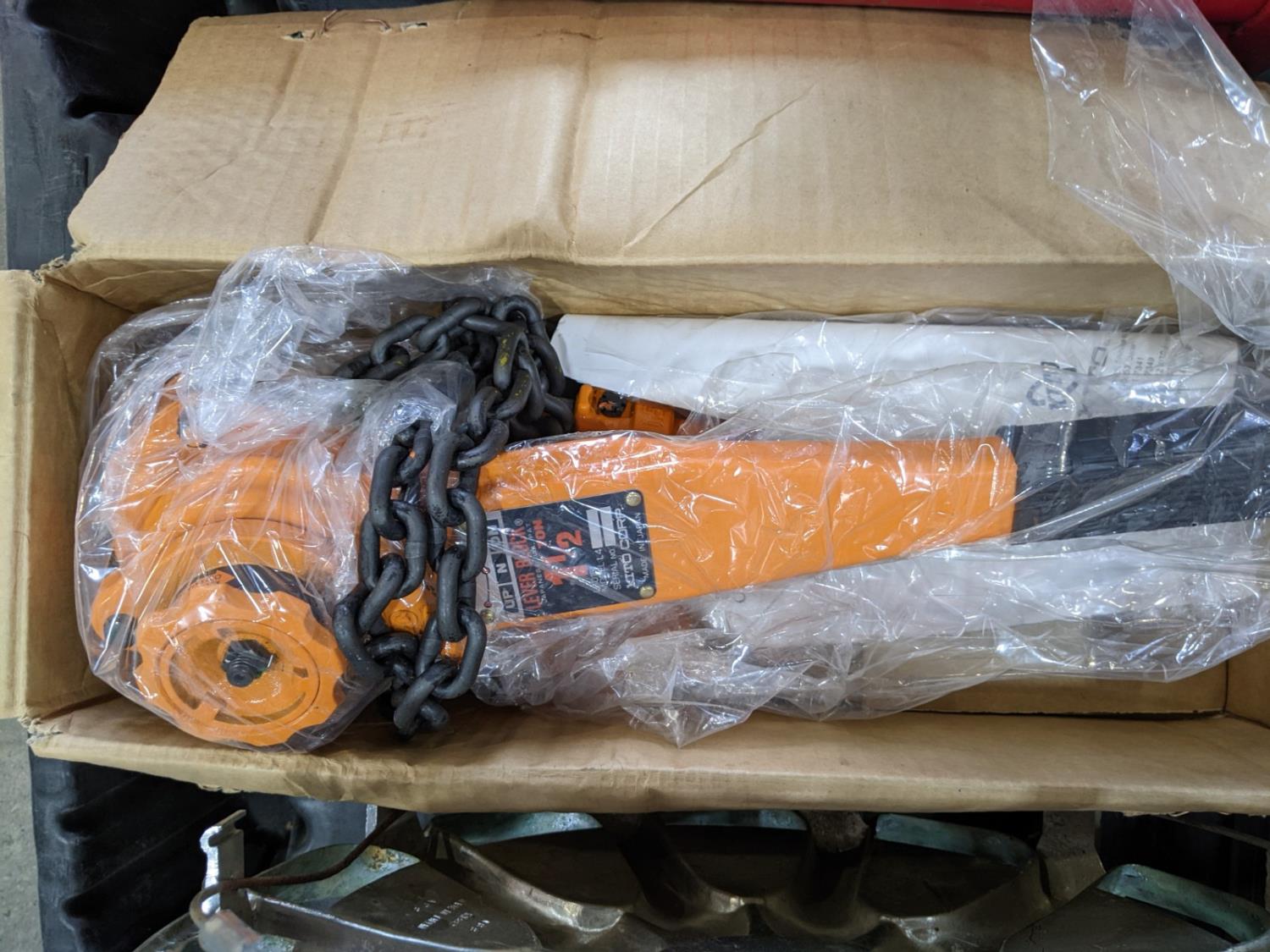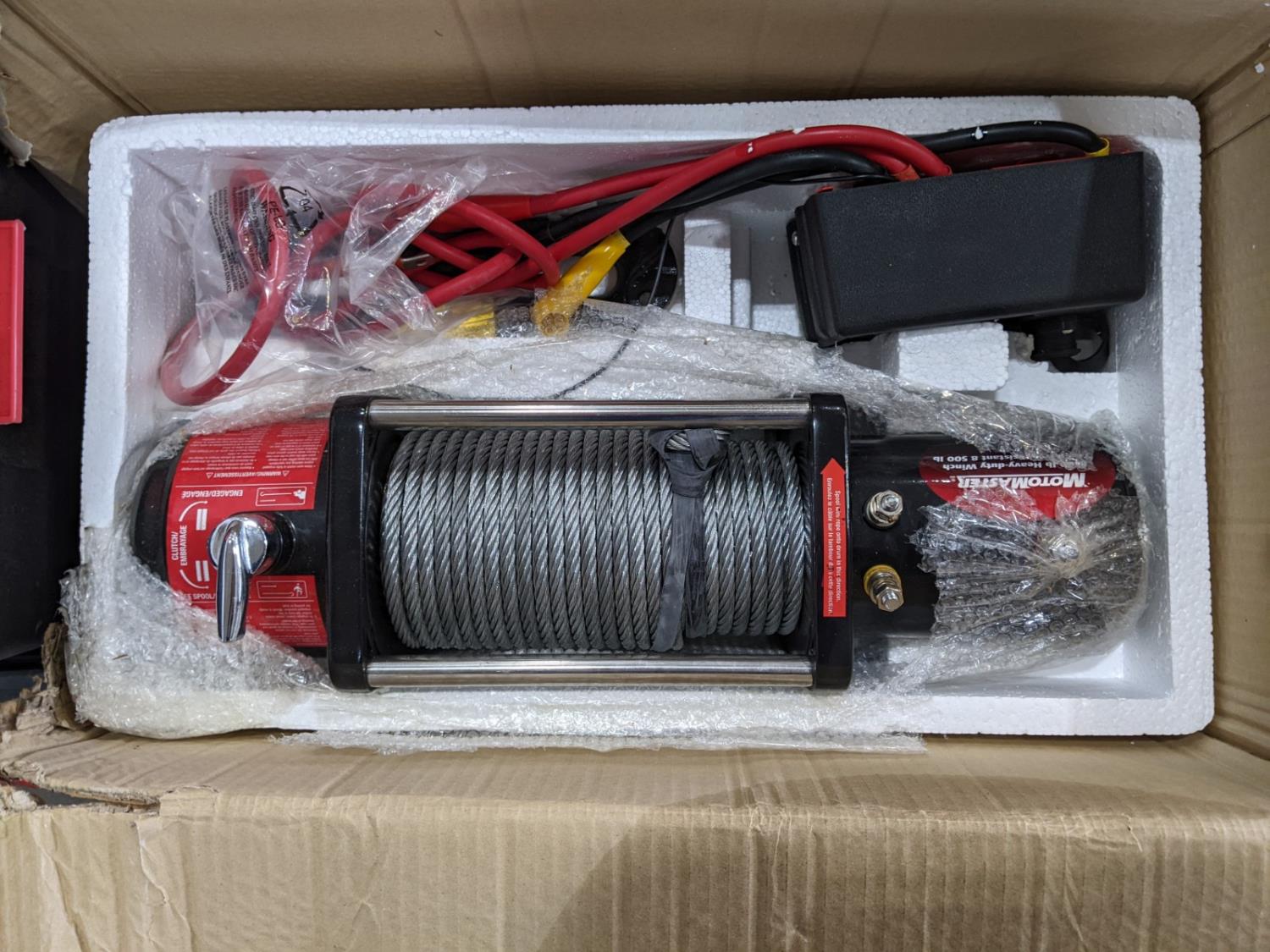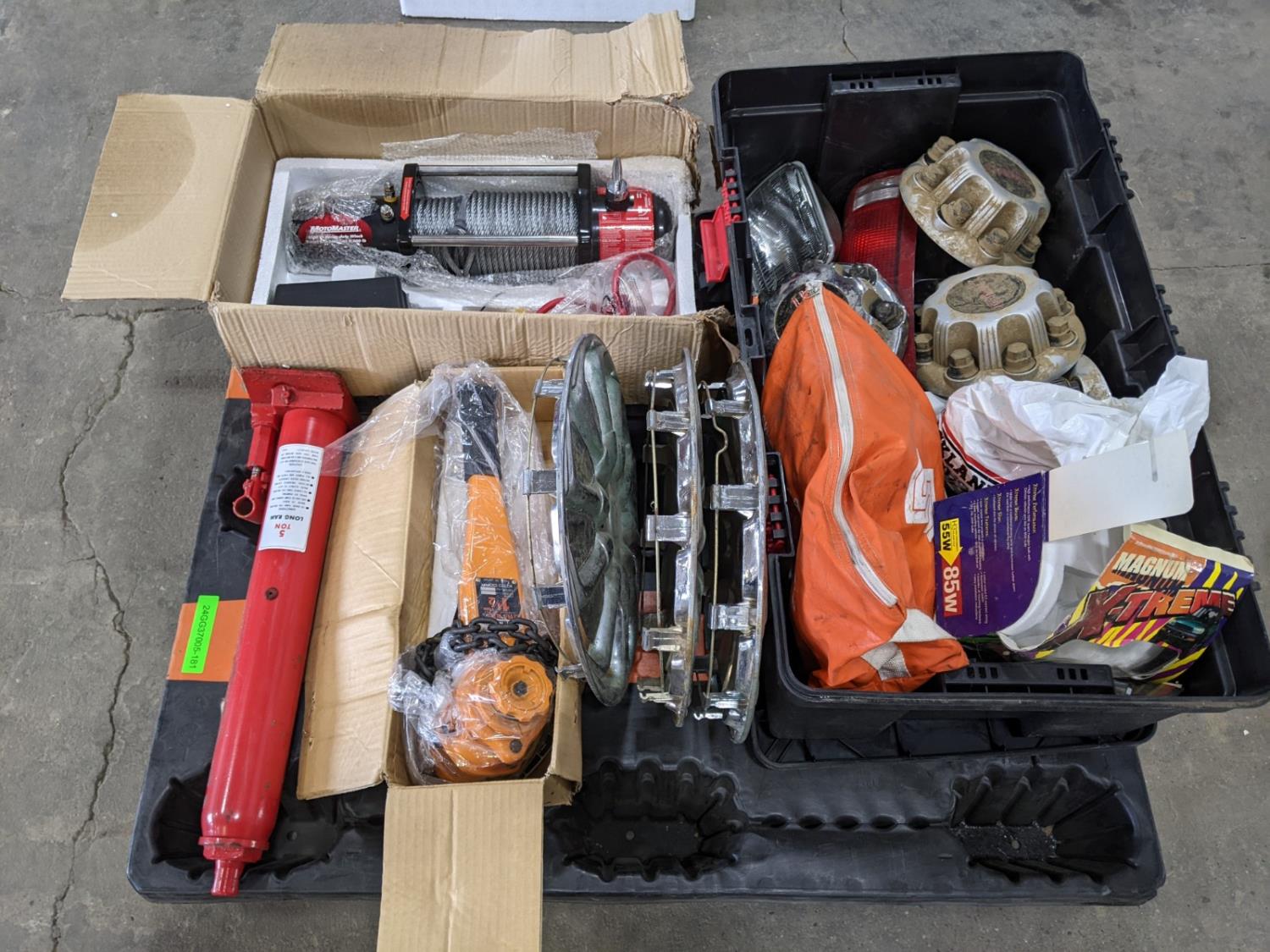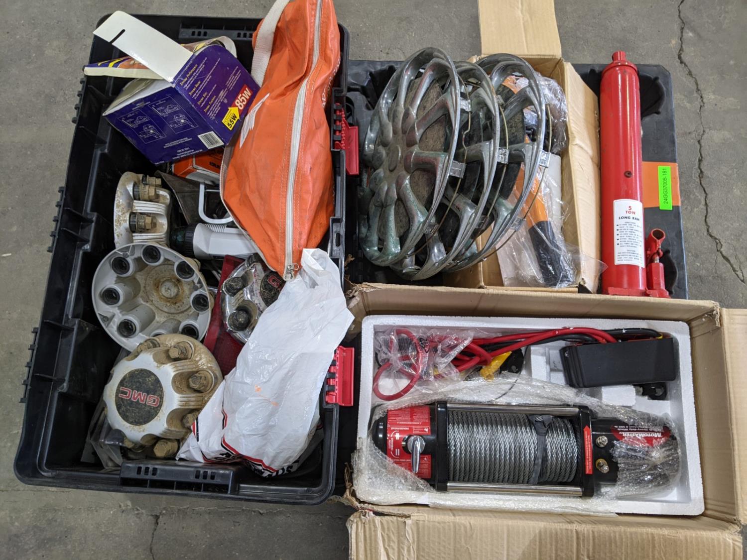 Kito 1-1/2 ton come-a-long (unused), Motomaster 8,500 lb heavy duty cable winch (unused), 5 ton long ram bottle jack (unused), tote of assorted GMC parts, booster cables and lights