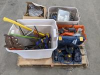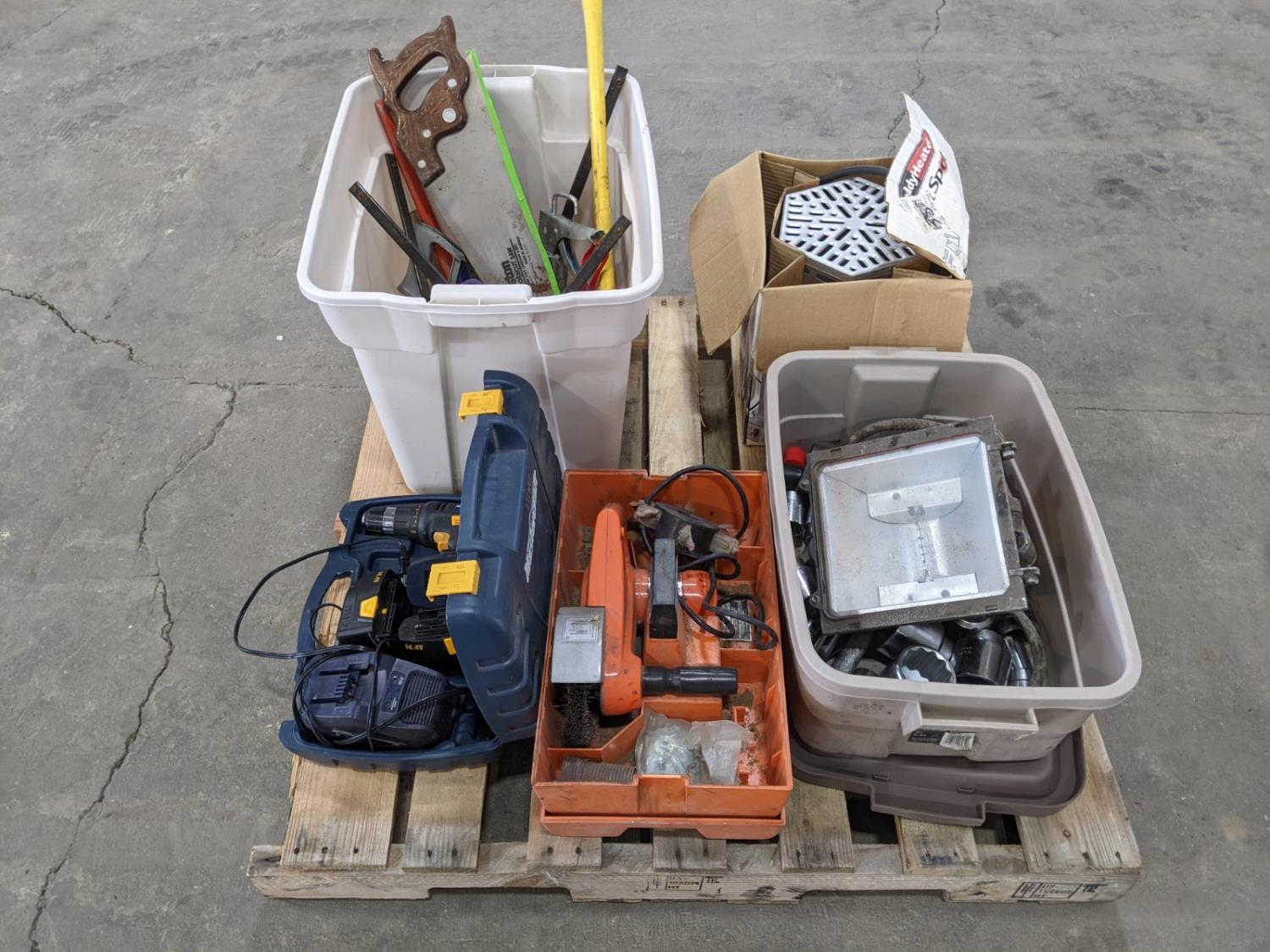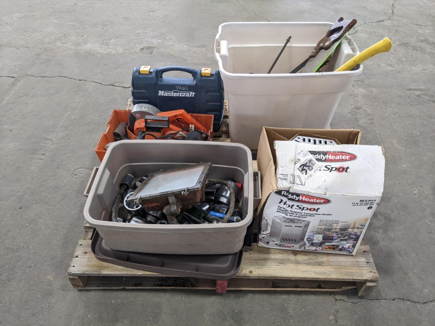 Mastercraft 3/8 inch drill with battery and charger, tote of assorted clamps and hand saws, Reddy Heater Hot Spot portable propane convection heater (unused), tote of assorted sockets and ratchets, Black & Decker work wheel