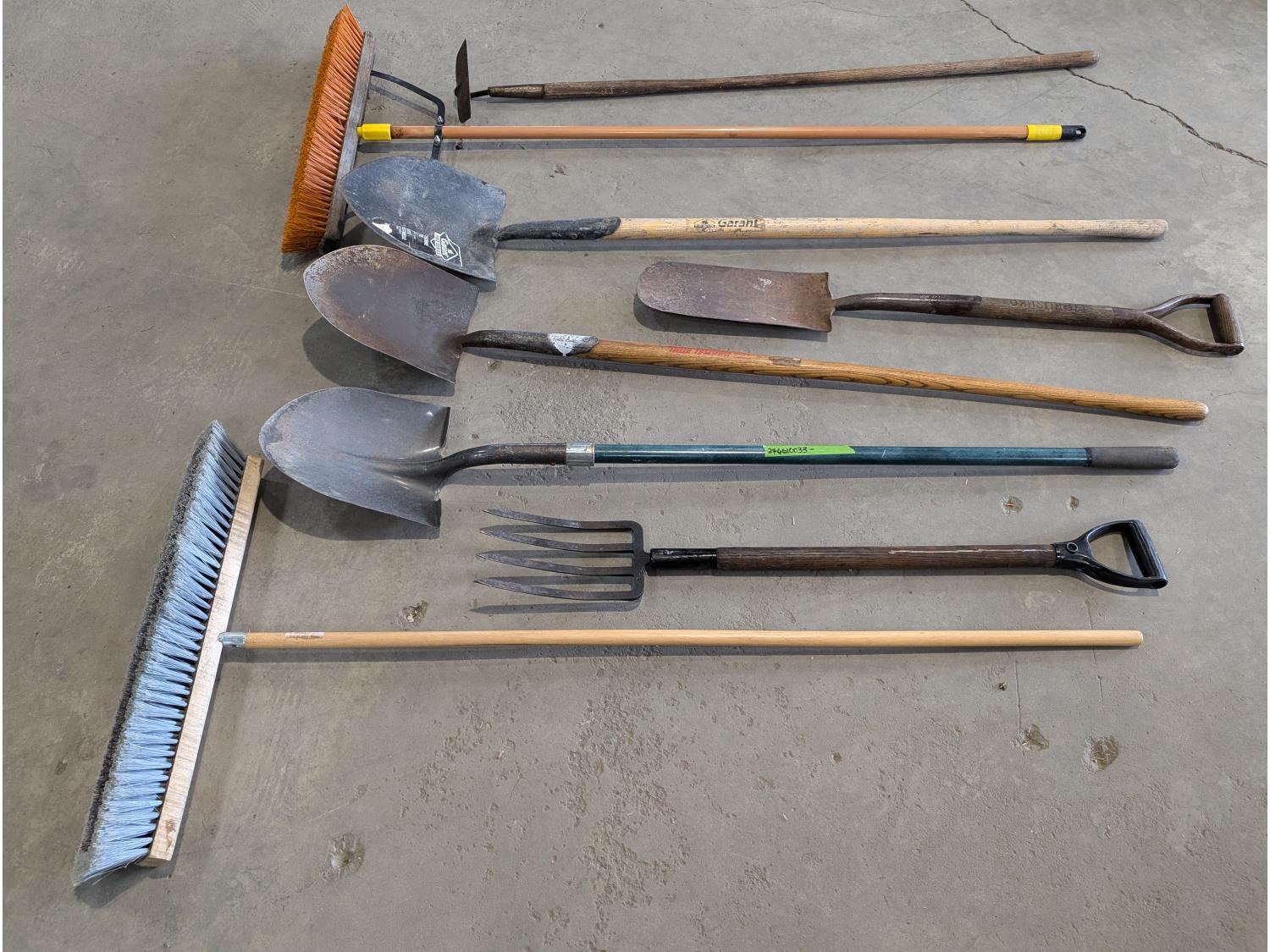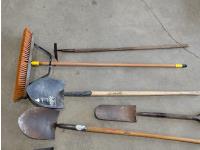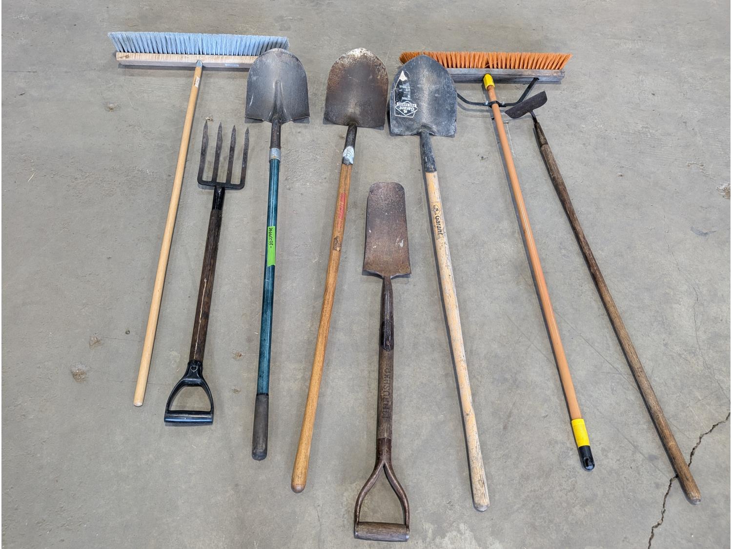 brooms, shovels, pitch fork, hoe