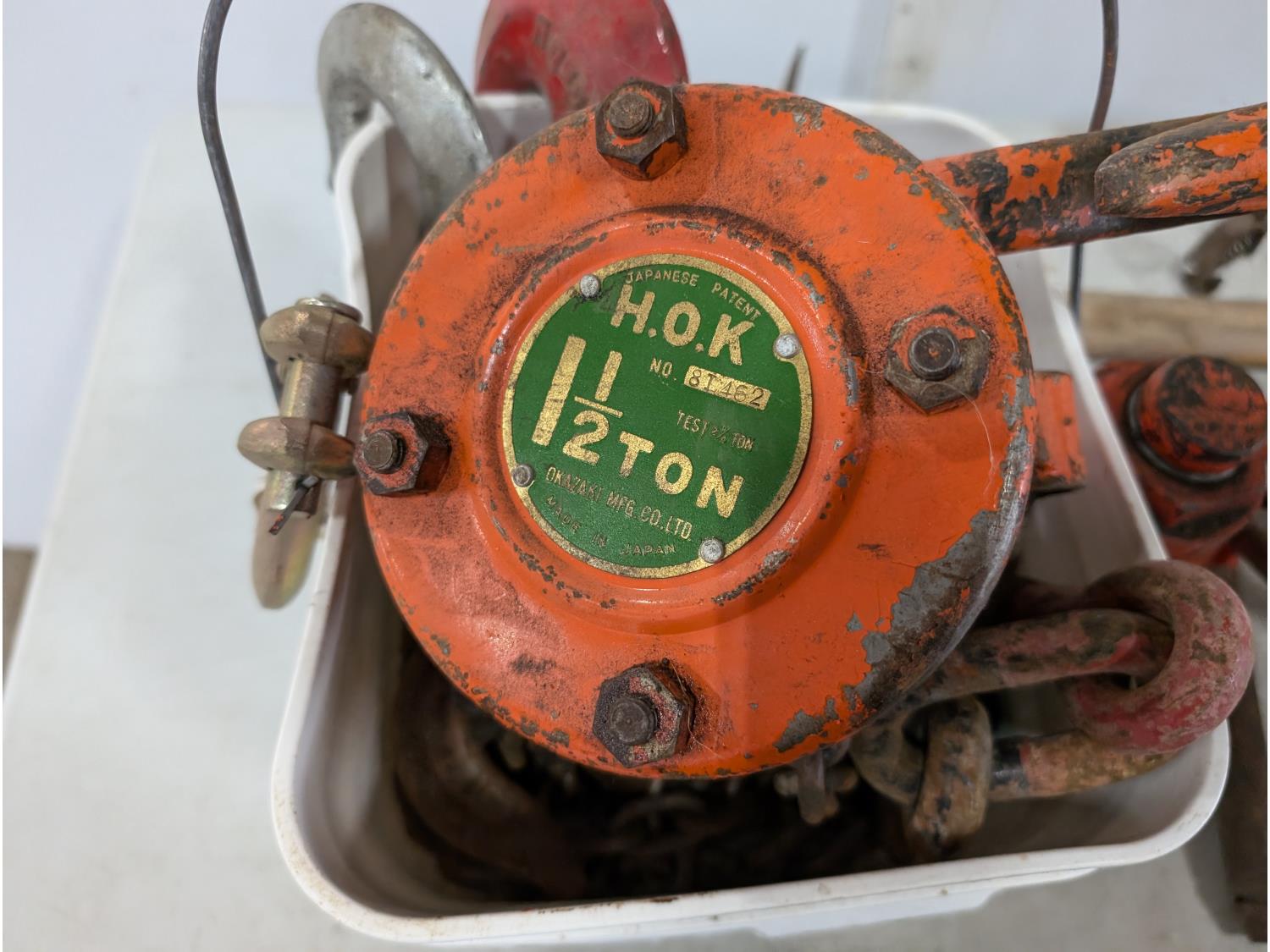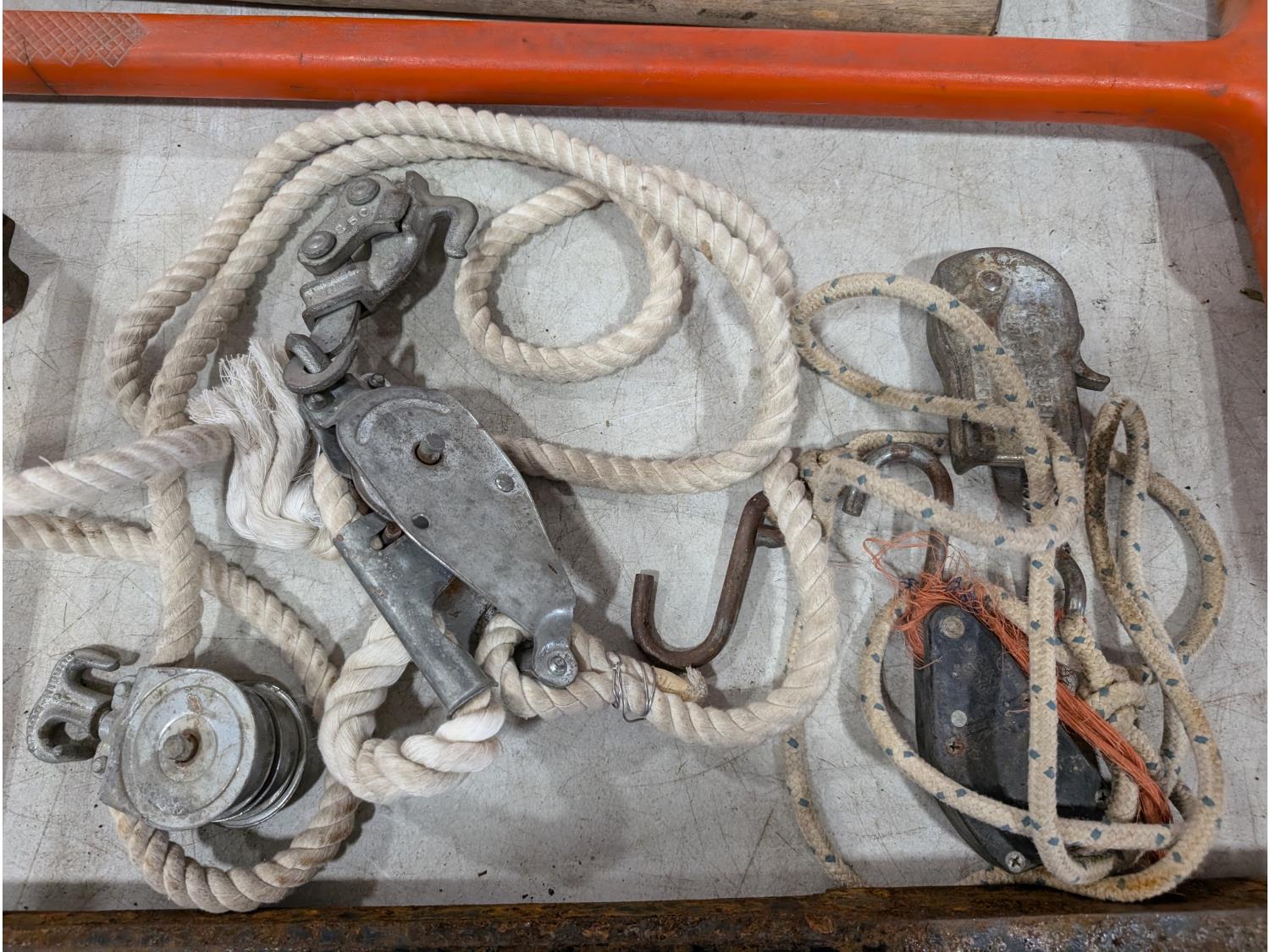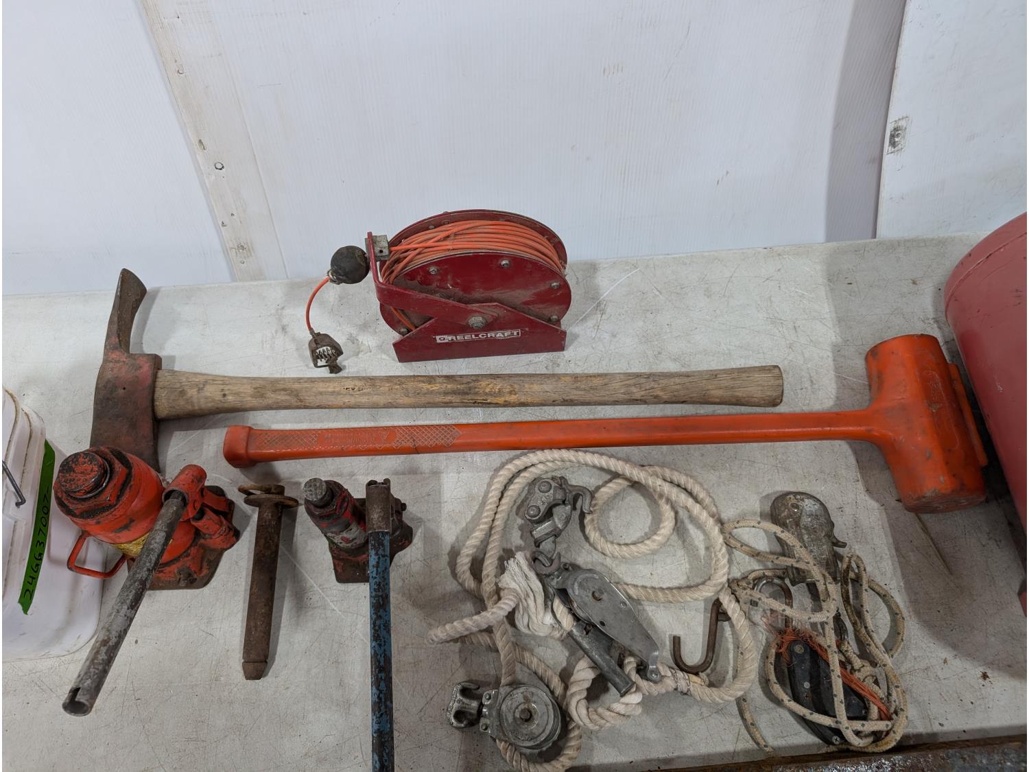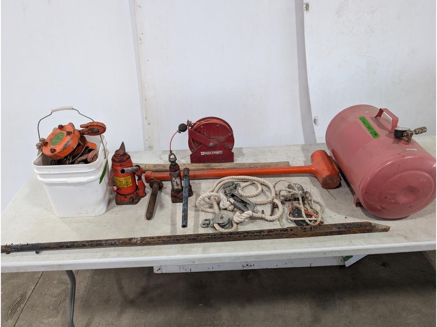 Air tank, Bottle jacks, 1.5 ton chain hoist, sledge hammer, tamping bar, Pulaski axe