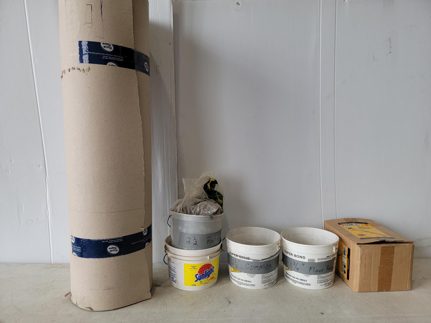 31" temporary floor protection, 3" cabinet installation screws, 2-1/2" roofing nails, 2-1/2" common nails, 1-3/4" floor nails
