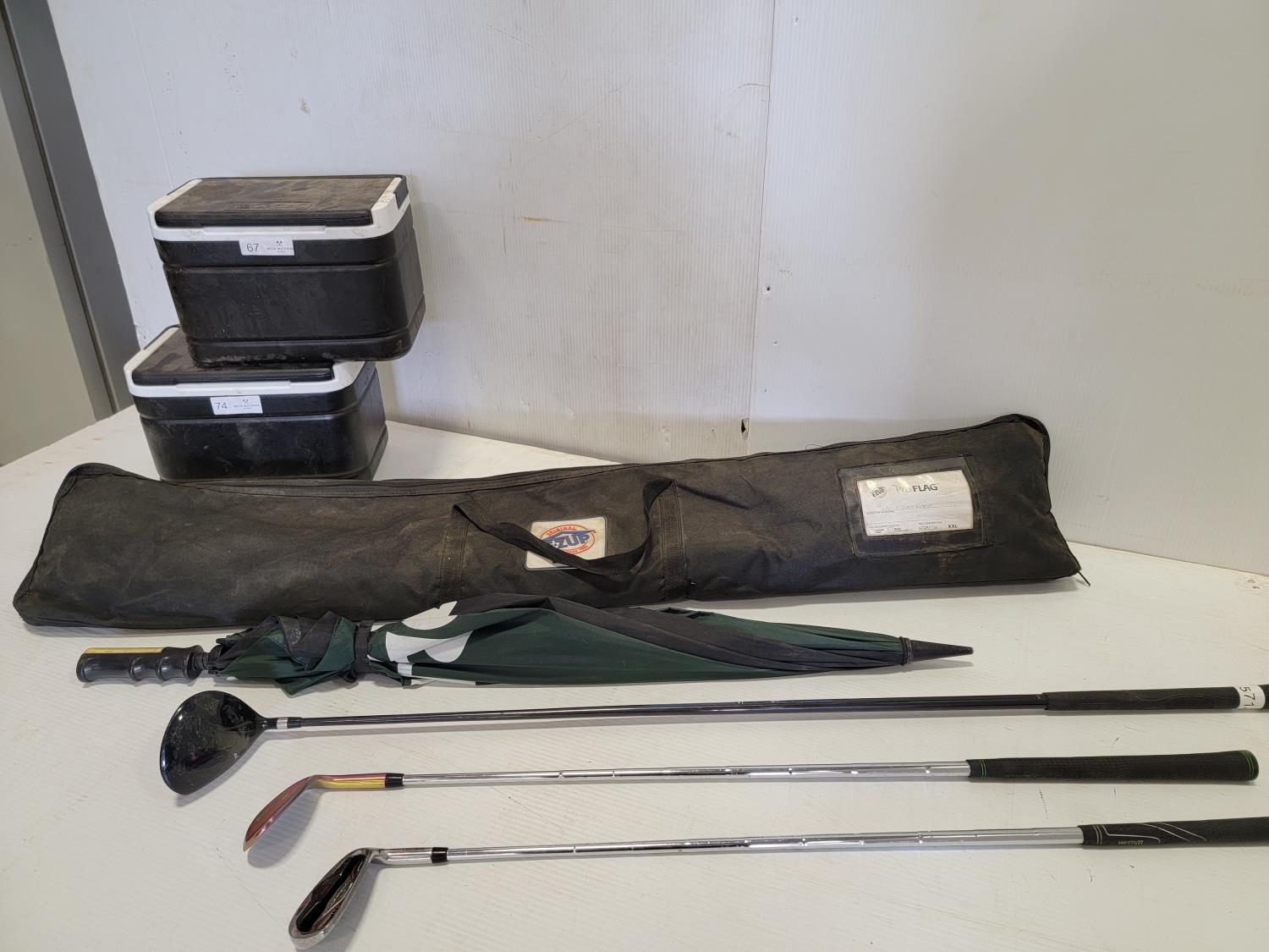 5047 E-ZUP Pro Flag, (3) Golf Clubs, Umbrella and (2) Club Car Coolers