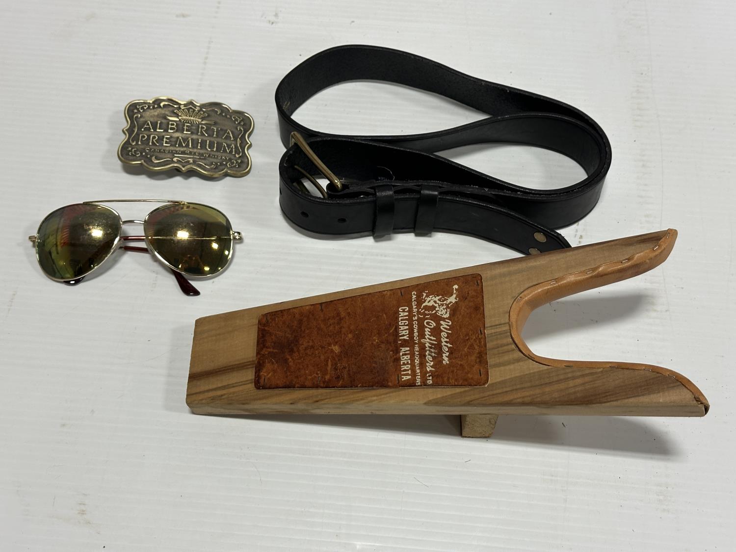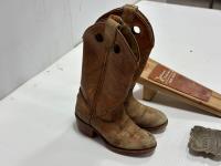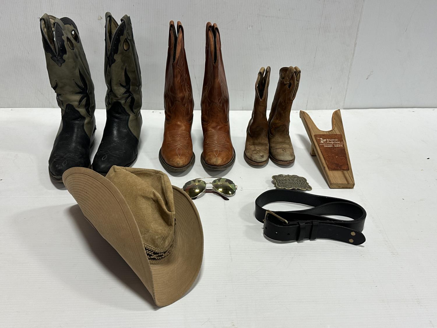 size 9 mens, size 6.5 womens, child boots, cowboy hat, sunglasses, belt, boot horn