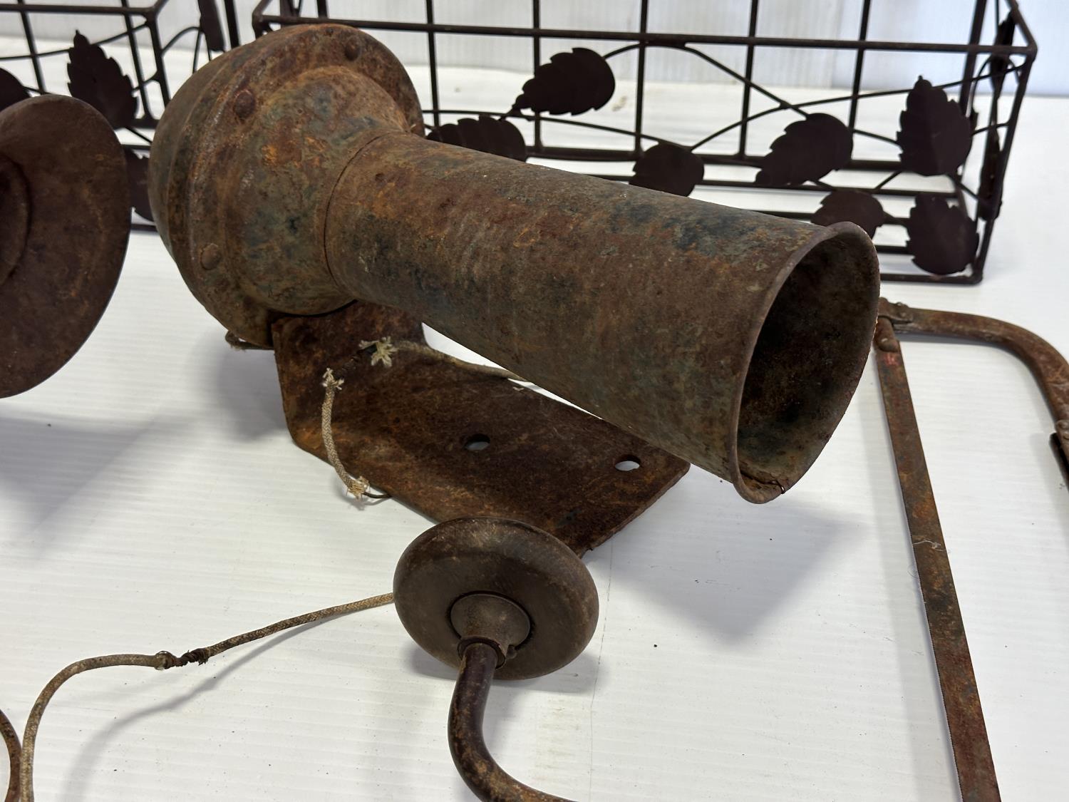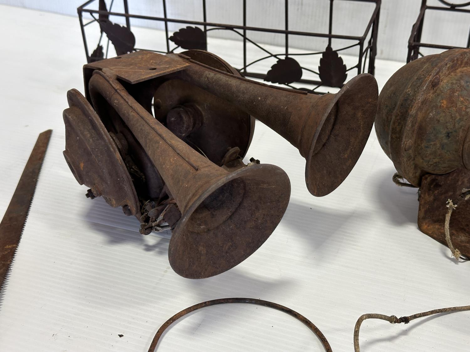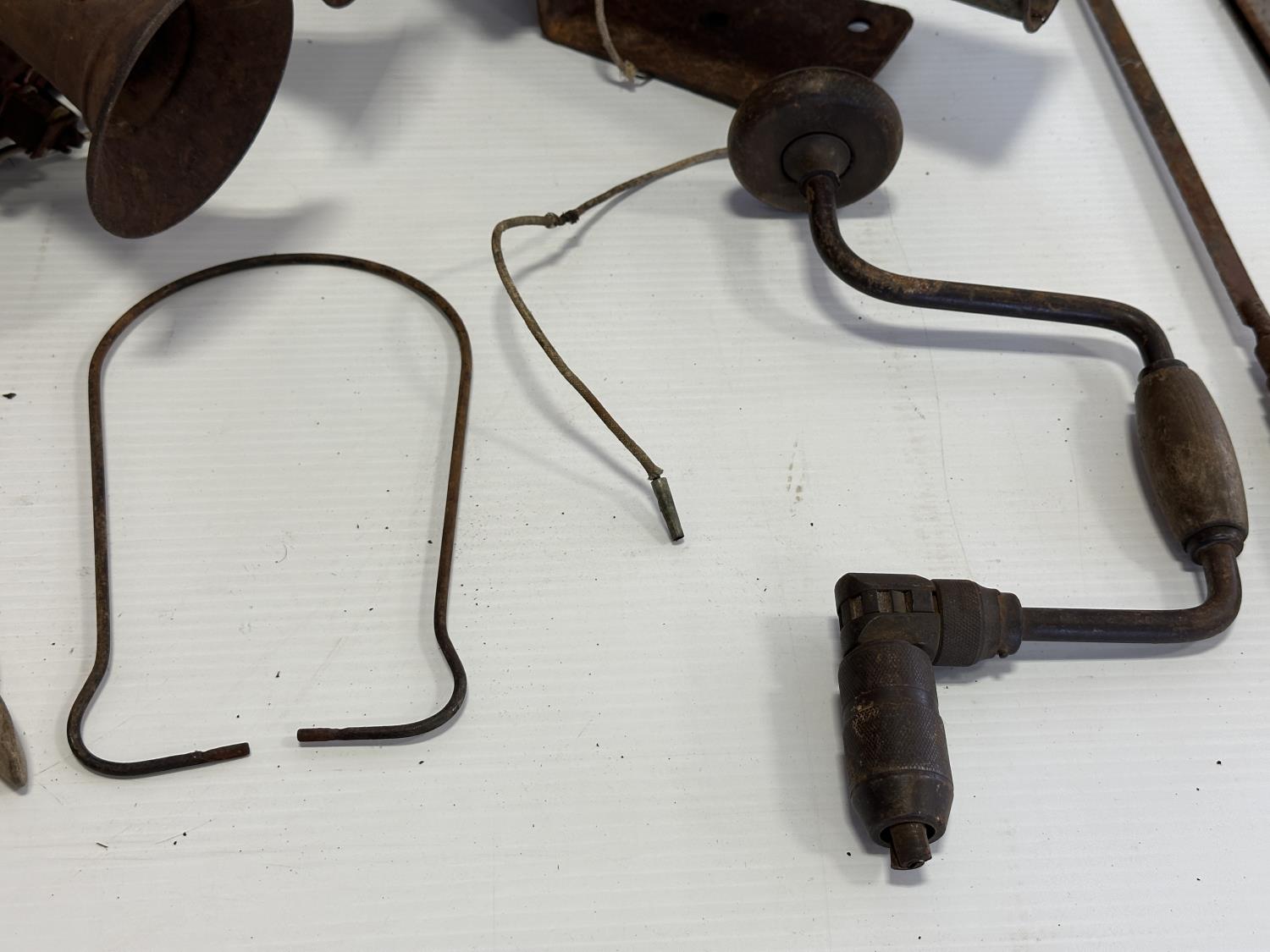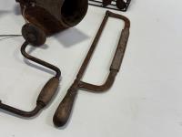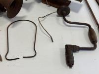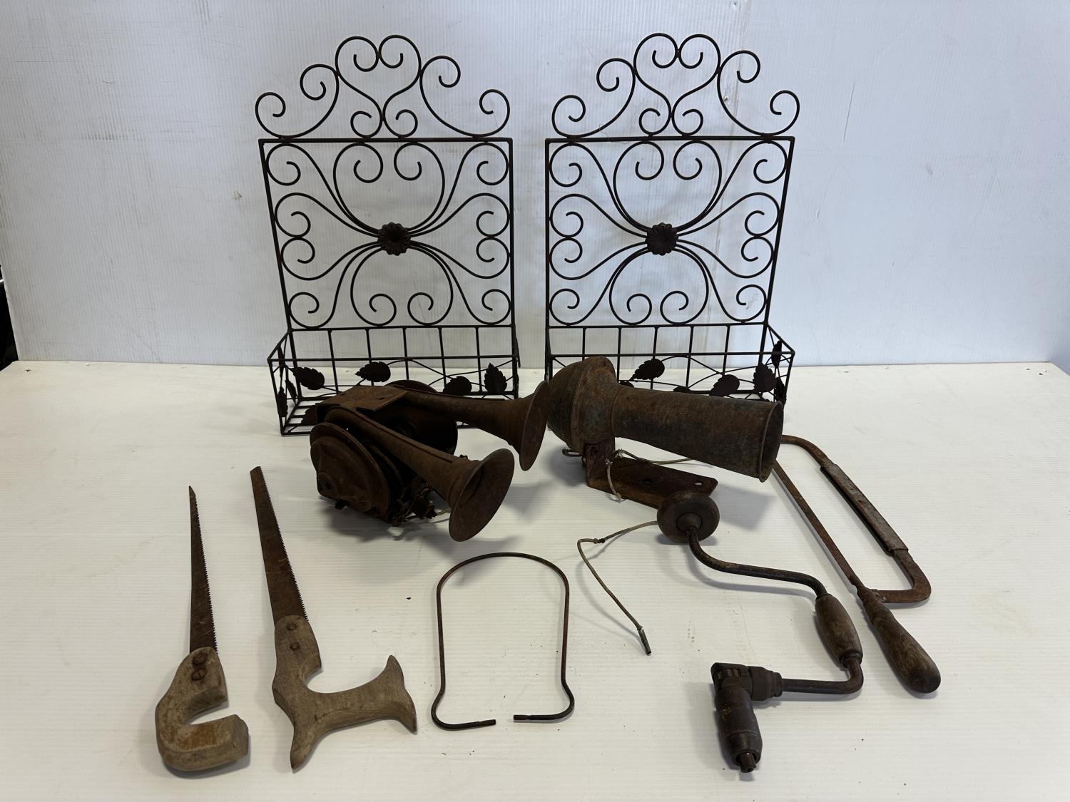 tractor horns, hand saws, manual drill, decorative wall mounts