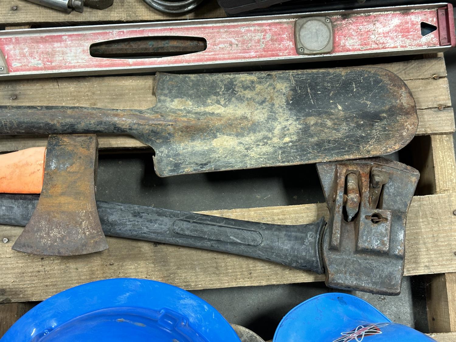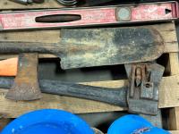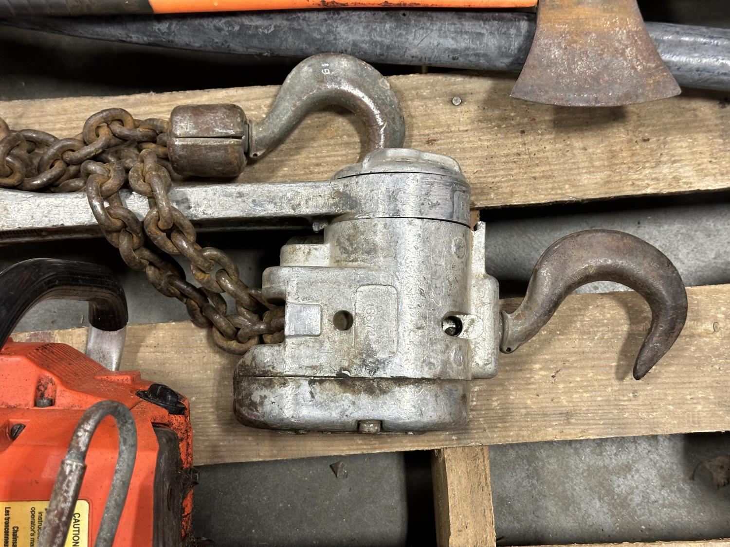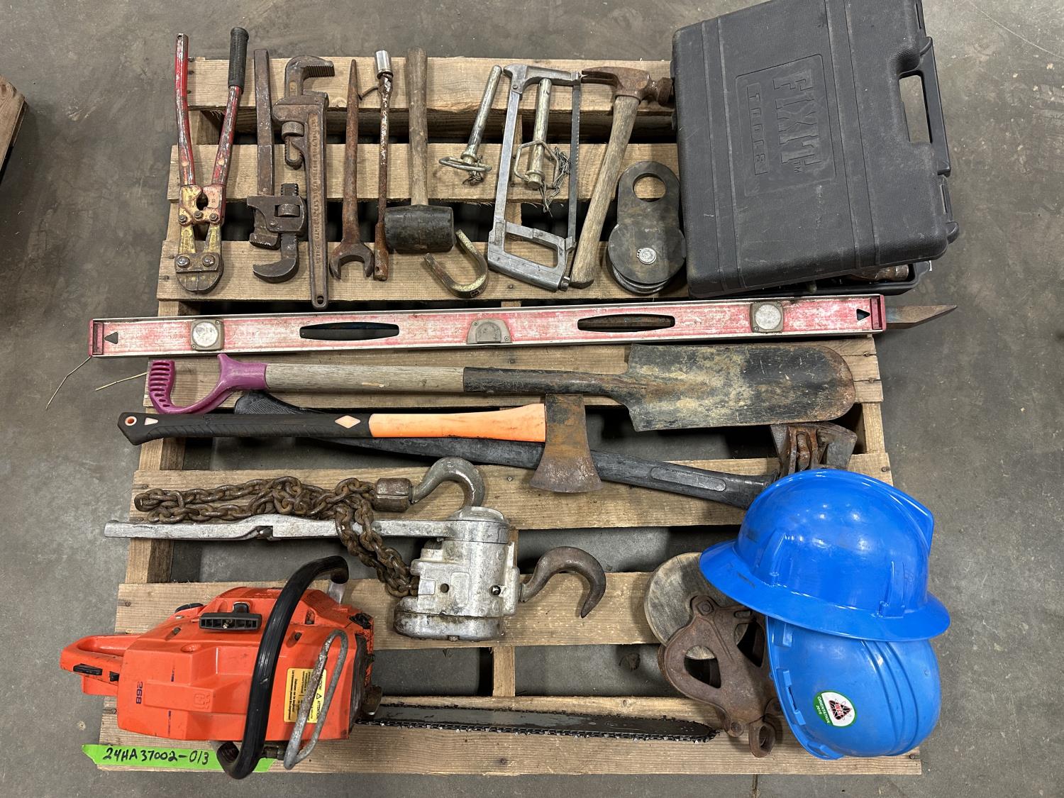 Husqvarna chainsaw, hard hats, come-along, spade, level, axes, pipe wrenches, bolt cutters, combination wrenches, screwdrivers, pulleys, 5TH wheel lock, hand saw, mallets, hammer