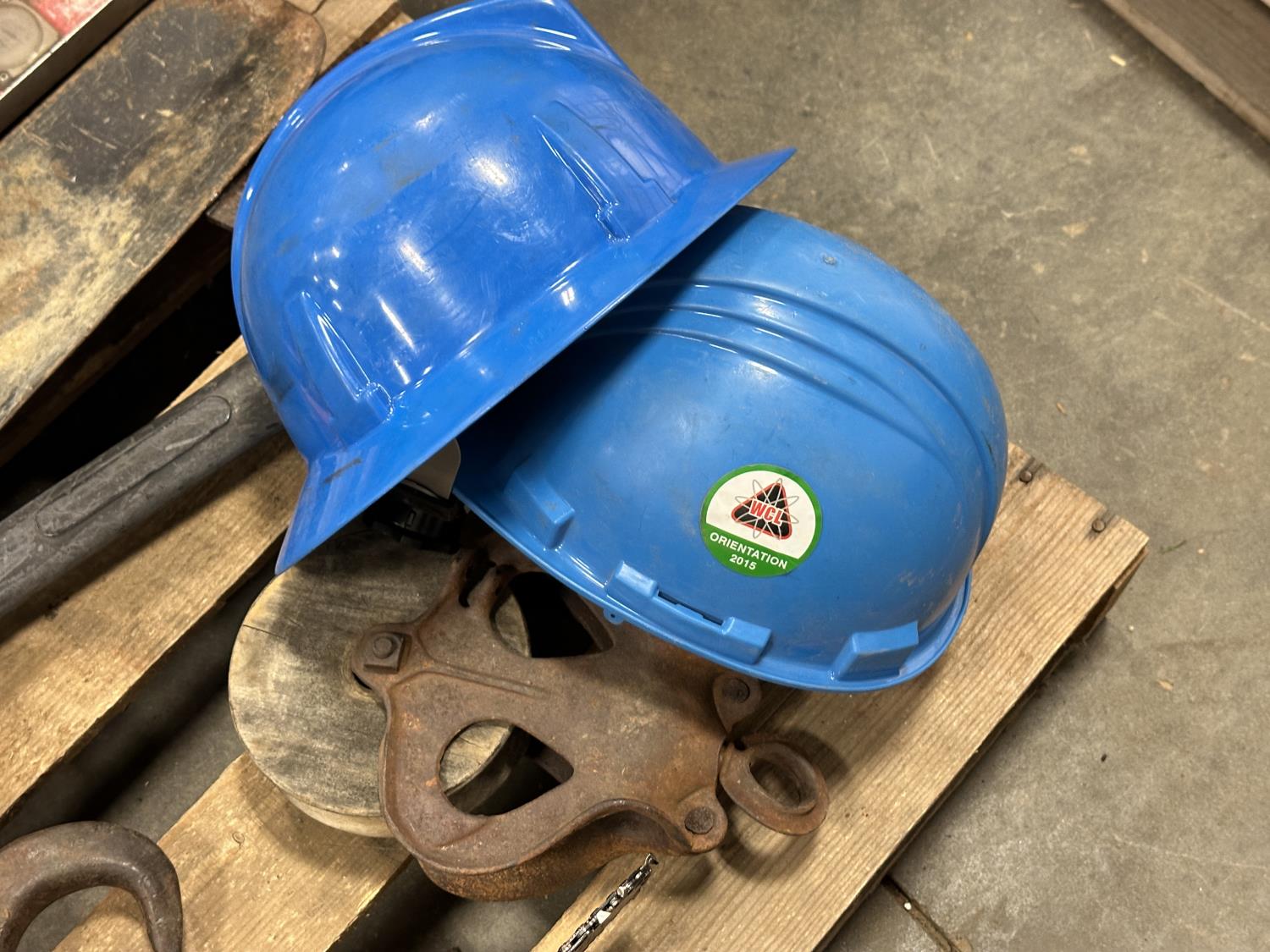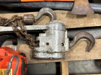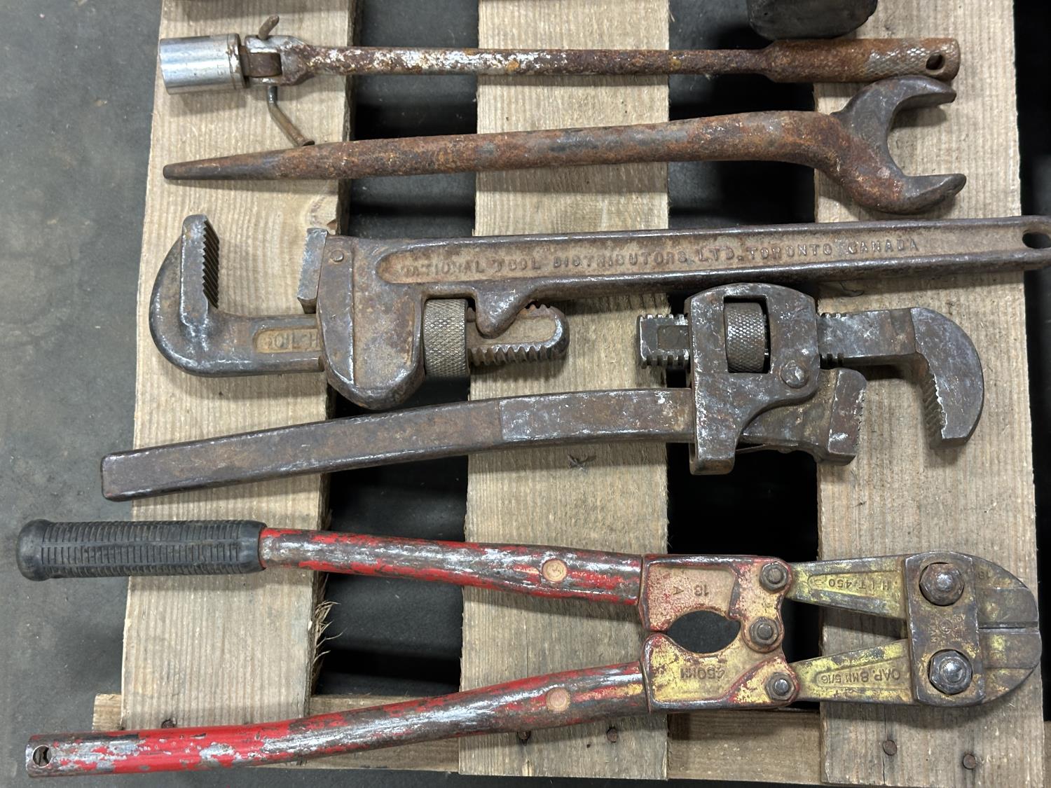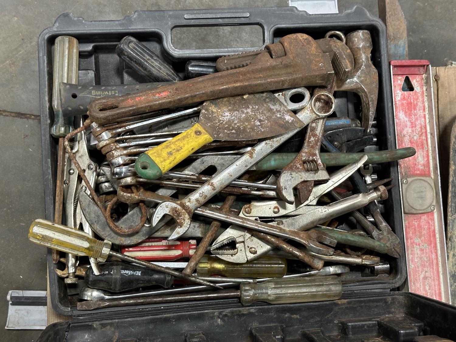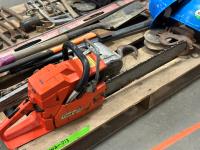 Husqvarna chainsaw, hard hats, come-along, spade, level, axes, pipe wrenches, bolt cutters, combination wrenches, screwdrivers, pulleys, 5TH wheel lock, hand saw, mallets, hammer