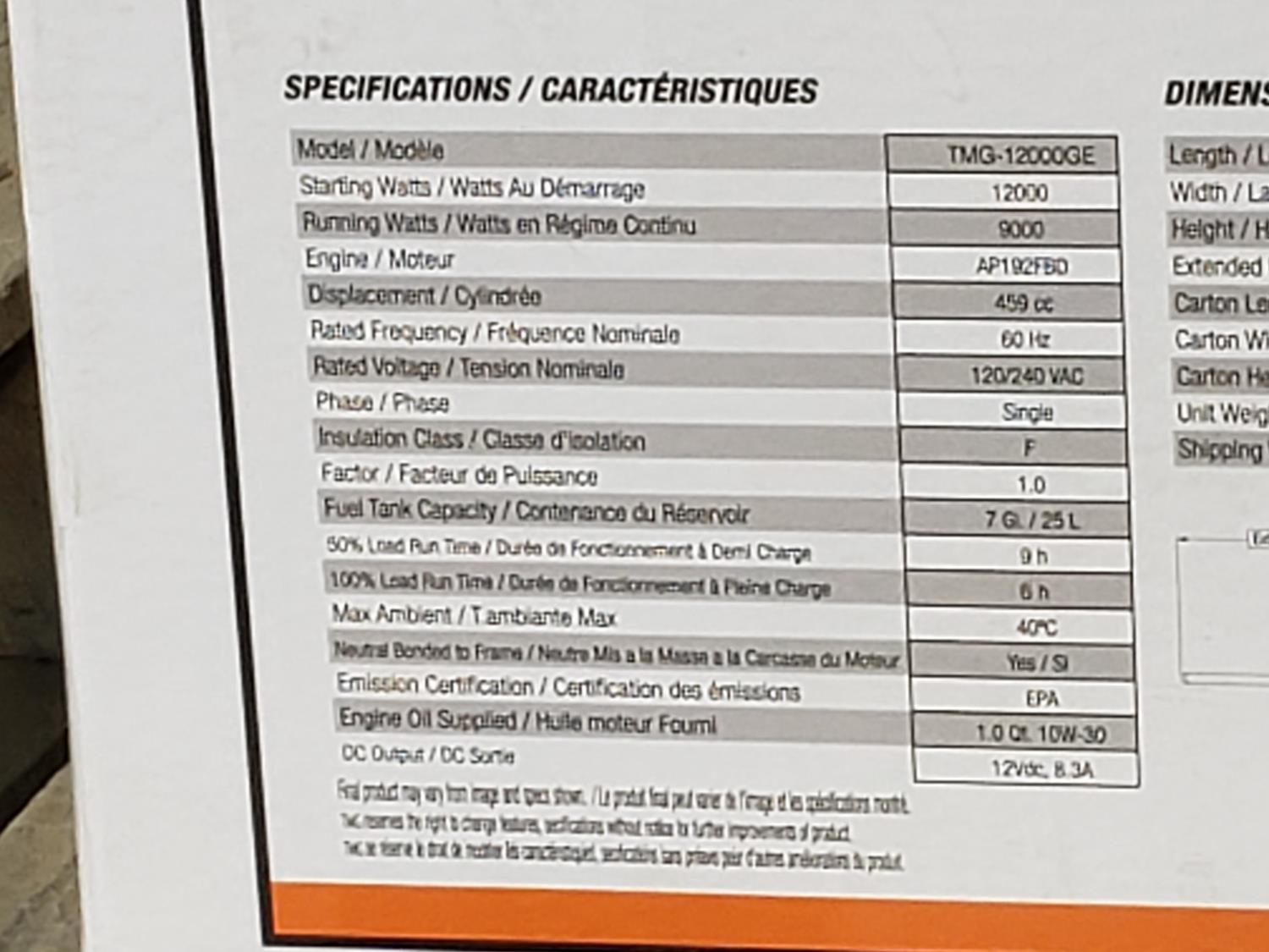 459 cc engine, (4) 120V 20A, (1) 120V 30A, (1) 120/240V 50A, electric start