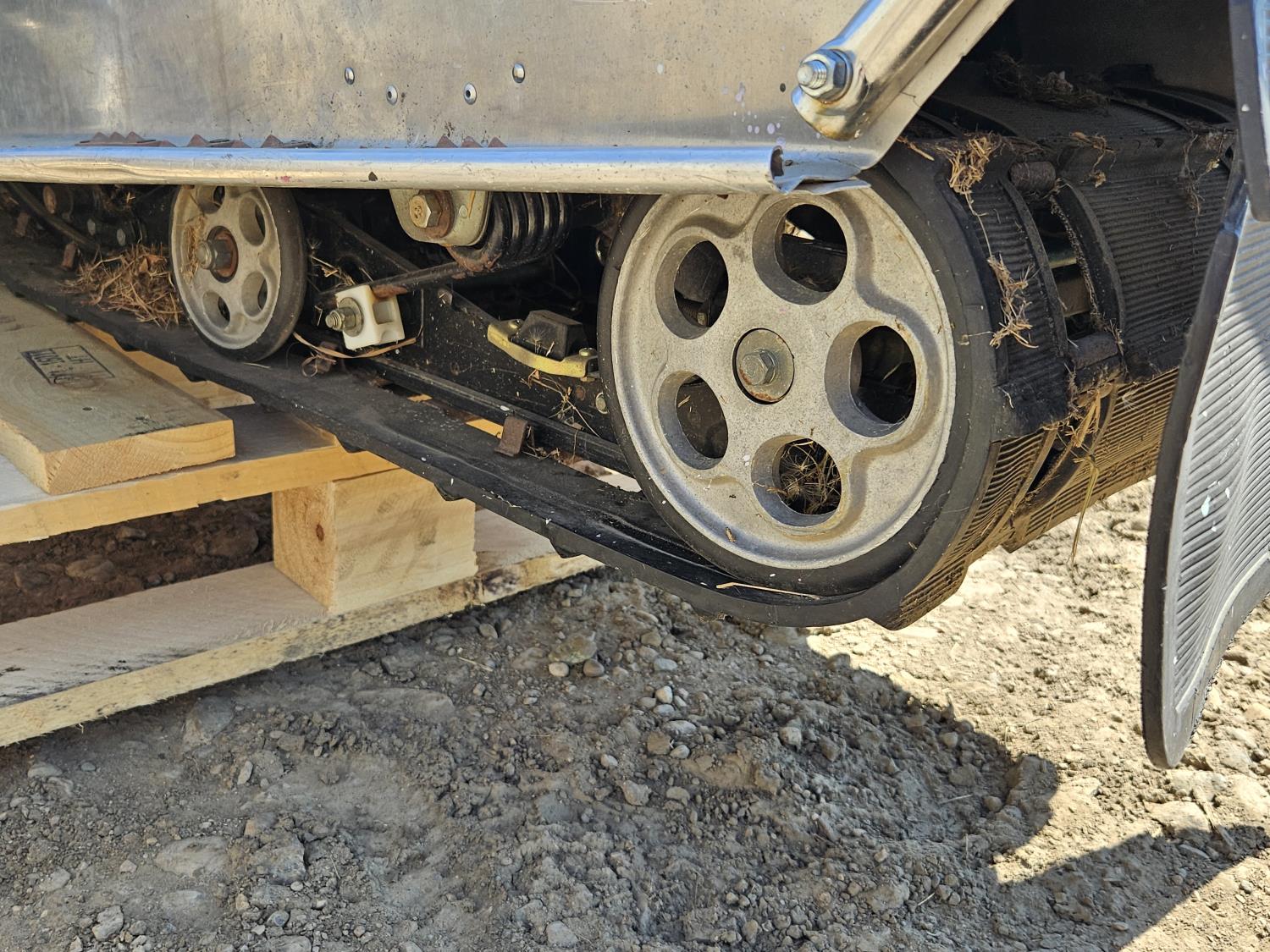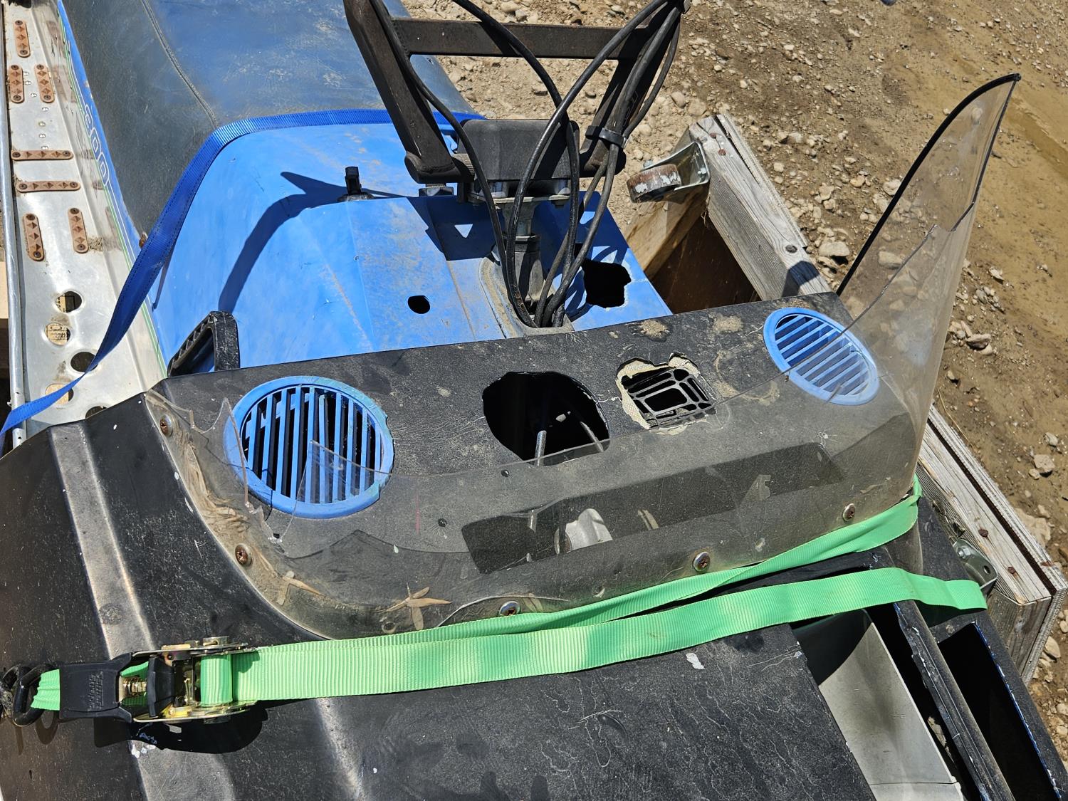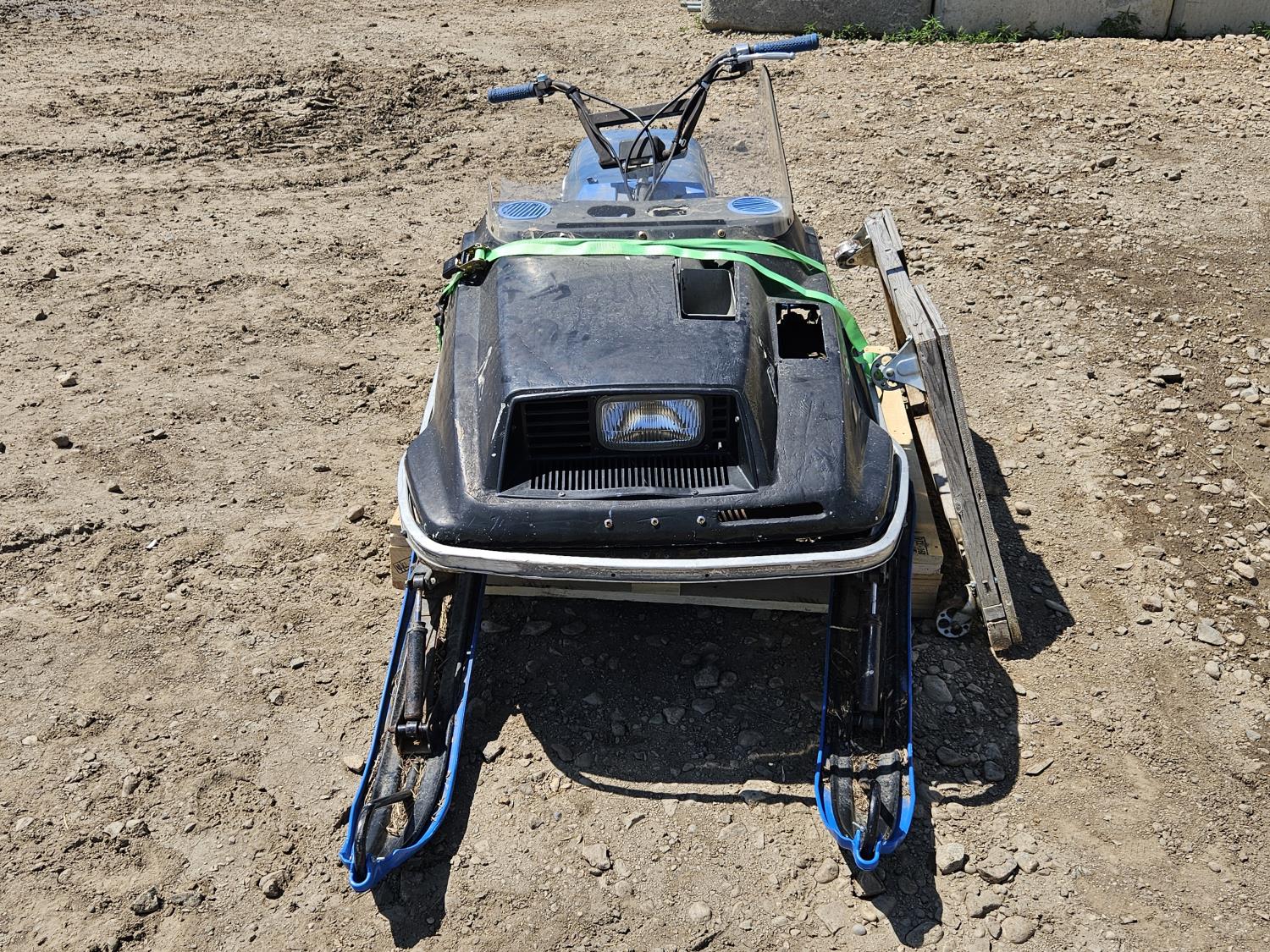 Windshield and taillight broken, needs carburetor cleaning, fuel drained, pull chord shortened to fit previous owner, includes straps and platform with castors for track