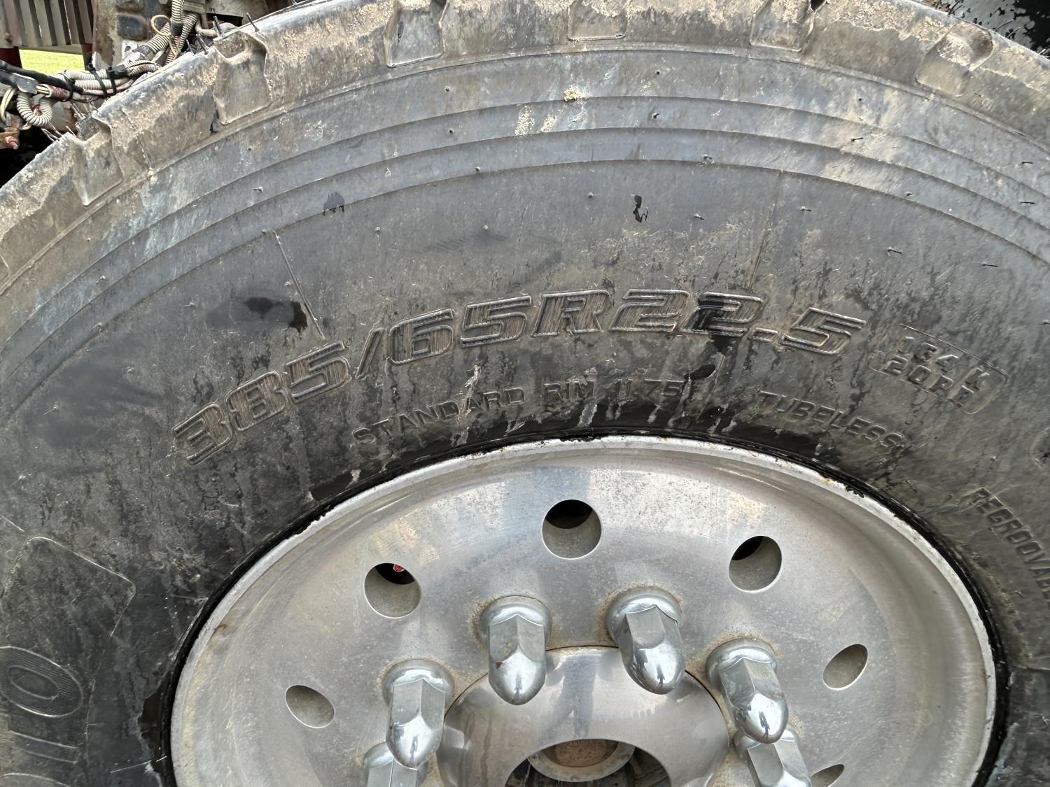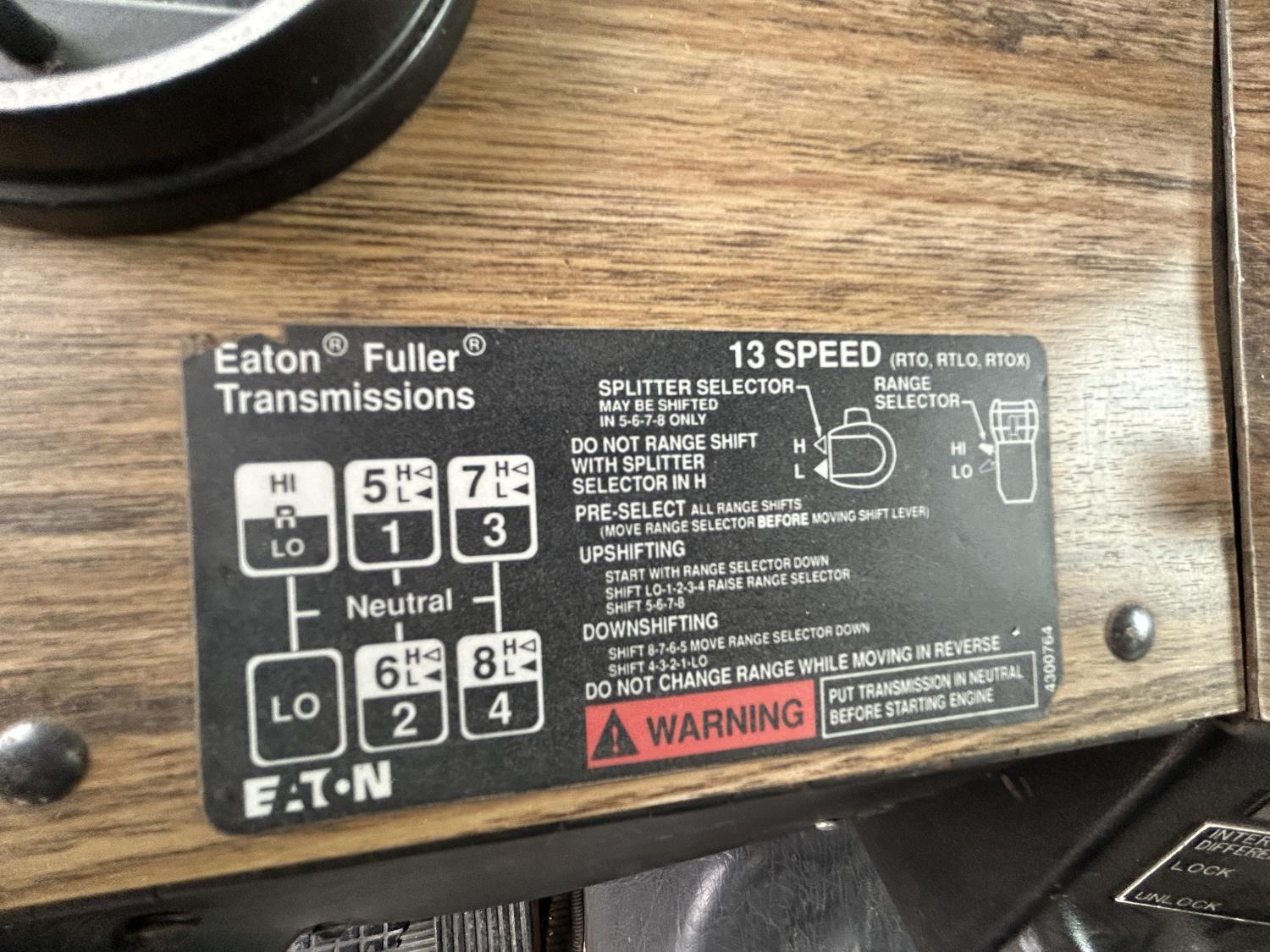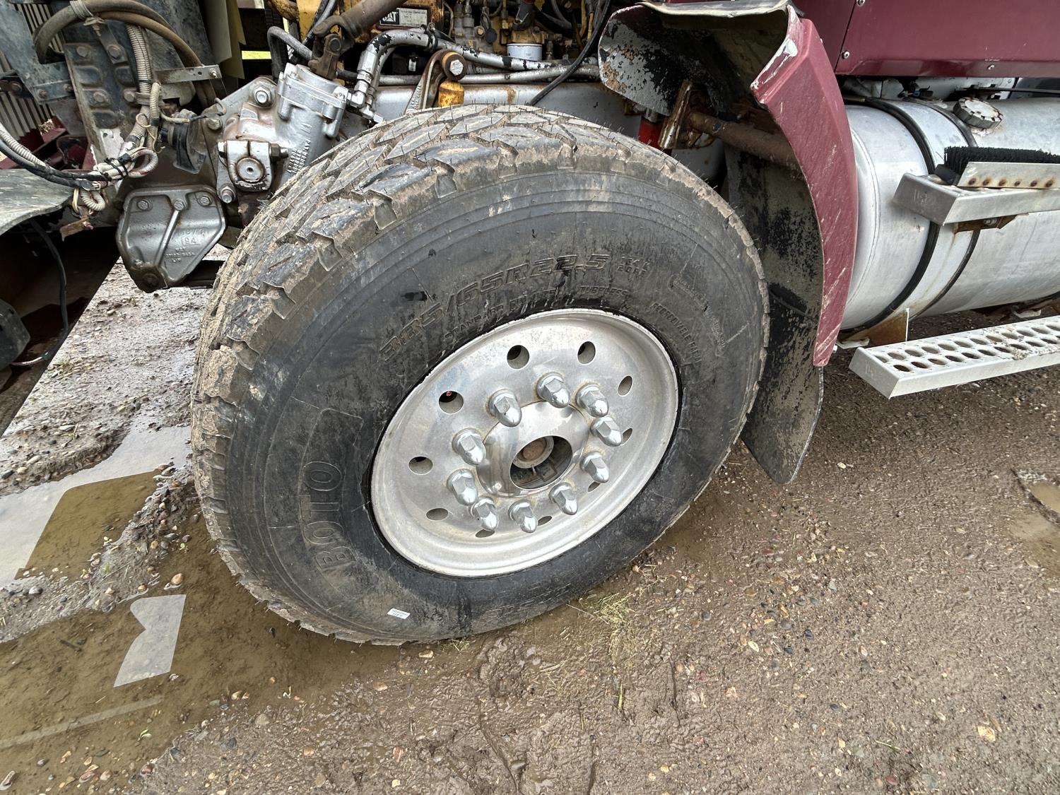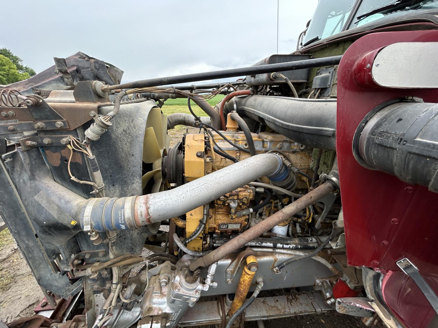 Caterpillar 3406E 6 cylinder 410 HP diesel engine, engine block heater, Eaton Fuller 13 speed manual transmission, A/C, cruise control, air ride seats, radio, stereo, hydraulic wet kit, aluminum tool boxes, 22 ft box, hoist, air ride cab, roll tarp, air ride suspension, 12,000 lb front axle, 46,000 lb rear axles, diff lock, 288 inch WB, all aluminum wheels, 385/65R22.5 front tires, 11R24.5 rear tires