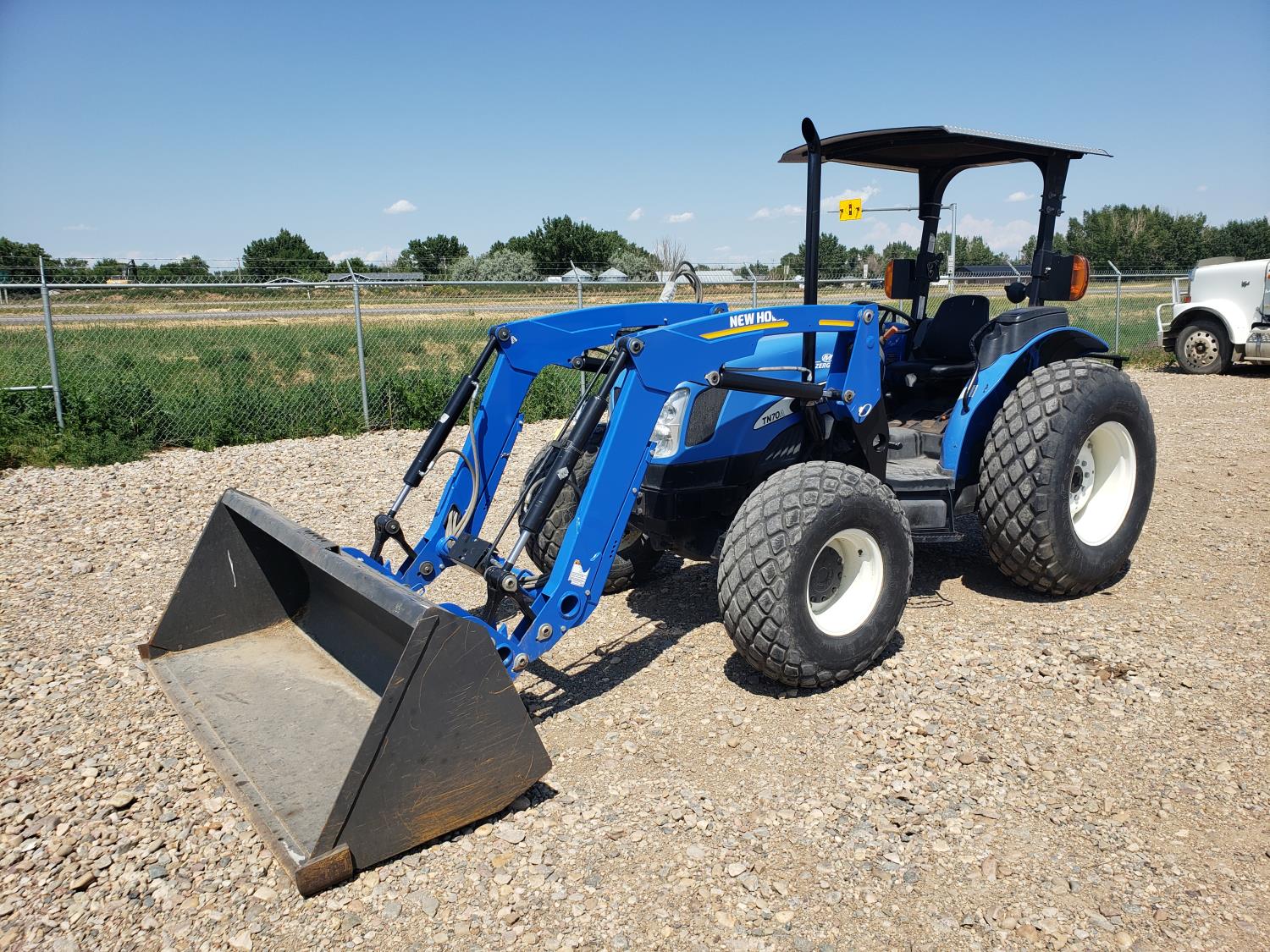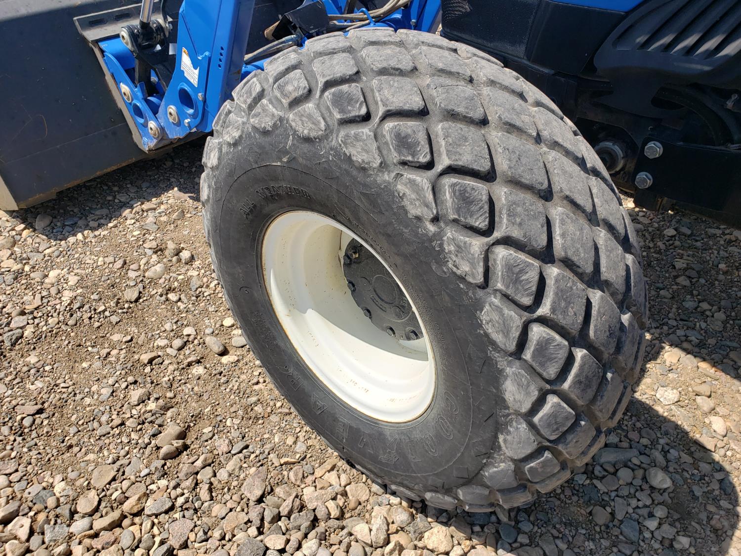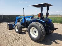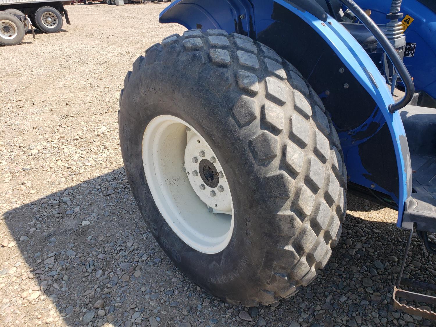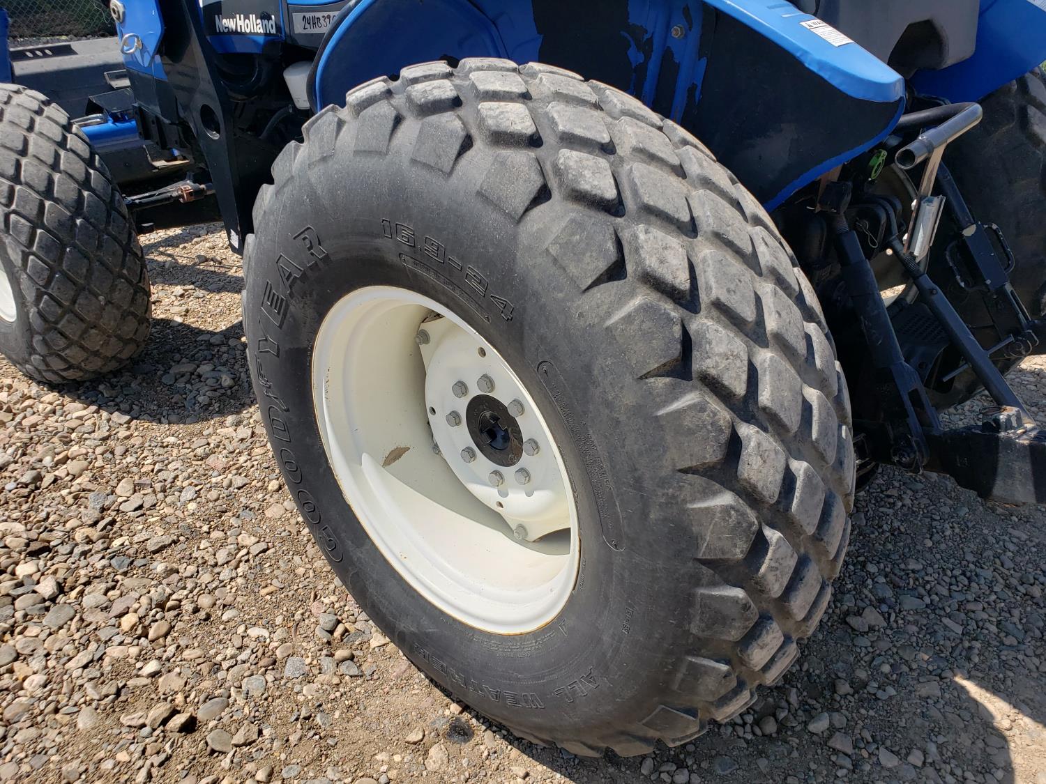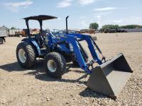 New Holland loader, 84 inch bucket, mid mount hydraulic connection, Iveco 2.9 L 70 HP, engine, 57 PTO HP, open station platform, ROPS, left hand reverser, 540 PTO, 3 point hitch, 1 rear hydraulic outlets, 13.6-16.1 front tires, 16.9-24 rear tires