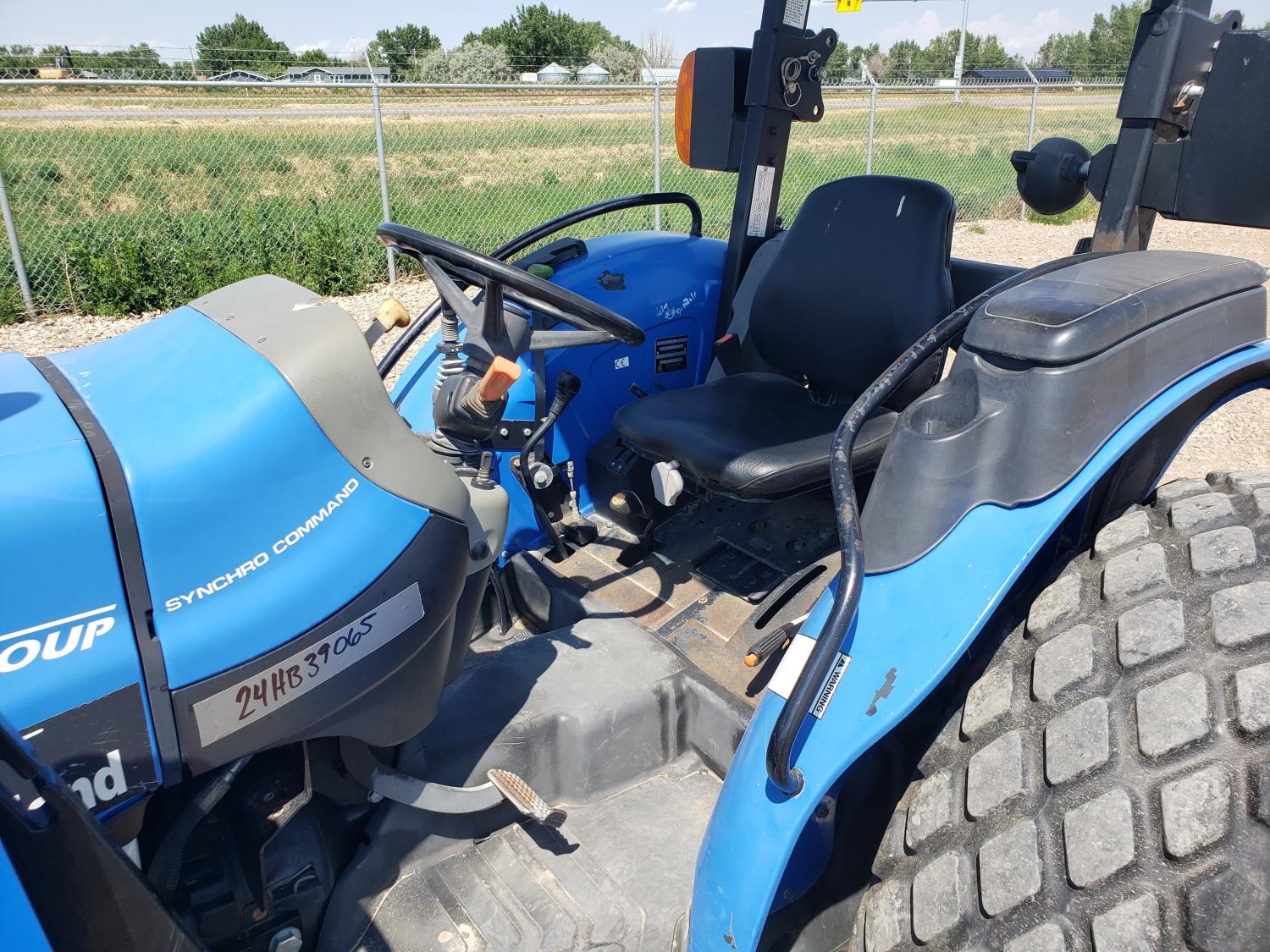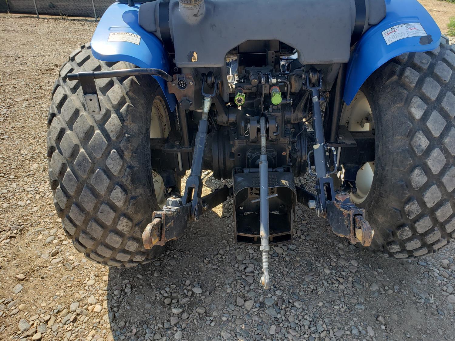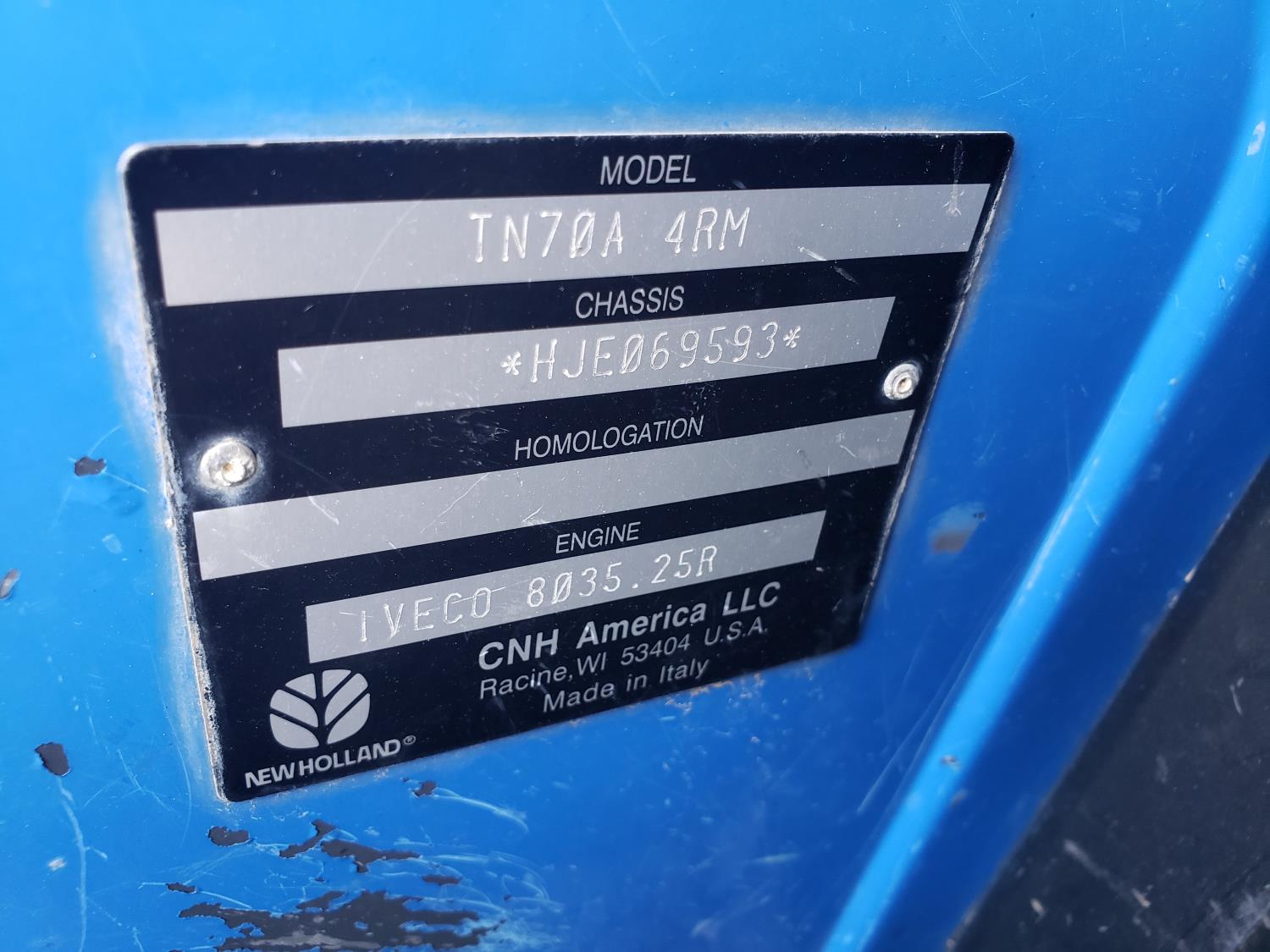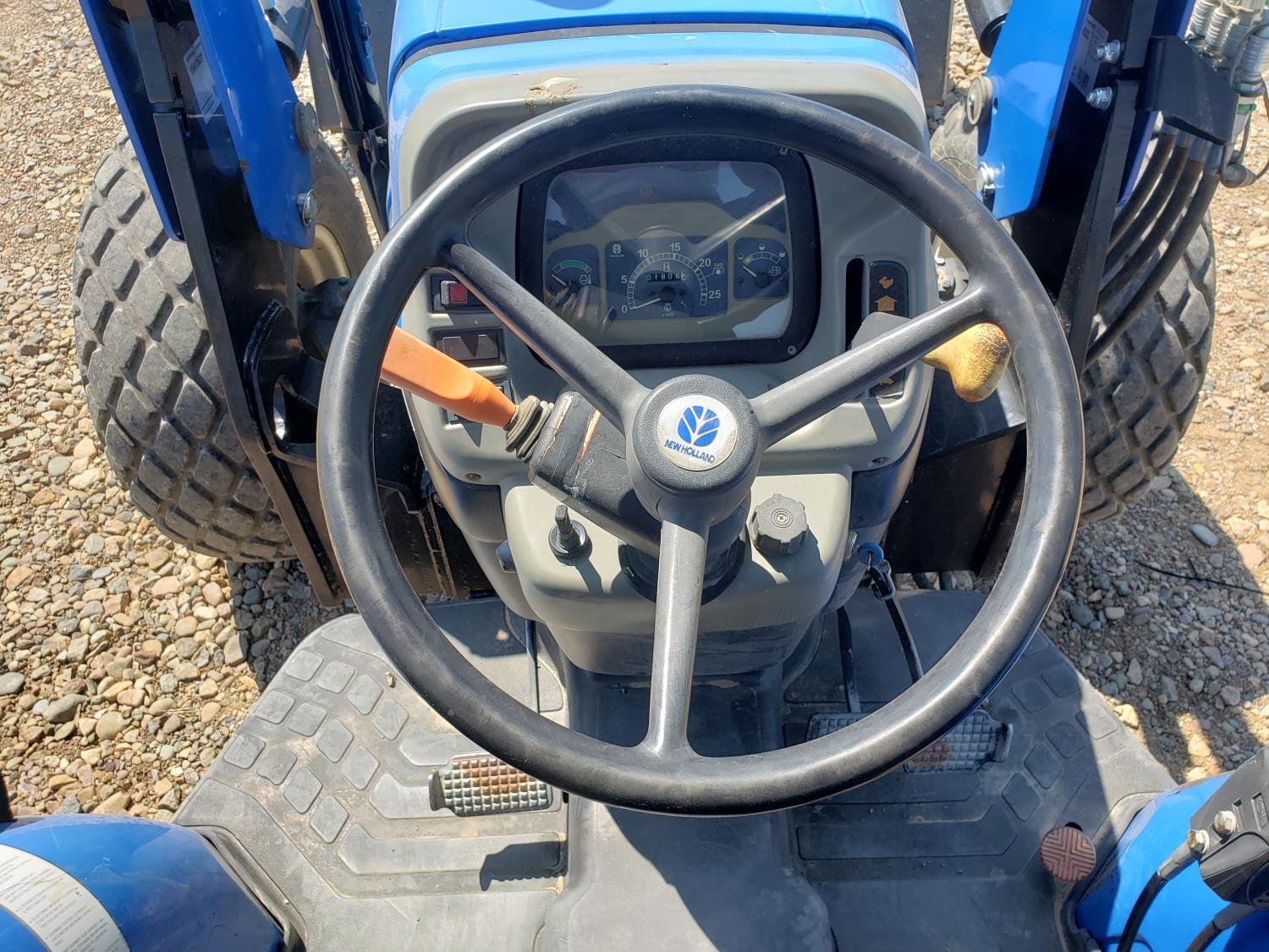 New Holland loader, 84 inch bucket, mid mount hydraulic connection, Iveco 2.9 L 70 HP, engine, 57 PTO HP, open station platform, ROPS, left hand reverser, 540 PTO, 3 point hitch, 1 rear hydraulic outlets, 13.6-16.1 front tires, 16.9-24 rear tires