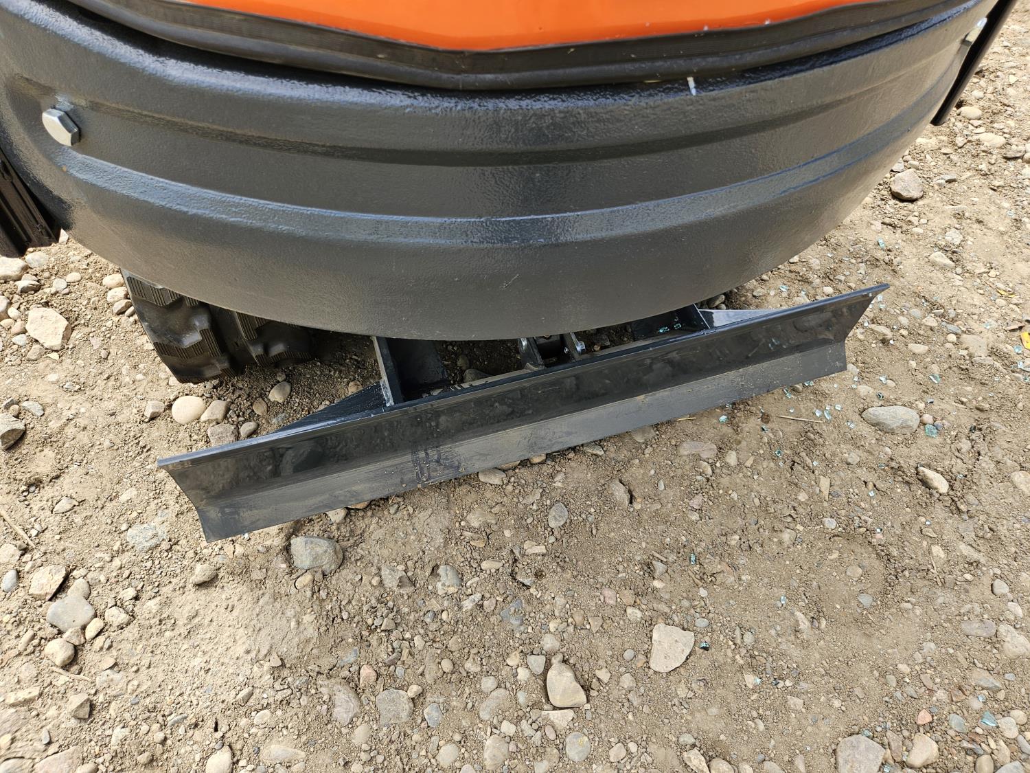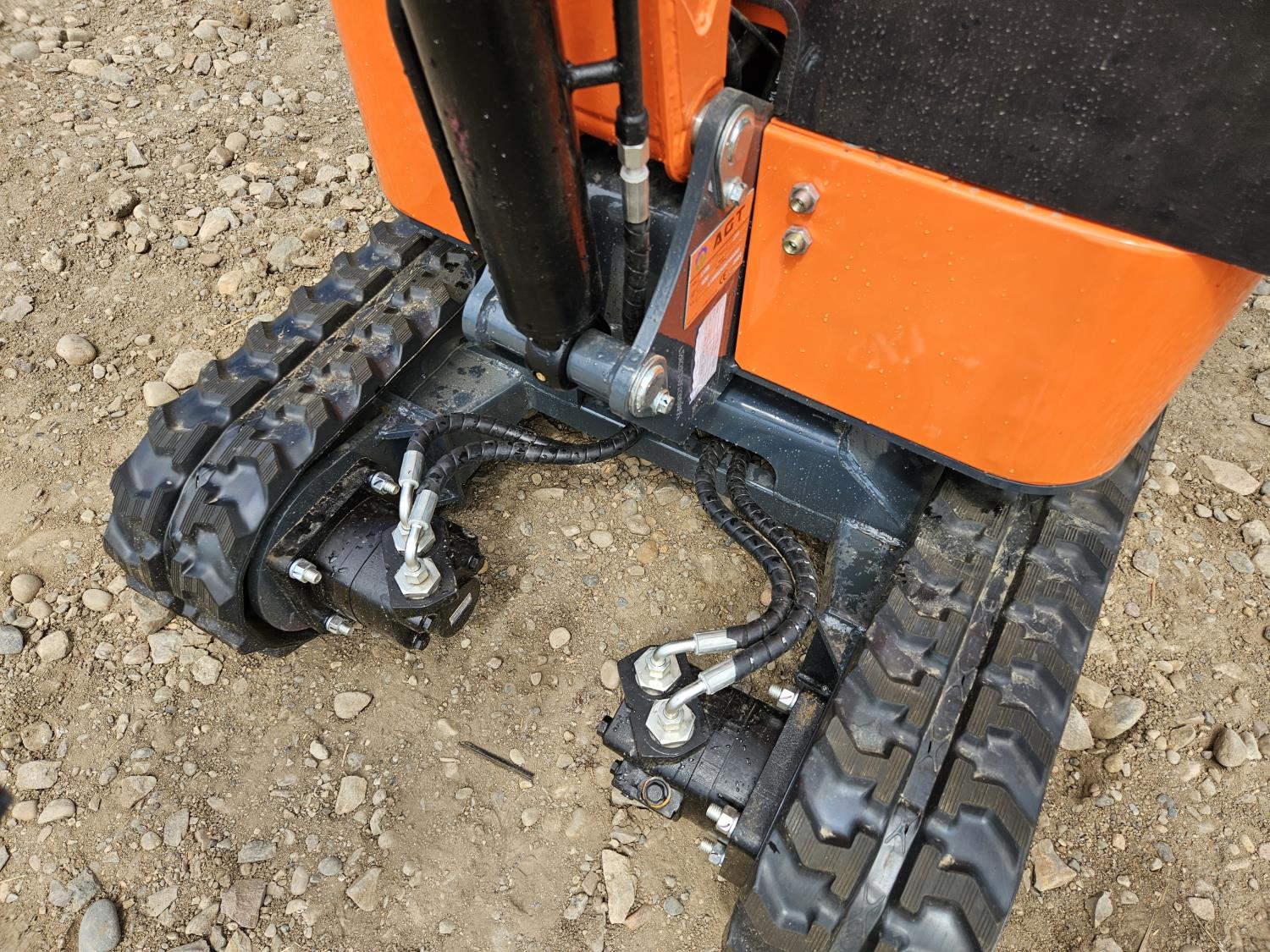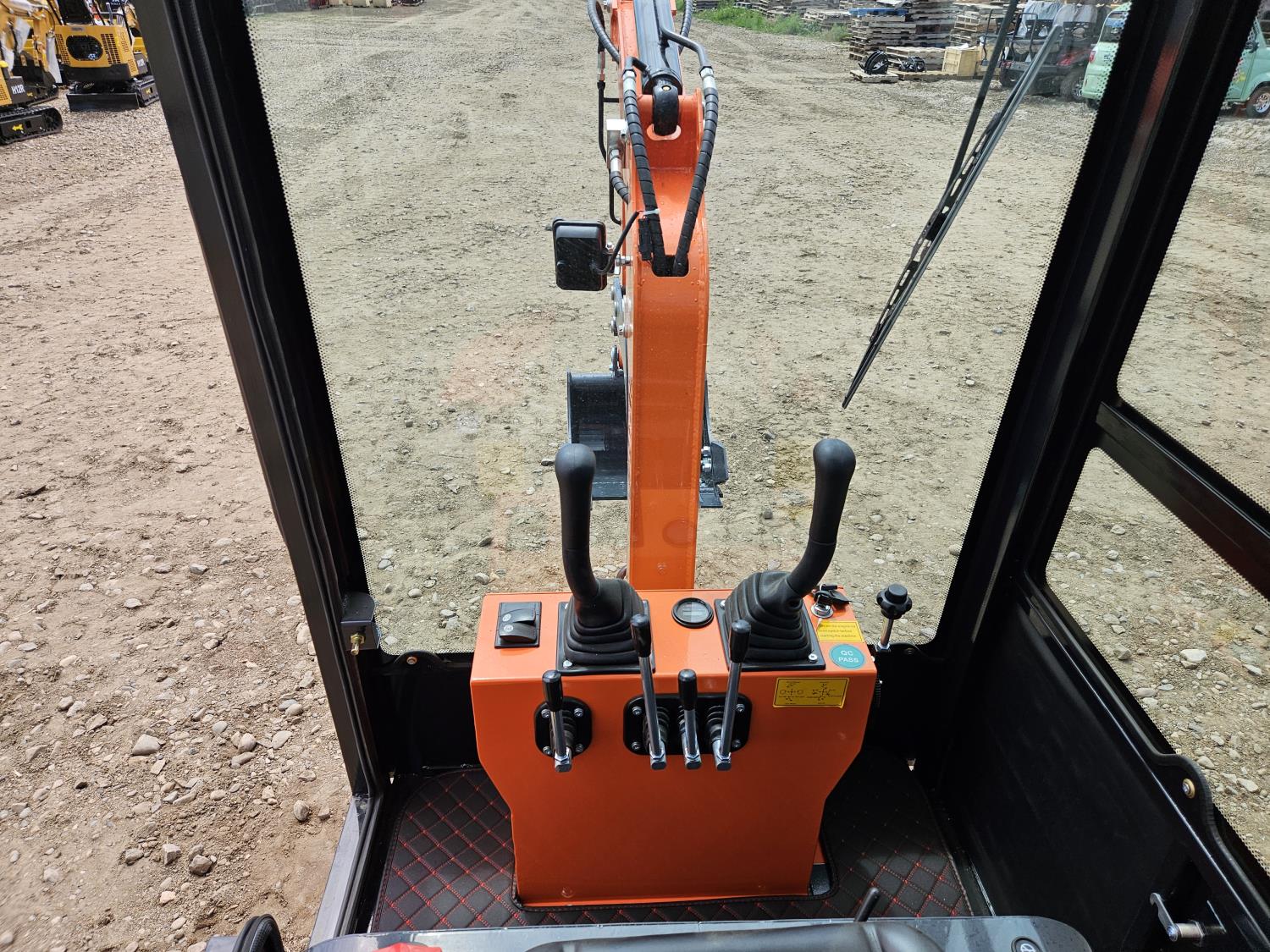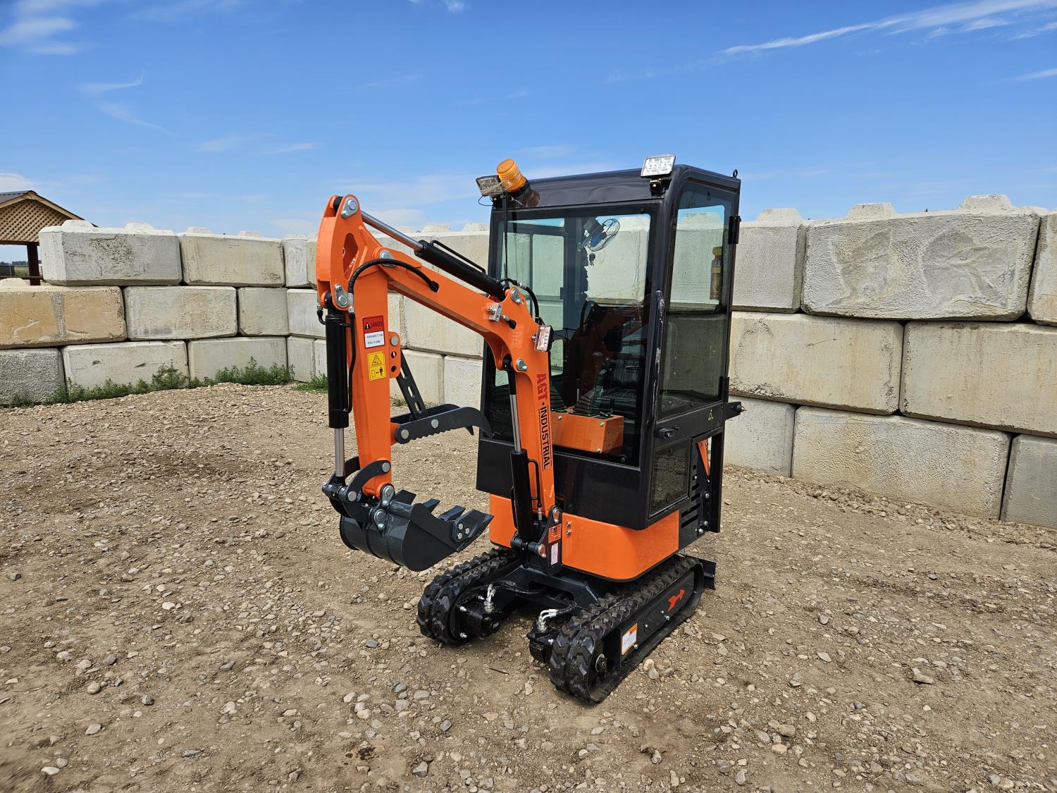 Enclosed cab, gas engine, 15" dig bucket, manual coupler, 39" stick, 37" backfill blade, 7" rubber tracks ,