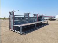 Bank of 3 RH delivery bucking chutes with 32 inch slides, 100 inch platforms, loading blinds and 48 inch arena entry gate