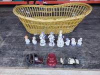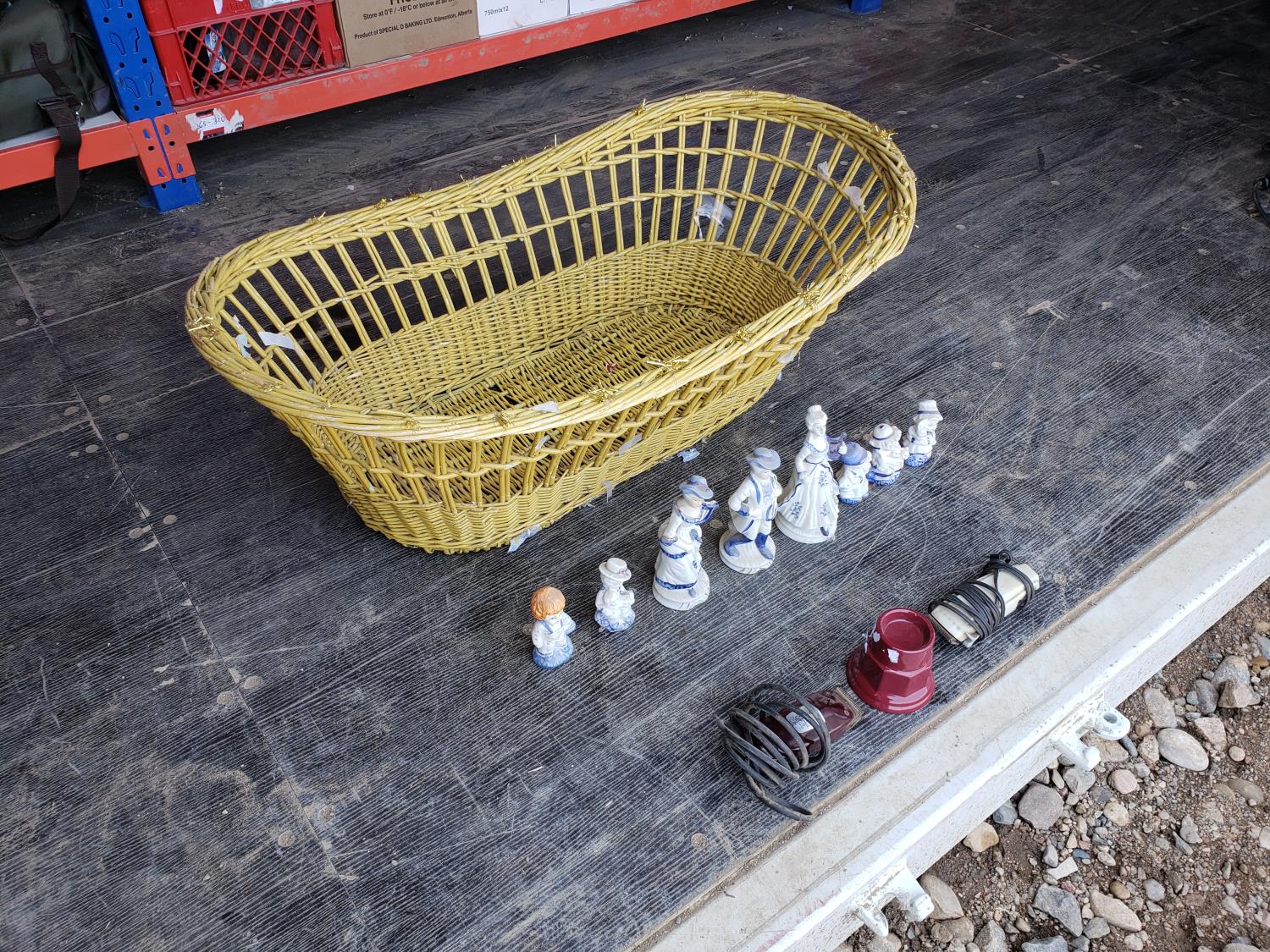 1031 Qty of (8) Porcelain Figurines W/ (2) Raycine Electric Hair Clippers, Candle Holder, Wicker Basket