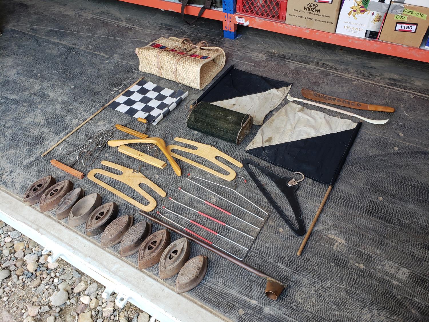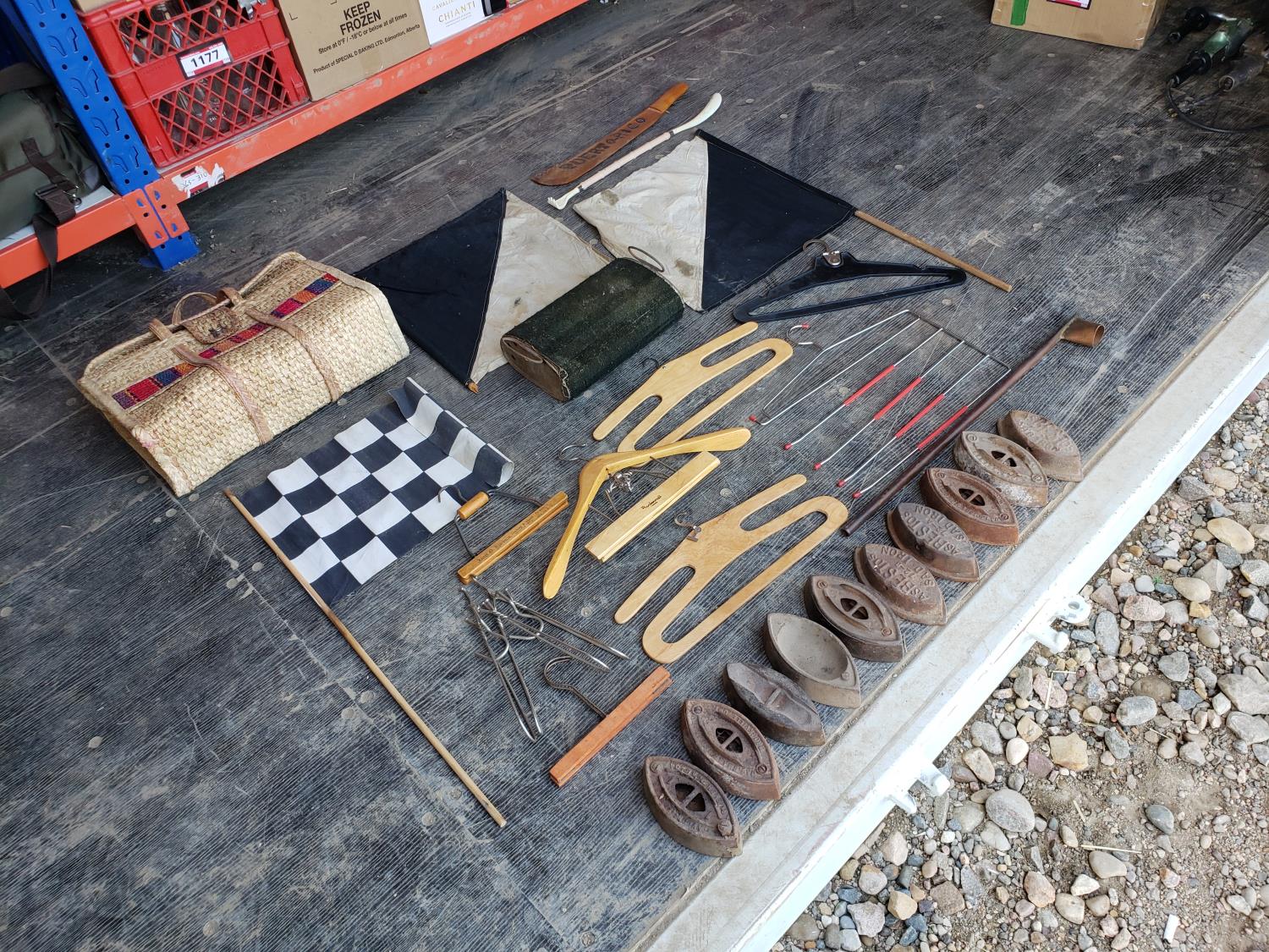(10) Sad Irons w/ Foot Warmer, Hangers, Flags, Handbag, and Back Scratchers