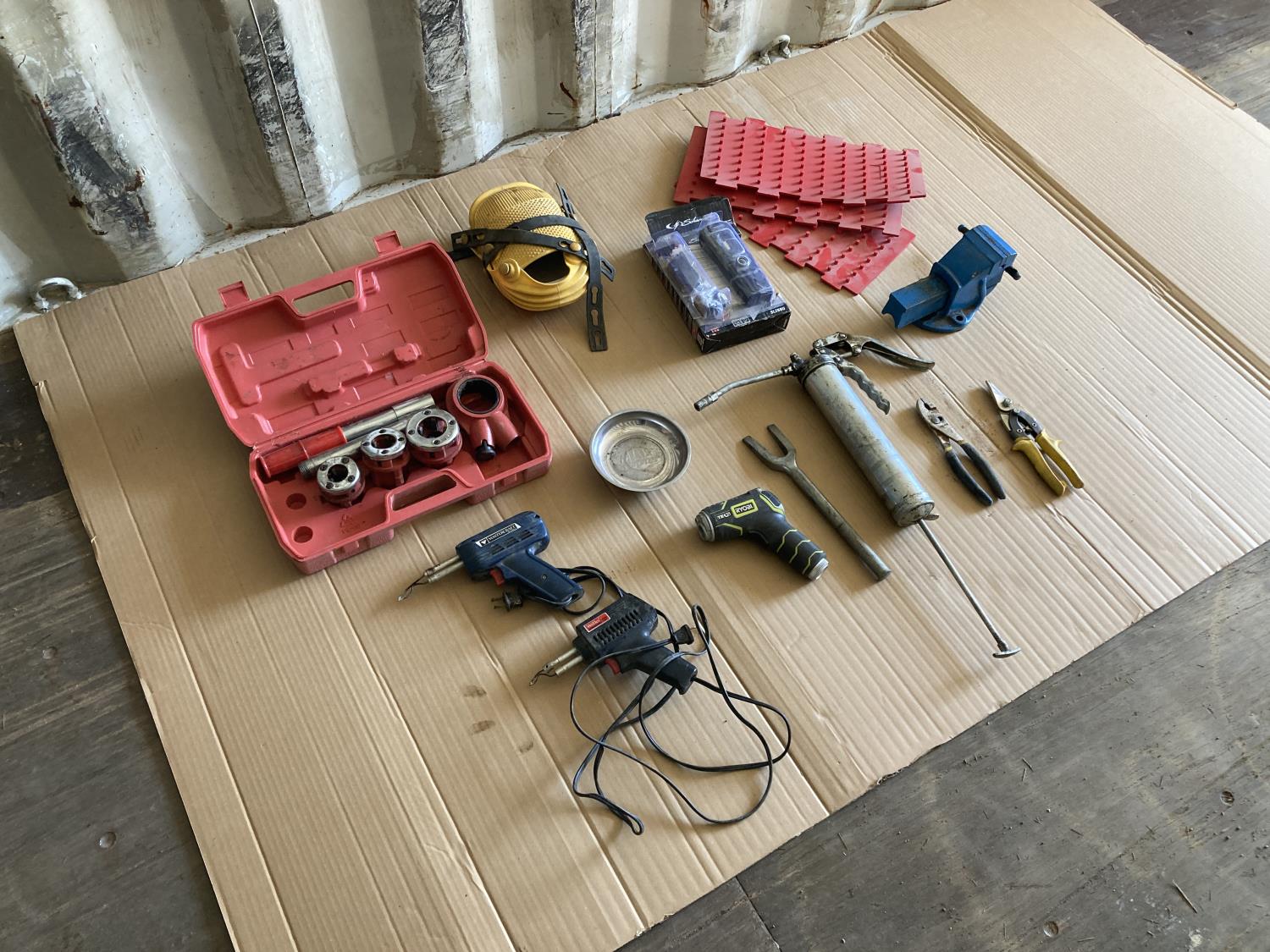 threader, (2) soldering guns, grease gun, vice, knee pads, magnet tray, snips, ball joint fork
