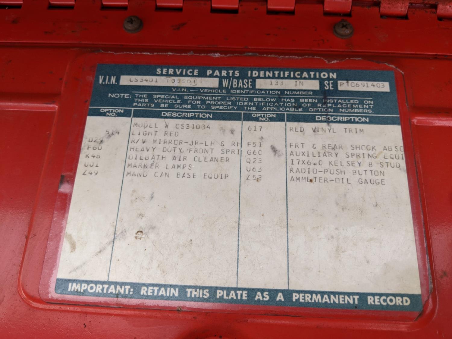Floor in box replaced, new master cylinder, new battery, all new ignition, (4) original 17 inch split rims located offsite call Hank to pick up after sale