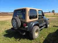 6 cylinder, gas, 5 speed manual transmission, 2 door, hard top, front tow hitch, running boards, 33X12.50X15 tires