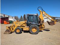 Enclosed cab, A/C, air ride seat, 93 inch smooth loader bucket, 30 inch dig backhoe bucket, stick, outriggers, 14-17.5 front tires, 21L-24 rear tires