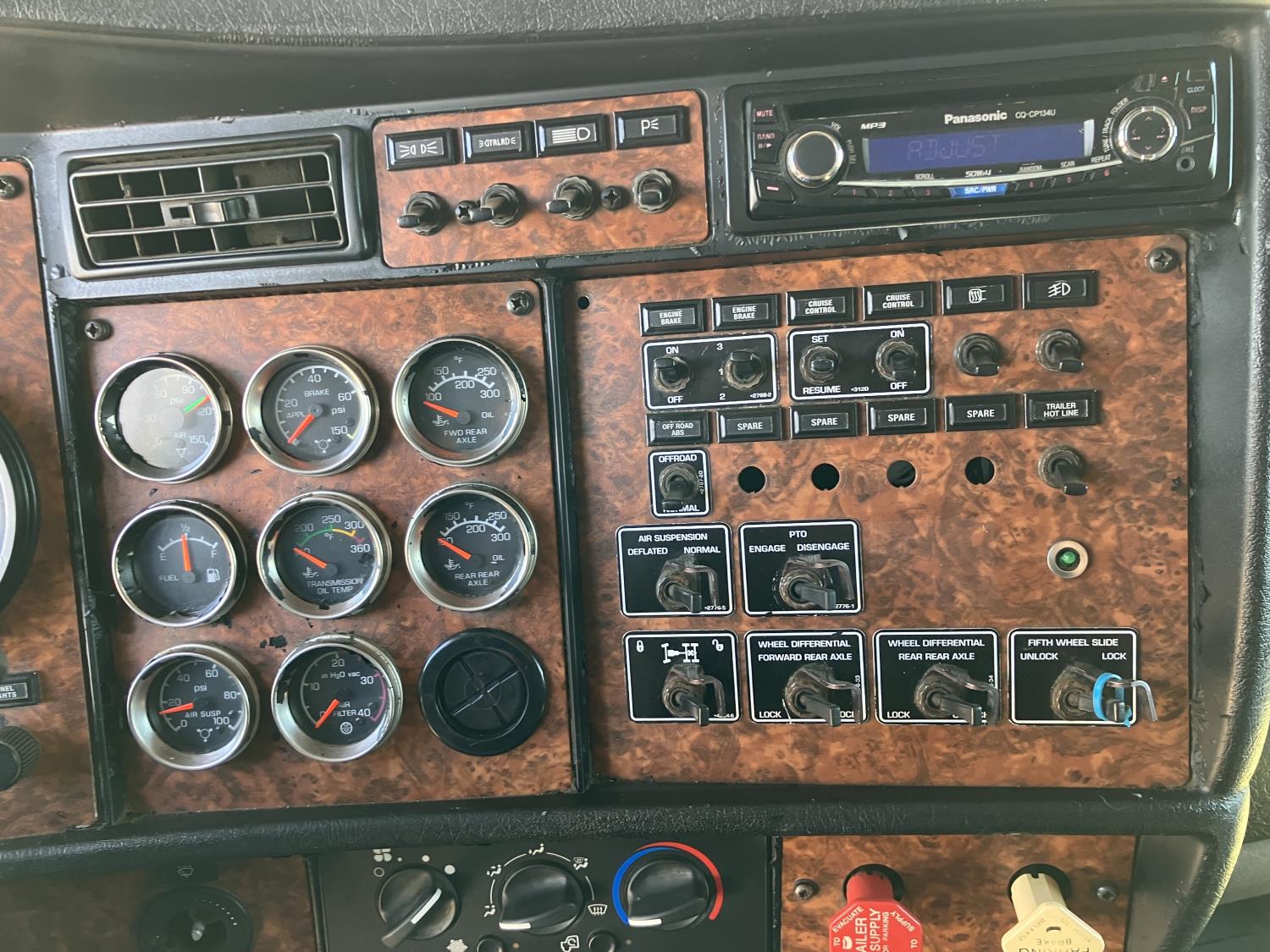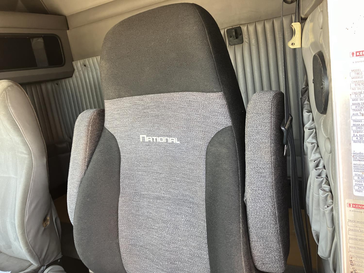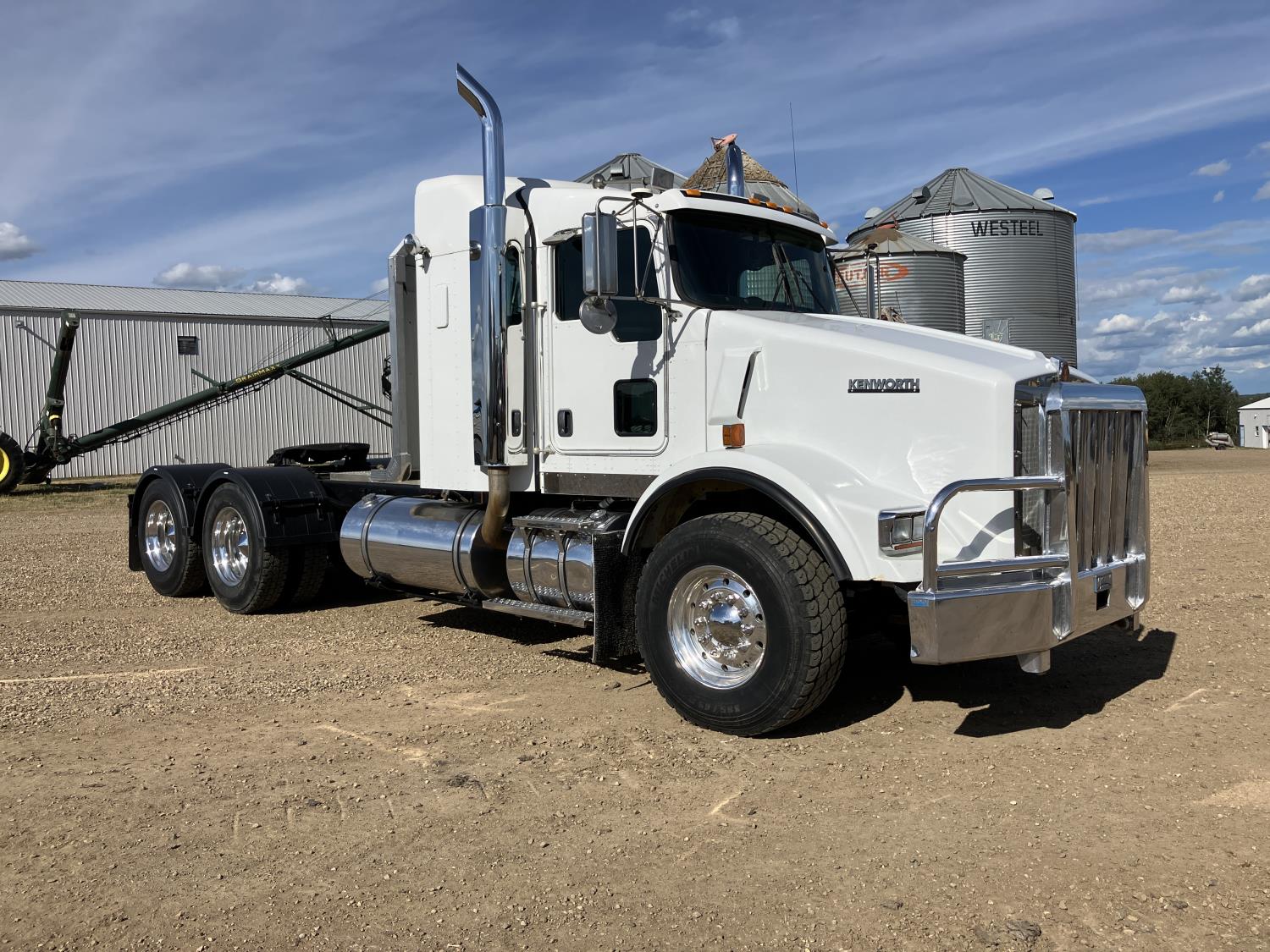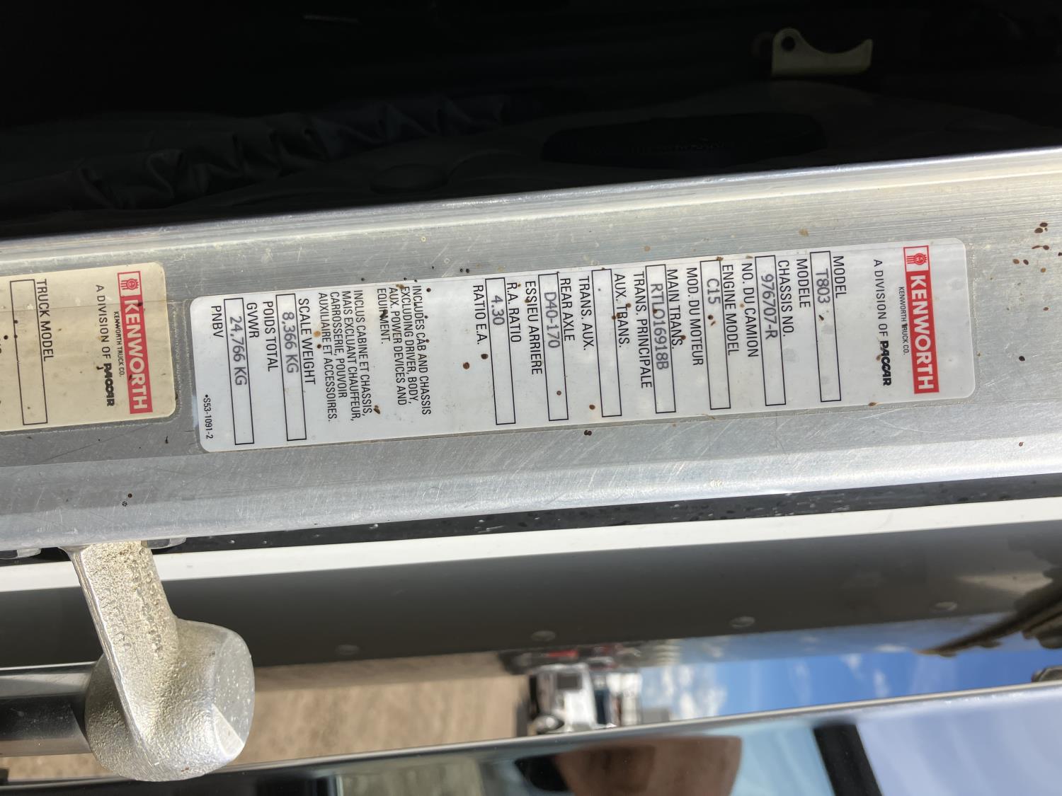 Caterpillar C15 diesel engine, engine block heater, positive air shutoff, 18 speed manual transmission, air ride suspension, 18,000 lb front axle, 46,000 lb rear axles, New a/c pump, condenser, starter, batteries, and shut off switch, full fenders, back up beeper unhooked, Kenworth 8 bag suspension, all aluminum wheels, 385/65R22.5 front tires, 11R24.5 rear tires