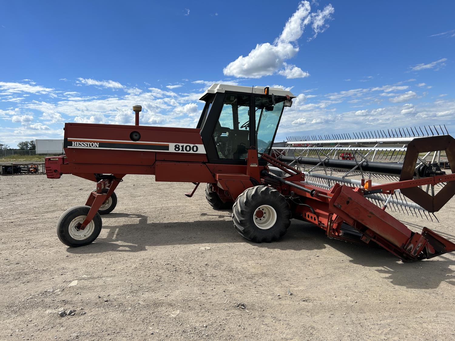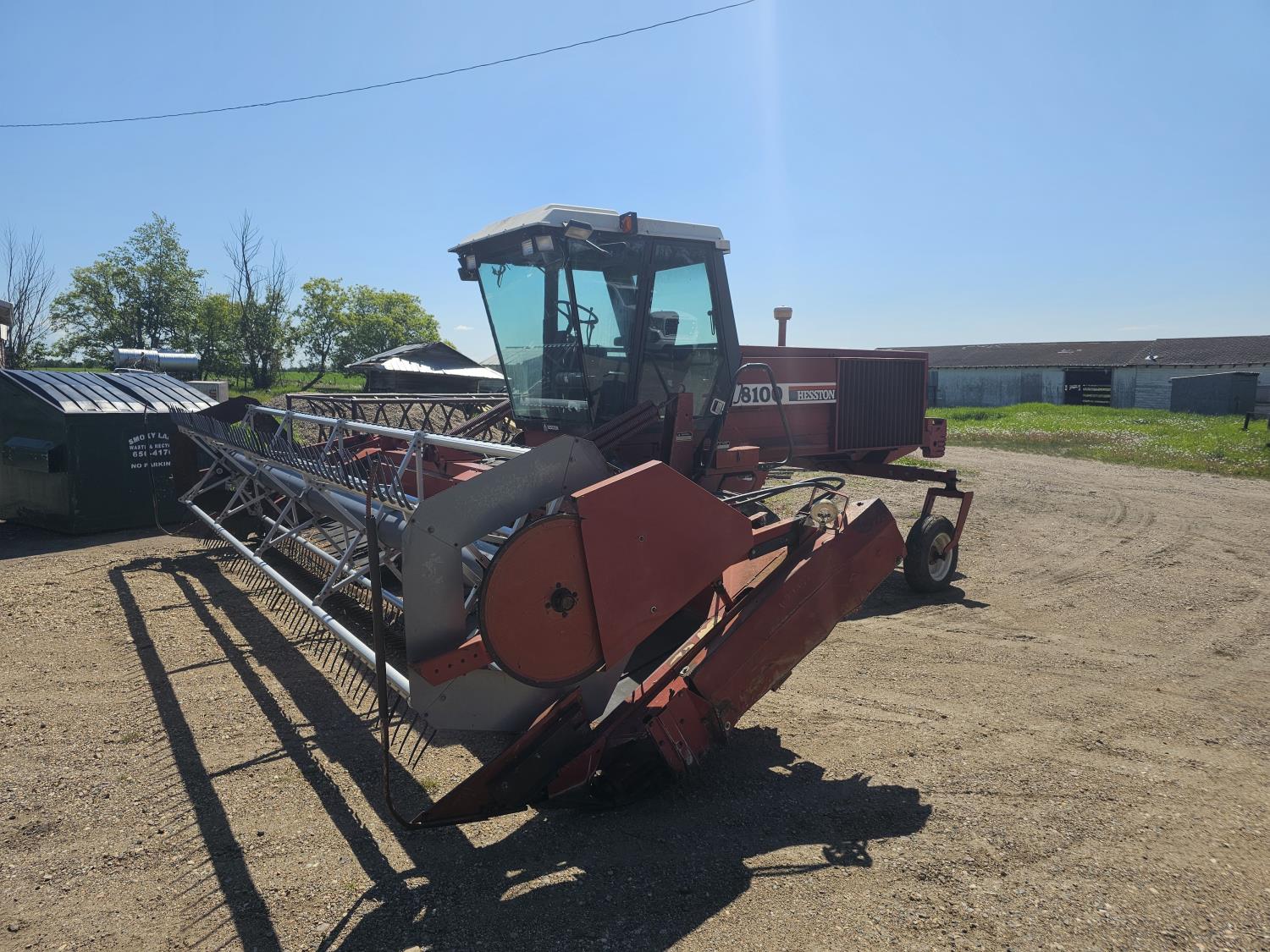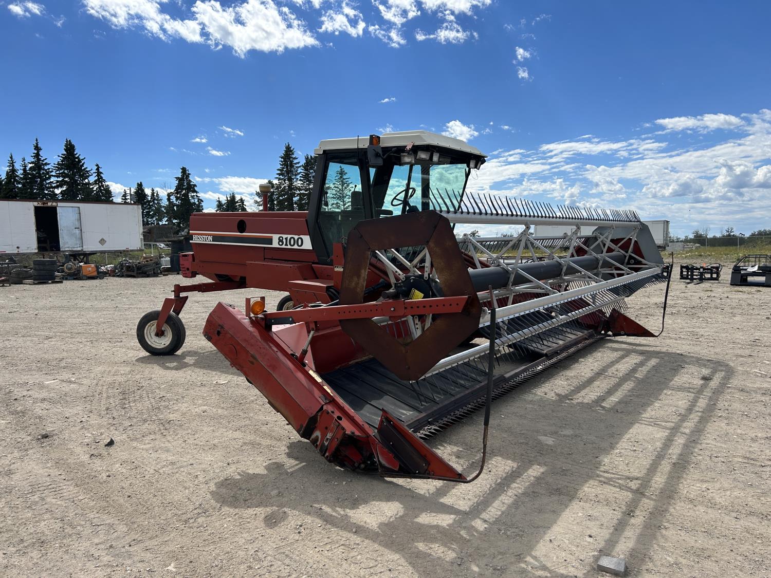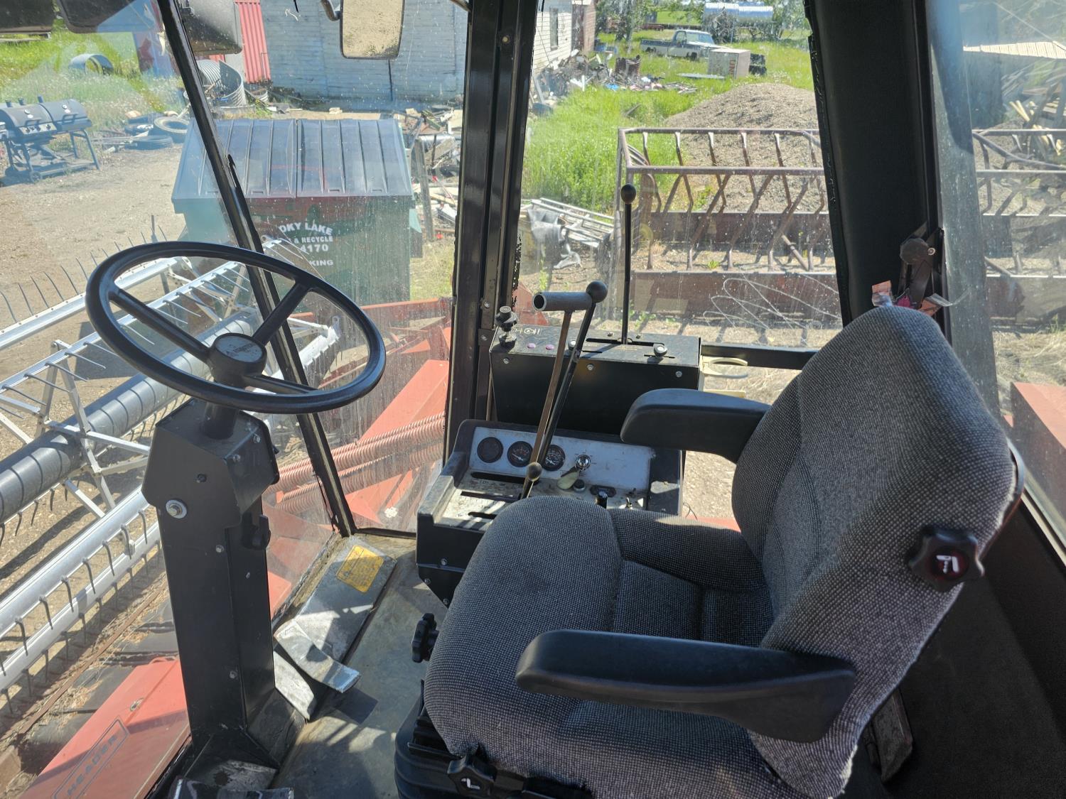 Hesston 8100 center delivery rigid draper header, pickup reel, variable speed reel, skid plates, crop dividers, Evco 4 cylinder diesel engine, radio, upgraded stereo, air ride seat