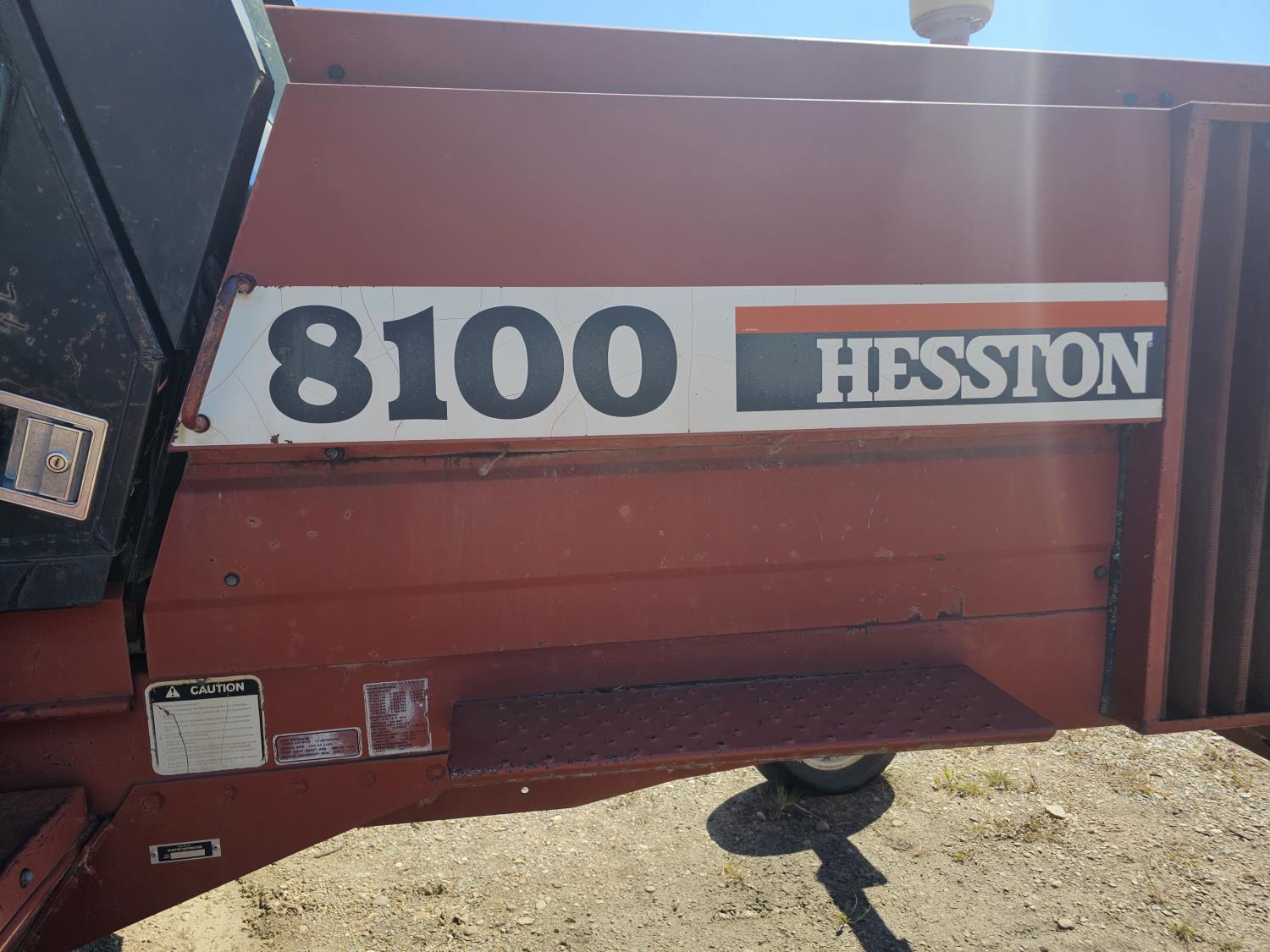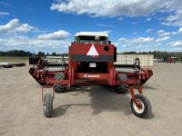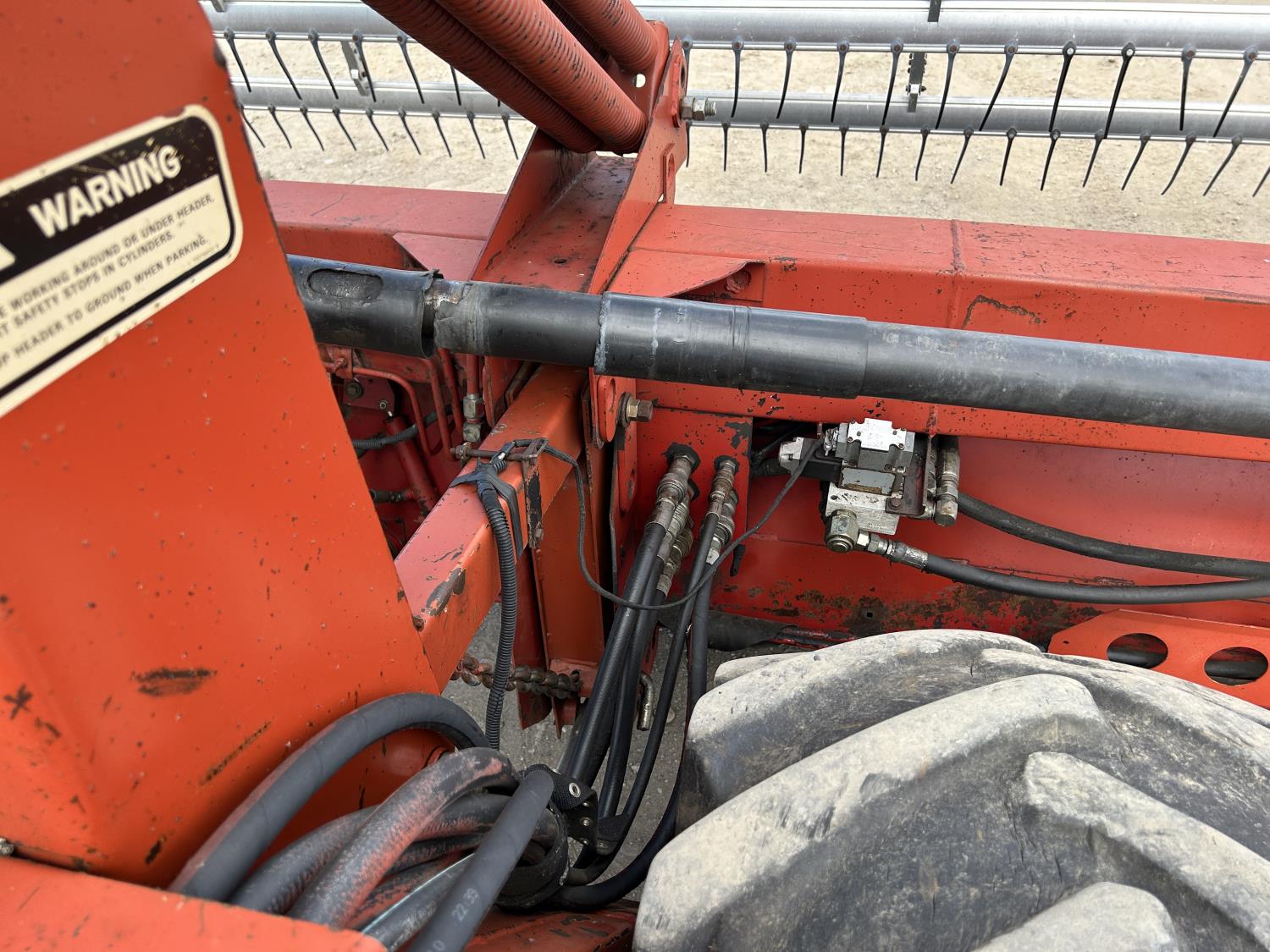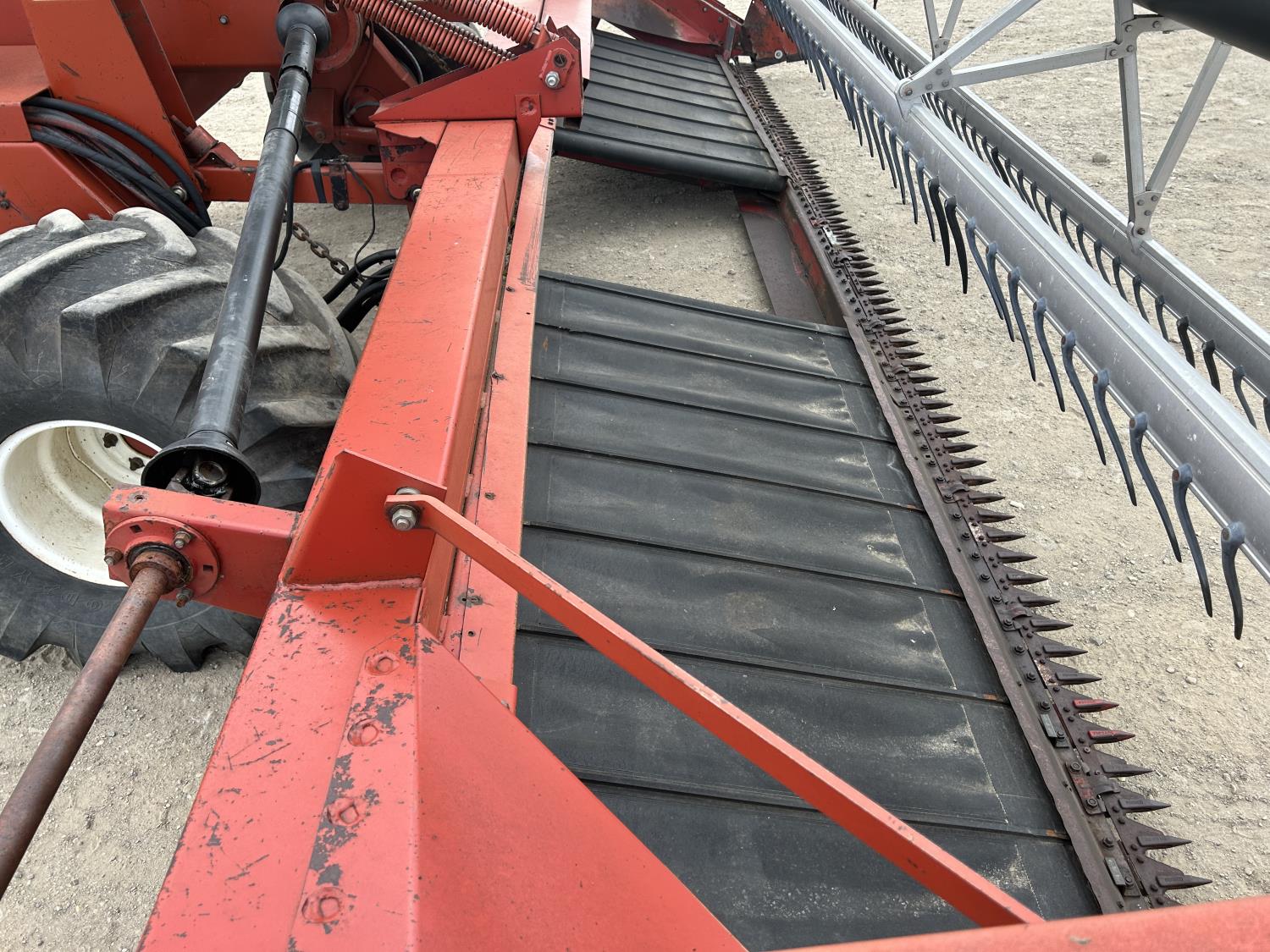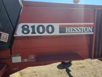 Hesston 8100 center delivery rigid draper header, pickup reel, variable speed reel, skid plates, crop dividers, Evco 4 cylinder diesel engine, radio, upgraded stereo, air ride seat