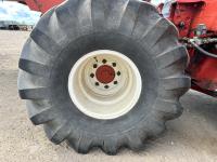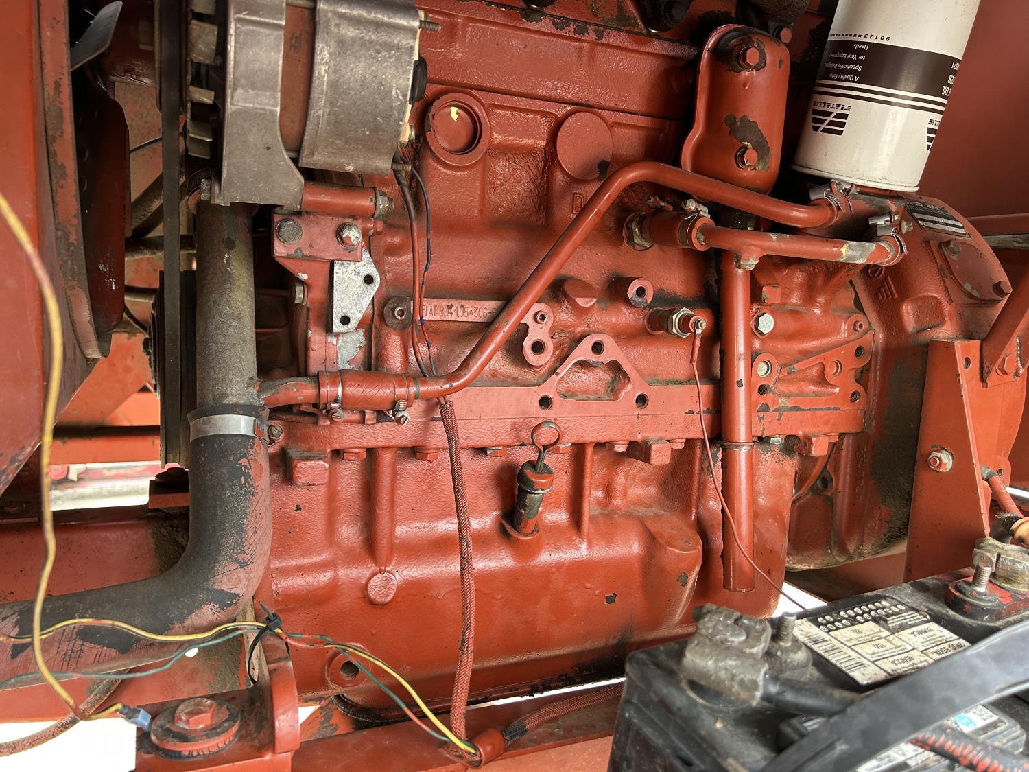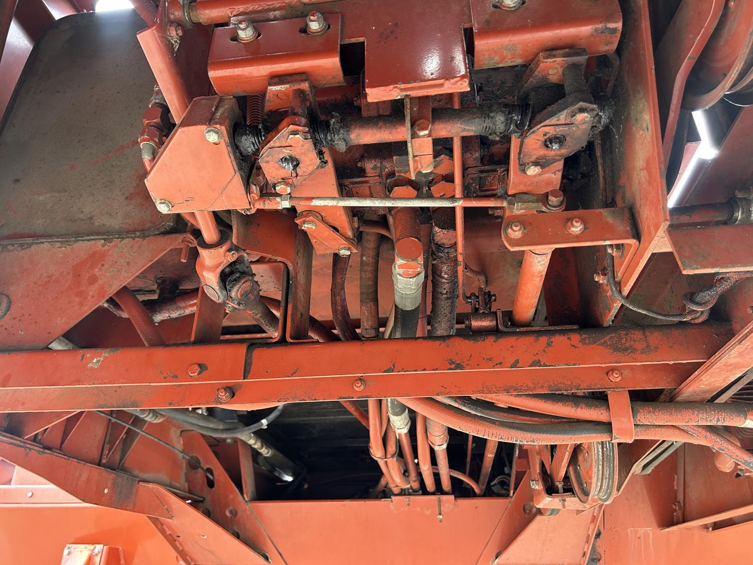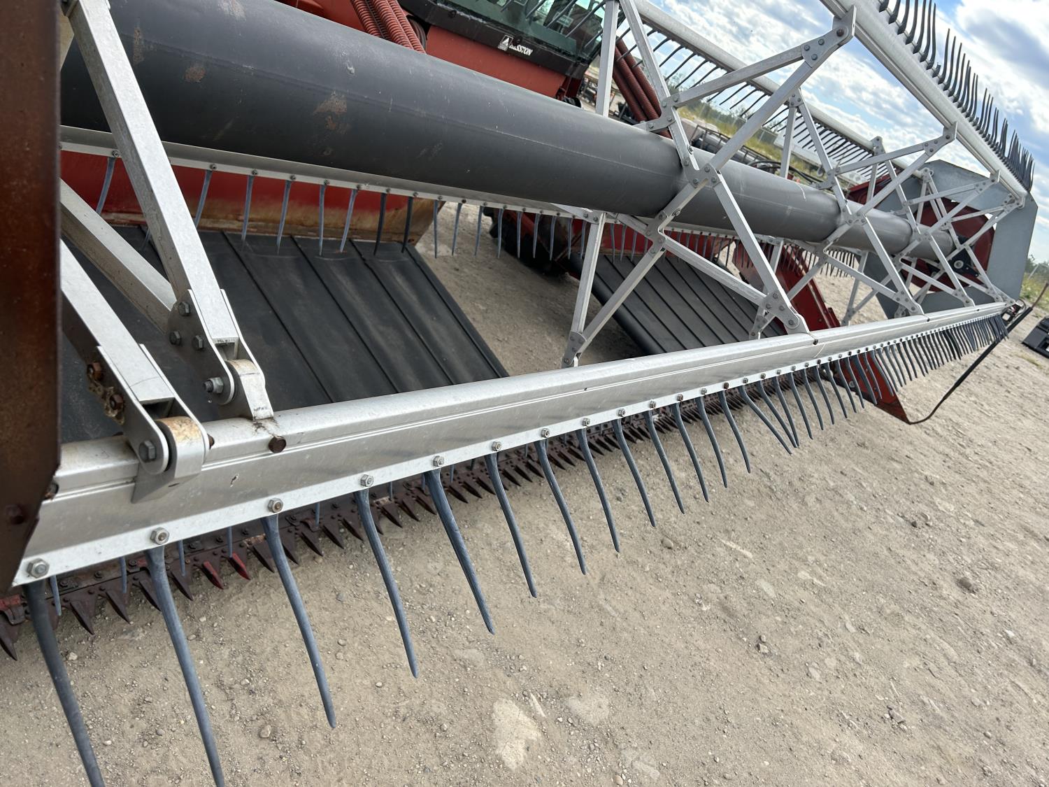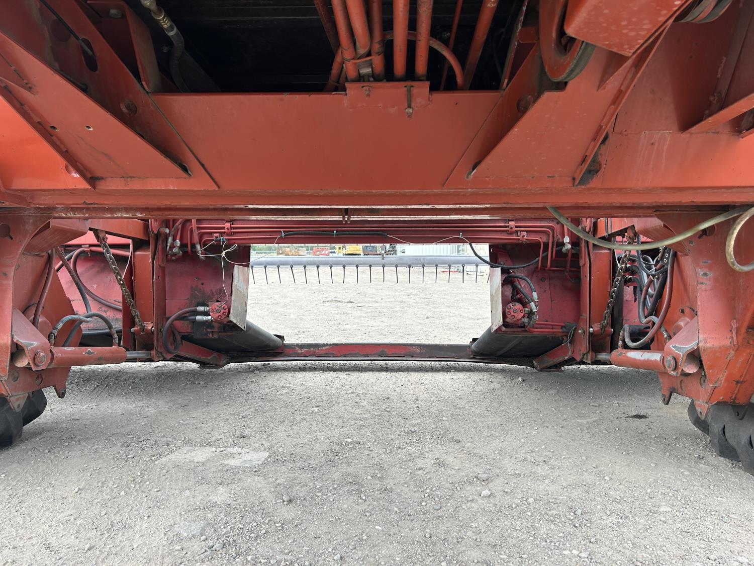 Hesston 8100 center delivery rigid draper header, pickup reel, variable speed reel, skid plates, crop dividers, Evco 4 cylinder diesel engine, radio, upgraded stereo, air ride seat
