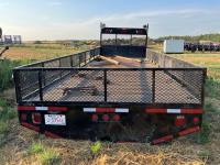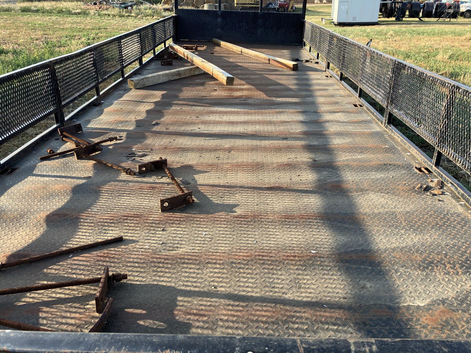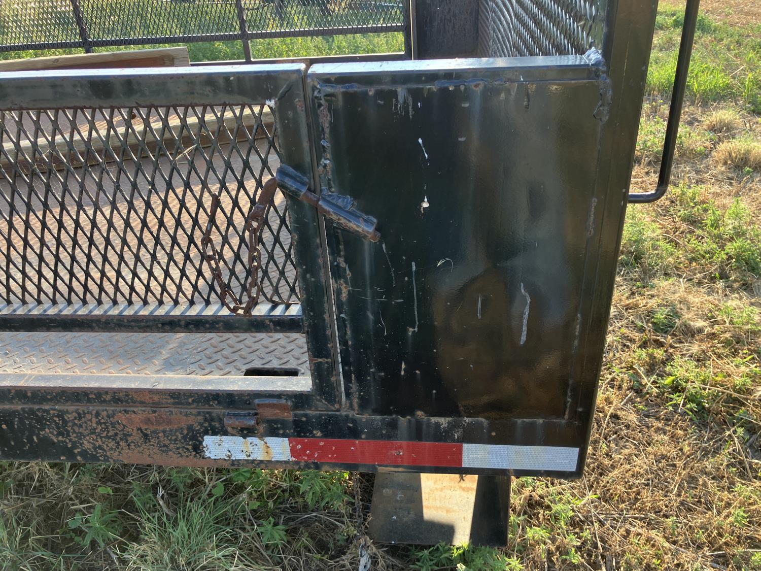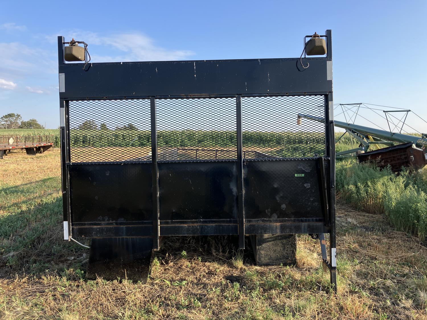 102 inch wide, 18 inch fold down mesh sides, cargo winches on left side, headache rack, backup lights, block hanger on right side, tool box