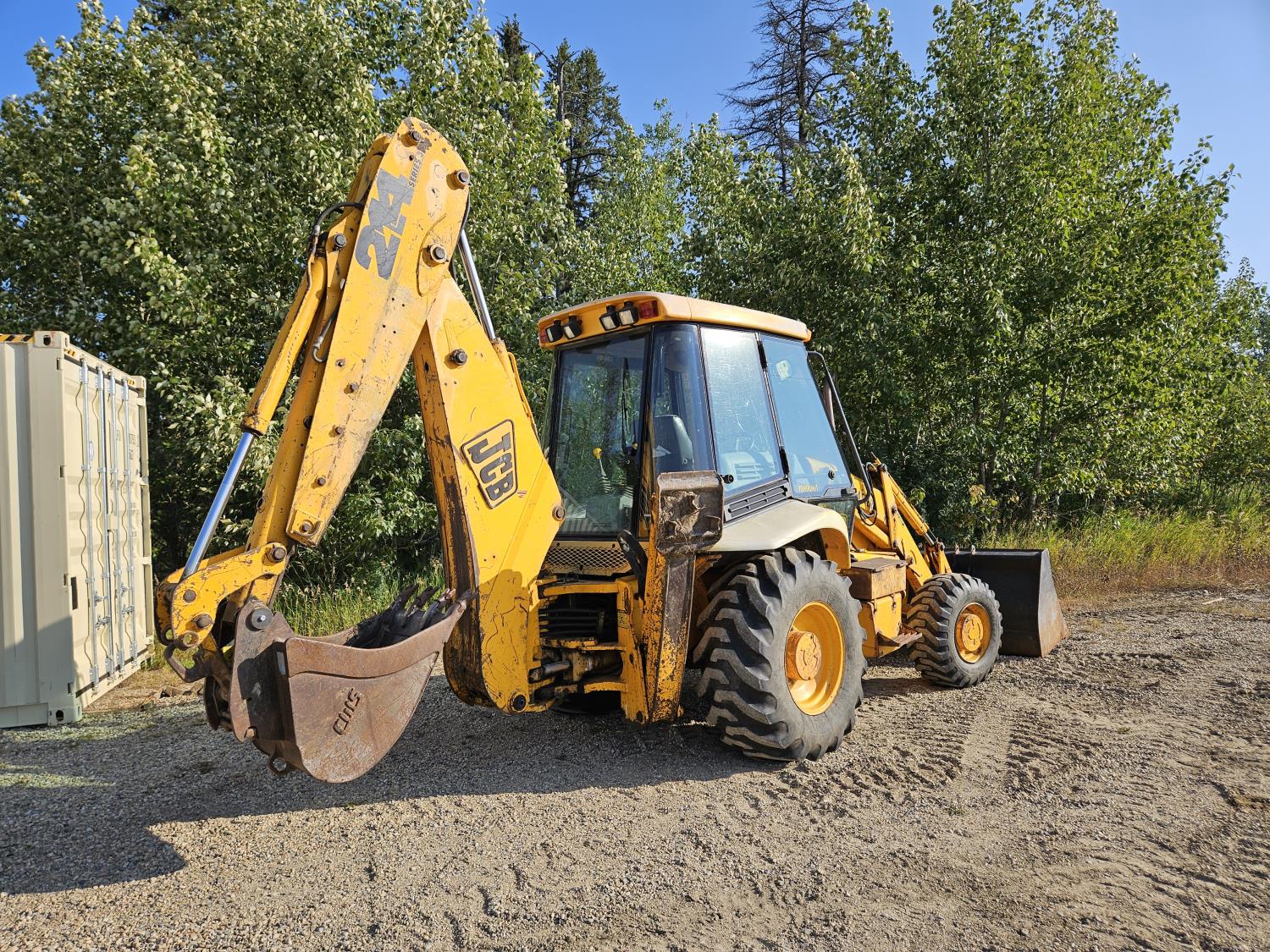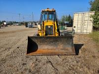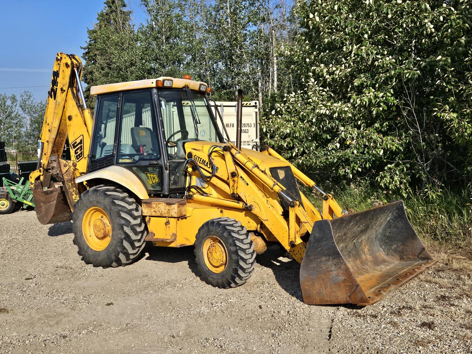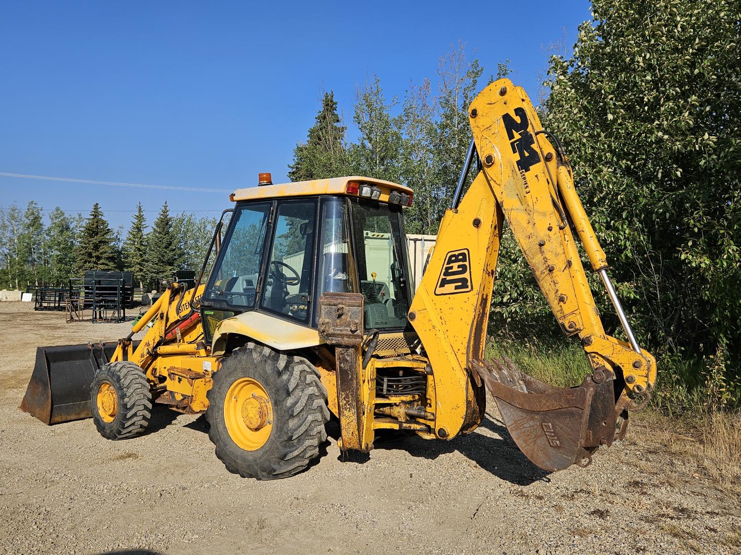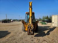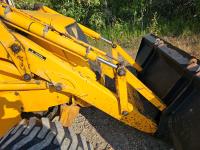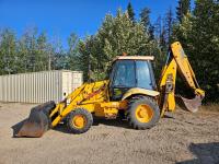 Enclosed cab, 4 speed powershift transmission, Perkins diesel engine, left hand shuttle shift, 92 inch smooth loader bucket, 23 inch dig backhoe bucket, 78 inch stick, outriggers, 14-17.5 front tires, 19.5L-24 rear tires