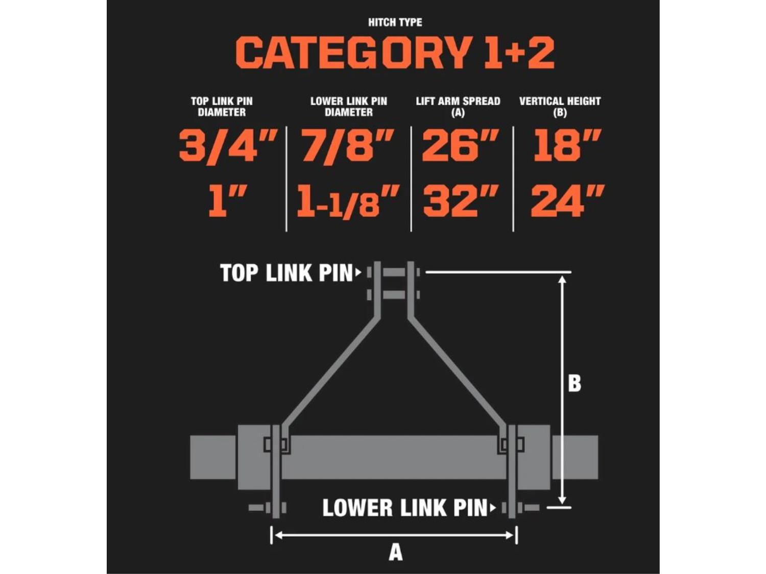 40-60 HP tractor, 6 inch tilling depth, PTO shaft included, category 1 & 2 hookup