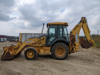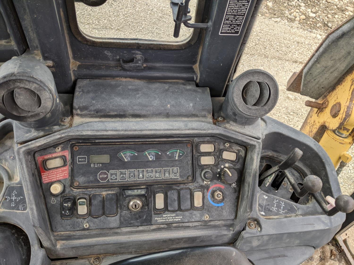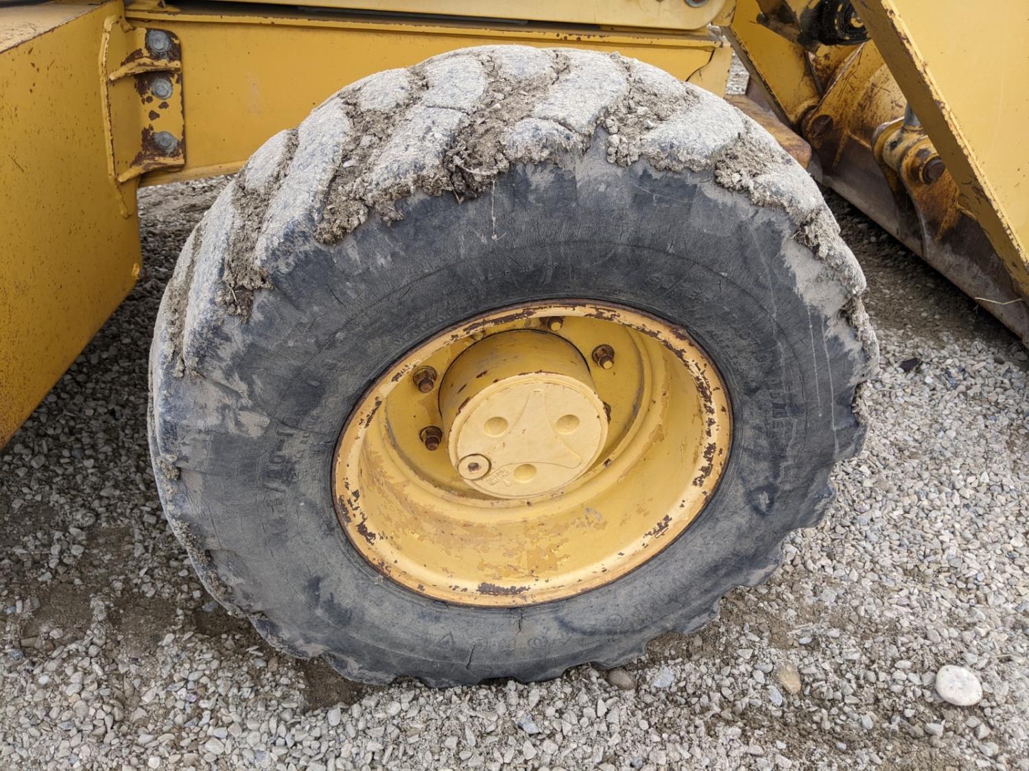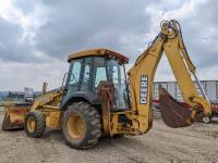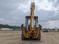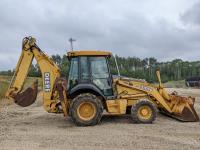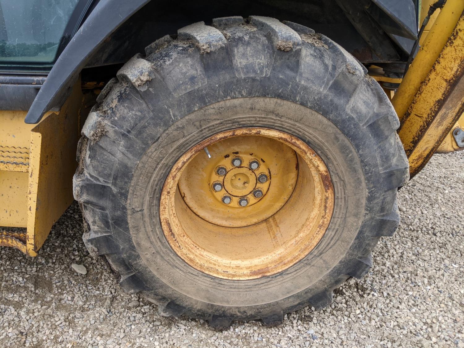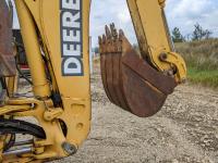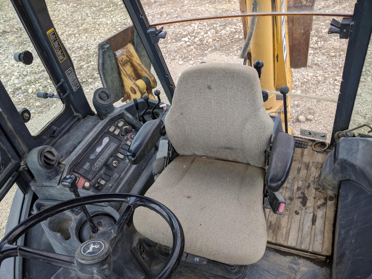 Enclosed cab, A/C, air ride seat, powershift transmission, 89 inch smooth loader bucket, 24 inch dig backhoe bucket, outriggers, extendable stick, ride control, 12.5/80-18 front tires, 19.5L-24 rear tires