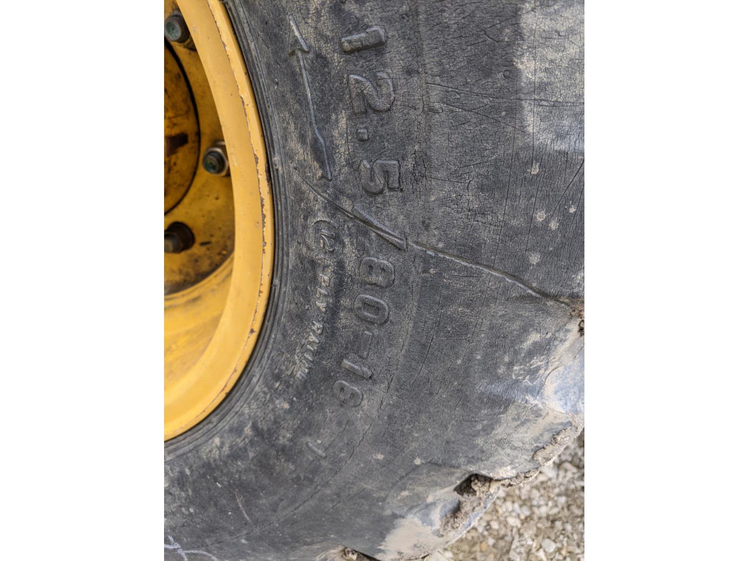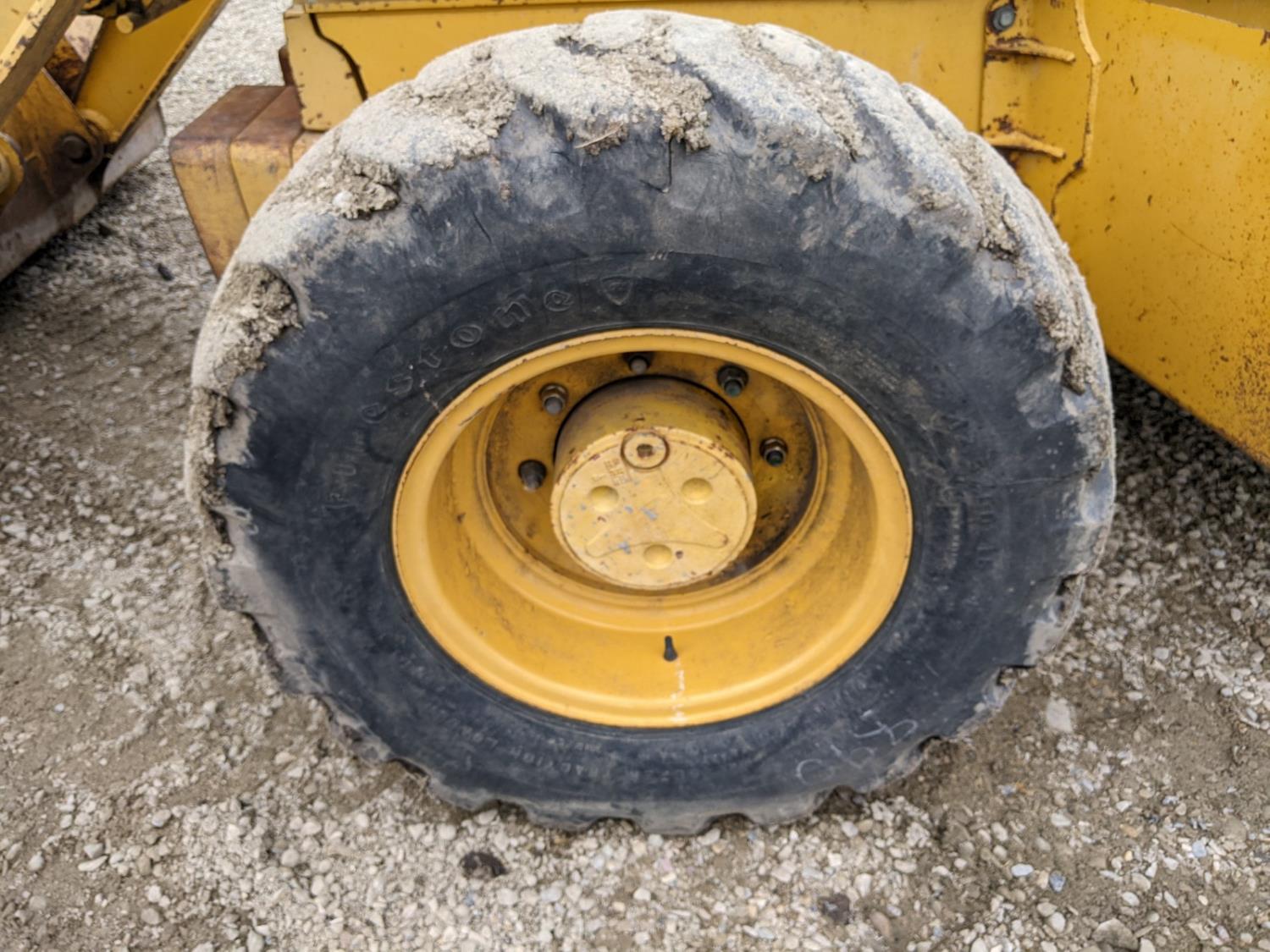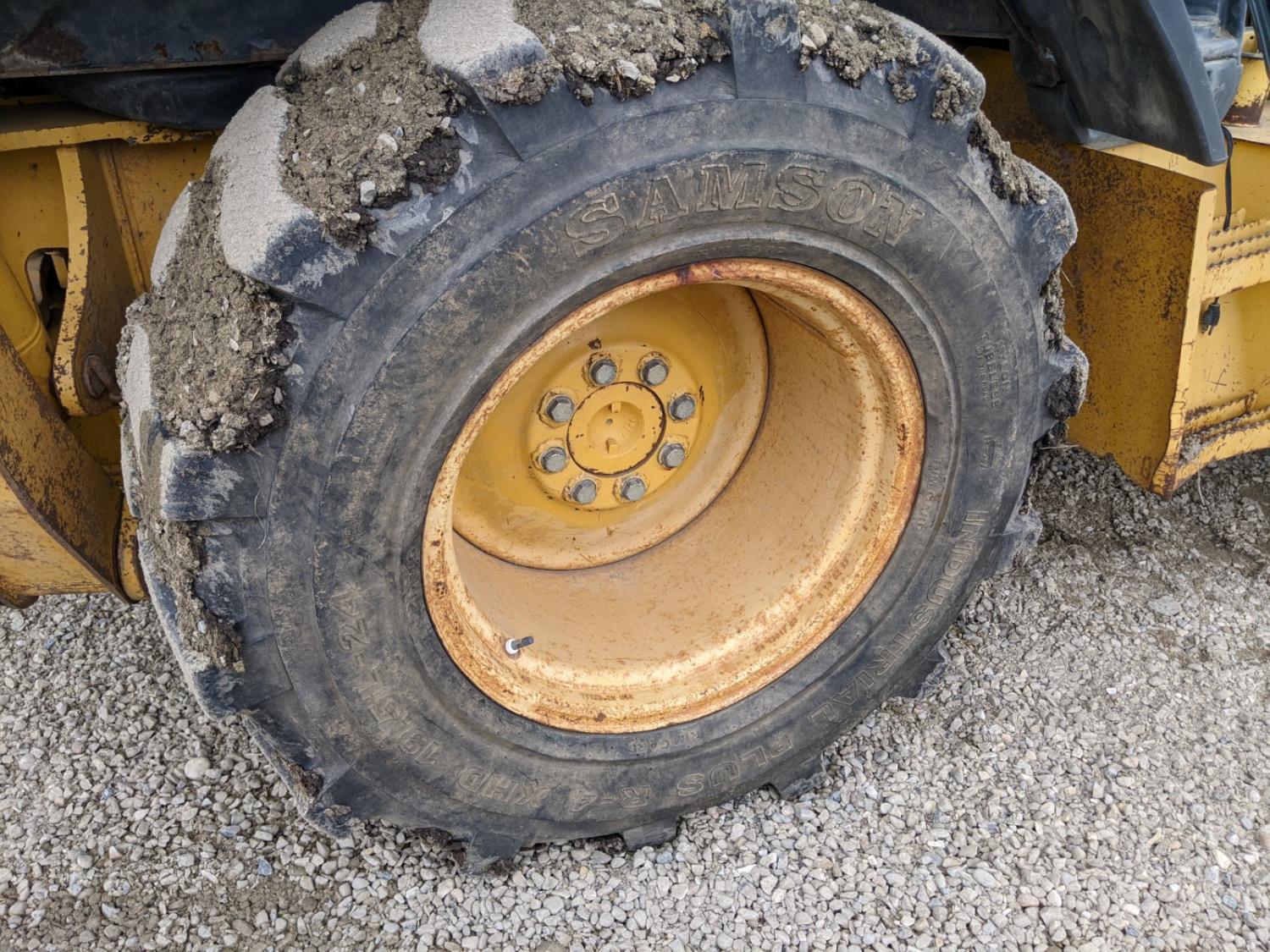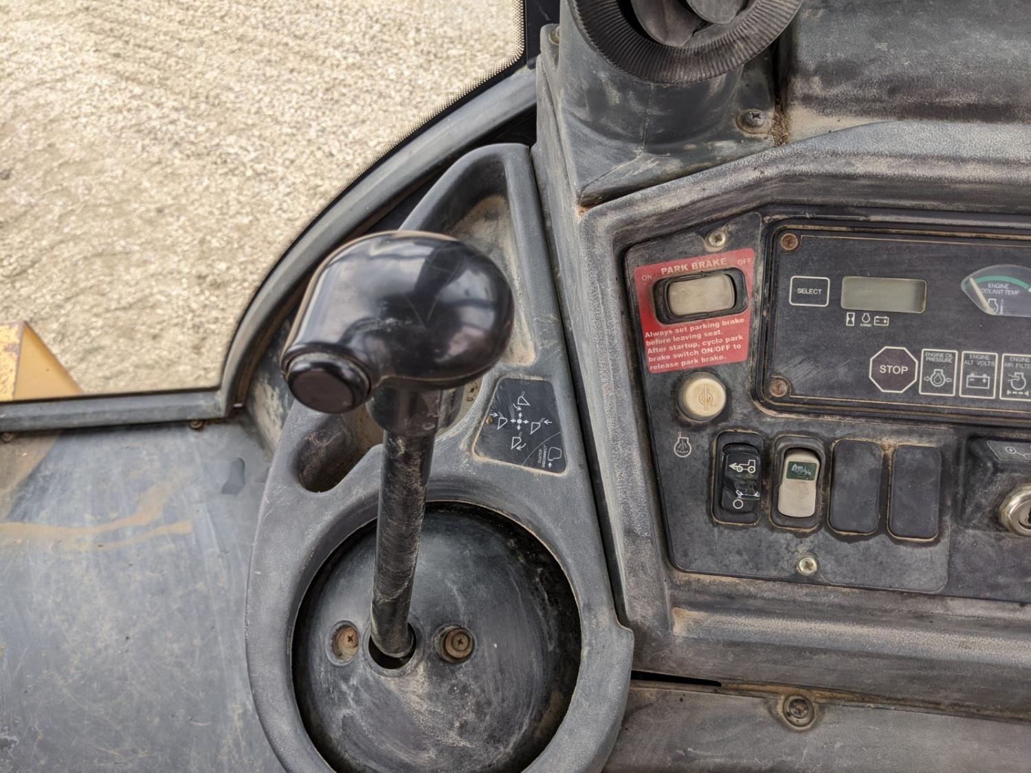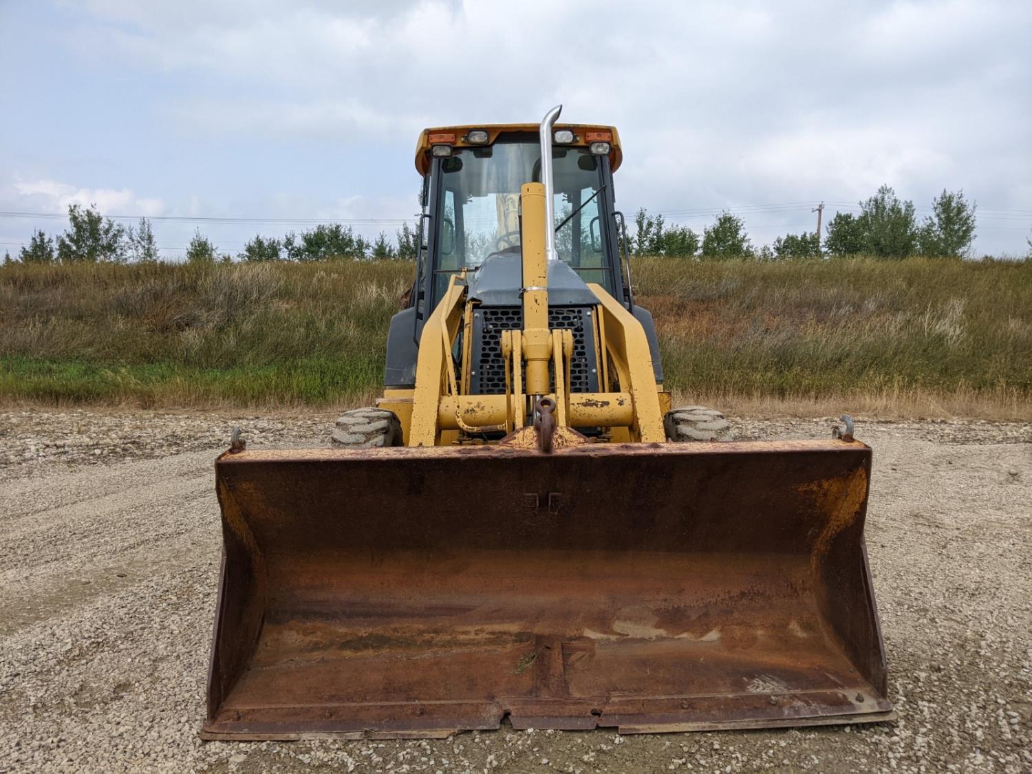 Enclosed cab, A/C, air ride seat, powershift transmission, 89 inch smooth loader bucket, 24 inch dig backhoe bucket, outriggers, extendable stick, ride control, 12.5/80-18 front tires, 19.5L-24 rear tires