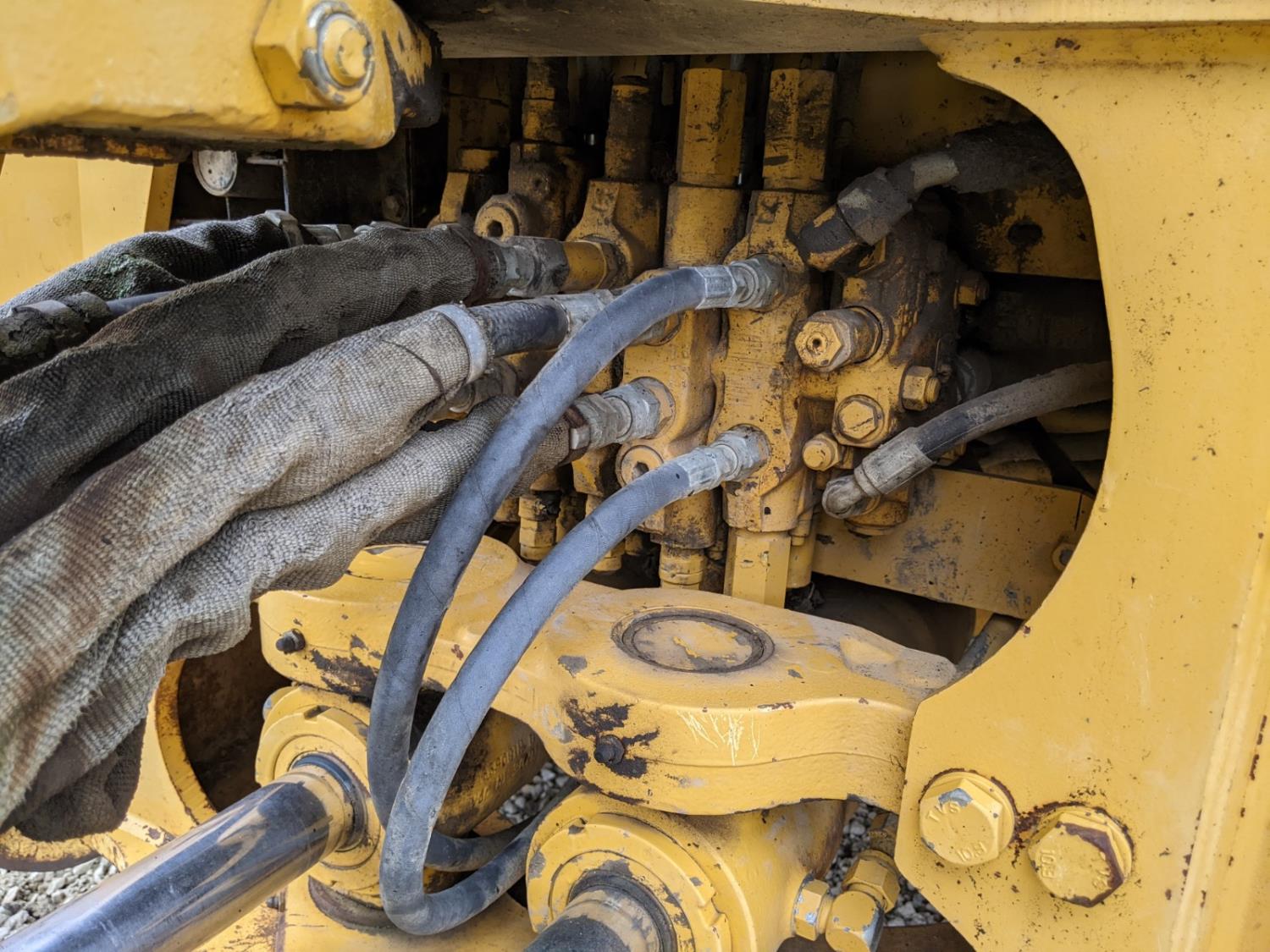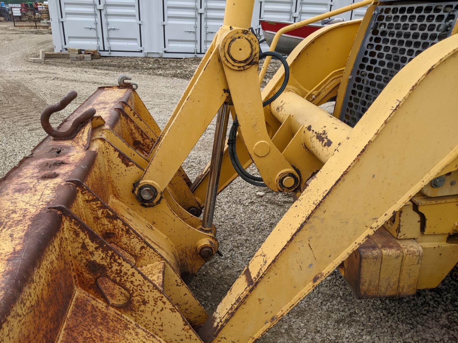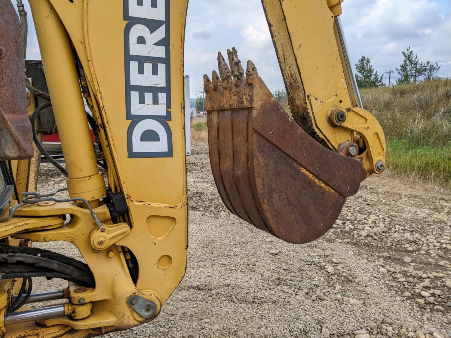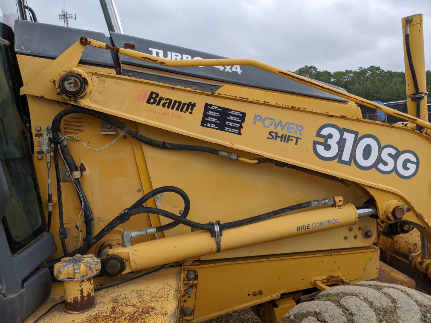 Enclosed cab, A/C, air ride seat, powershift transmission, 89 inch smooth loader bucket, 24 inch dig backhoe bucket, outriggers, extendable stick, ride control, 12.5/80-18 front tires, 19.5L-24 rear tires