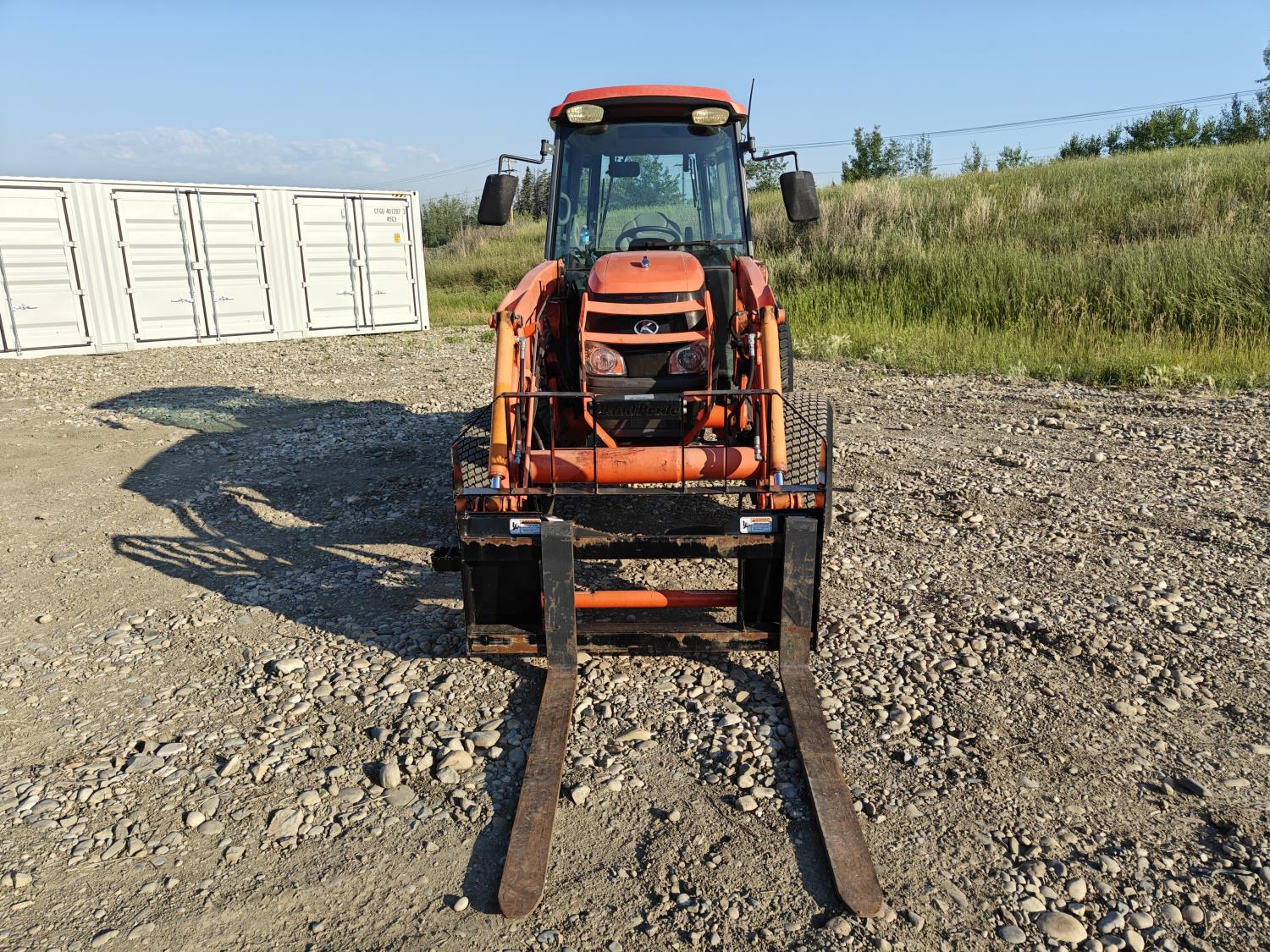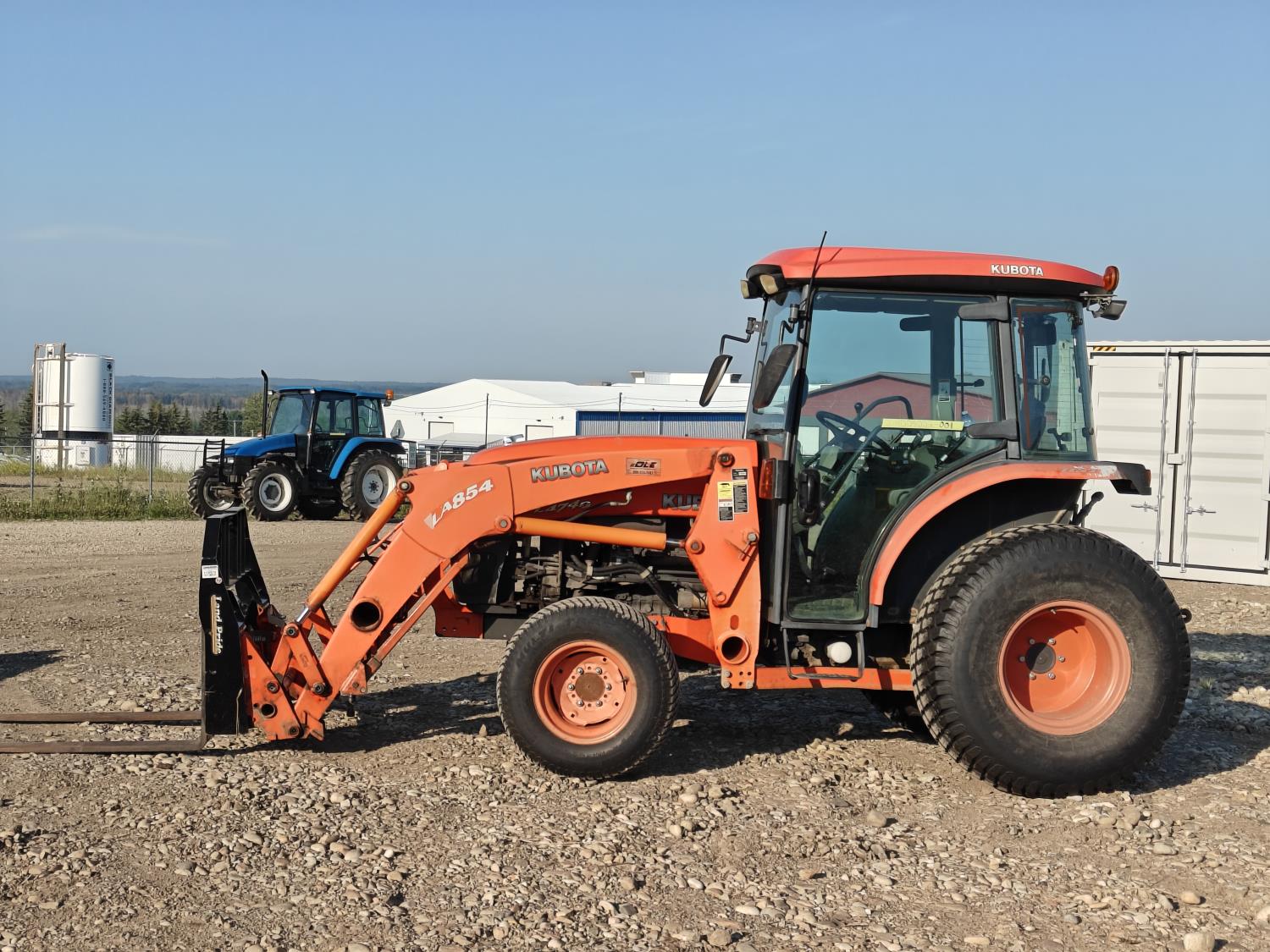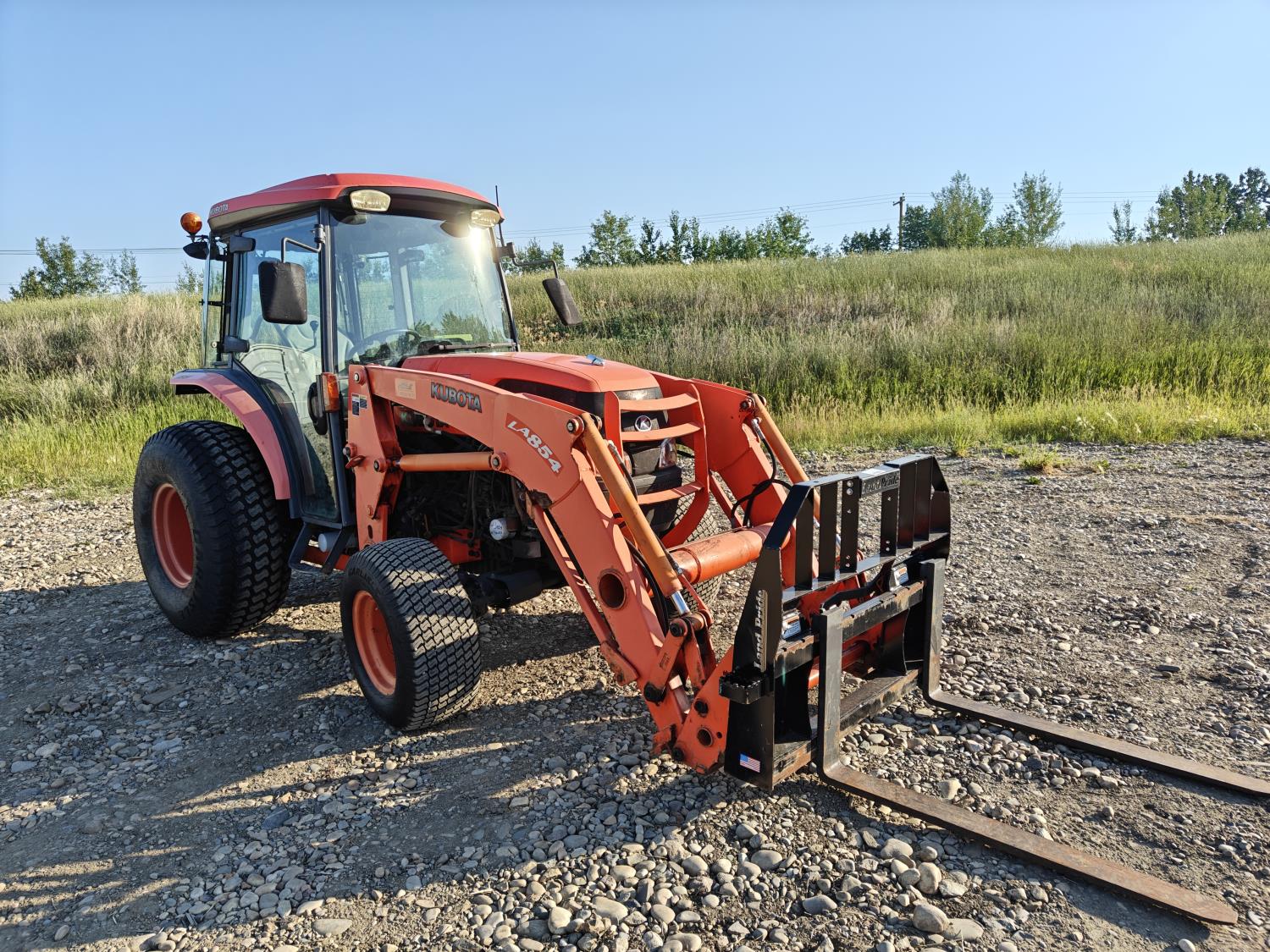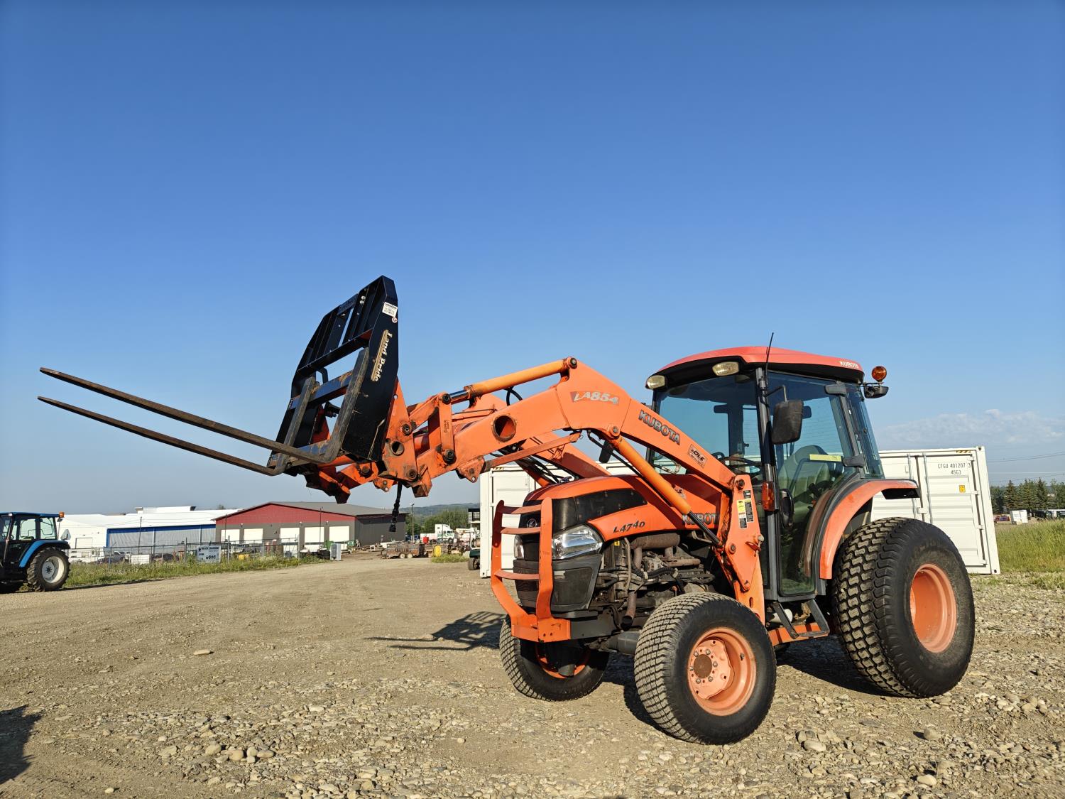Kubota LA854 loader, Q/A, 73 inch bucket, Kubota 2.4 L 4 cylinder 47 HP, diesel engine, 41 PTO HP, hydro 3 range transmission, 10 GPM hydraulic pump, cab, rear differential lock, joystick, A/C, radio, upgraded stereo, 48" Land Pride pallet forks , 540 PTO, 3 point hitch, 2 rear hydraulic outlets, 29X12.50-15 front tires, 44X18.00-20 rear tires